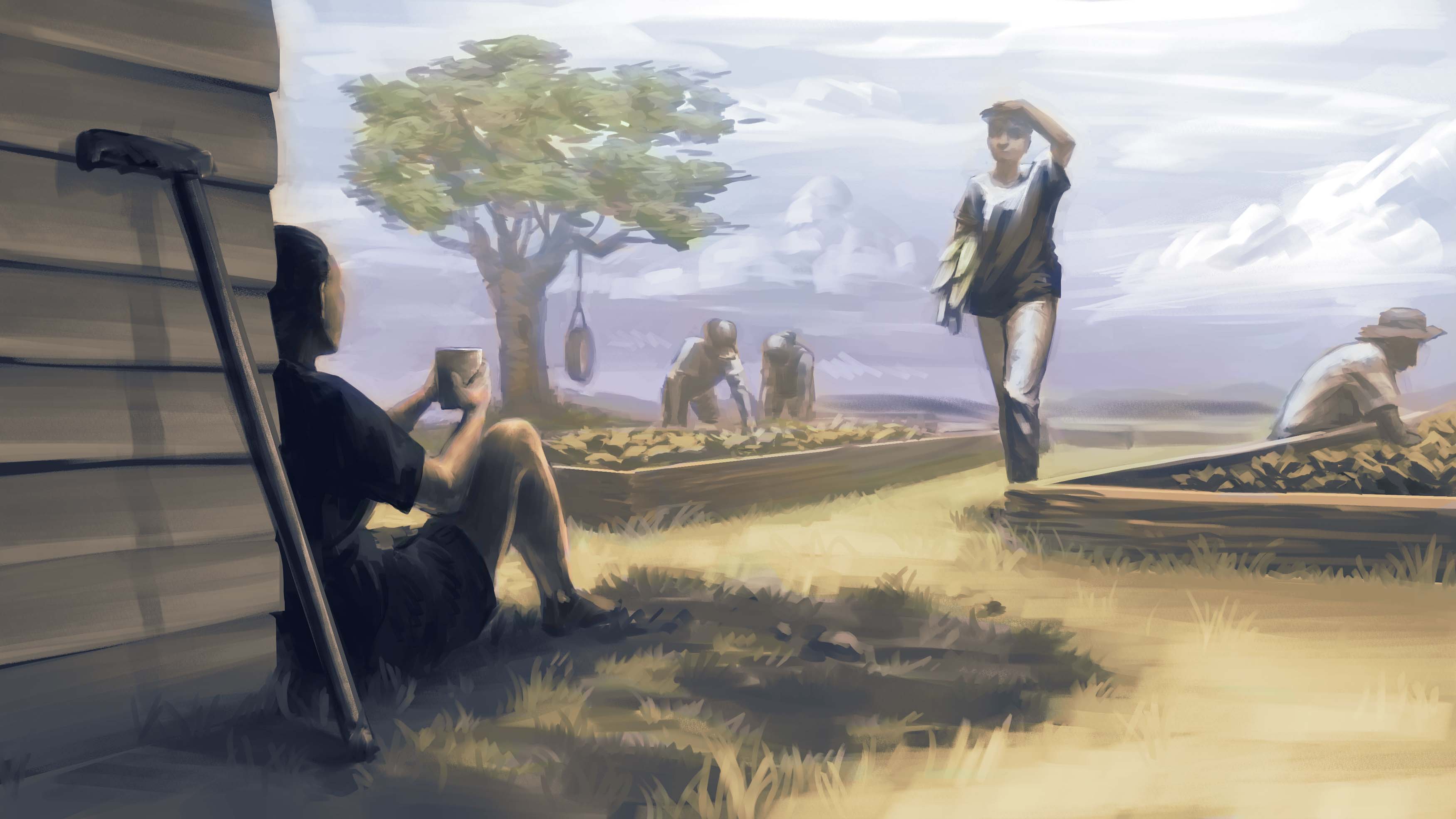 Example NPC/compound scene featuring an individual resting with a walking cane propped next to them.