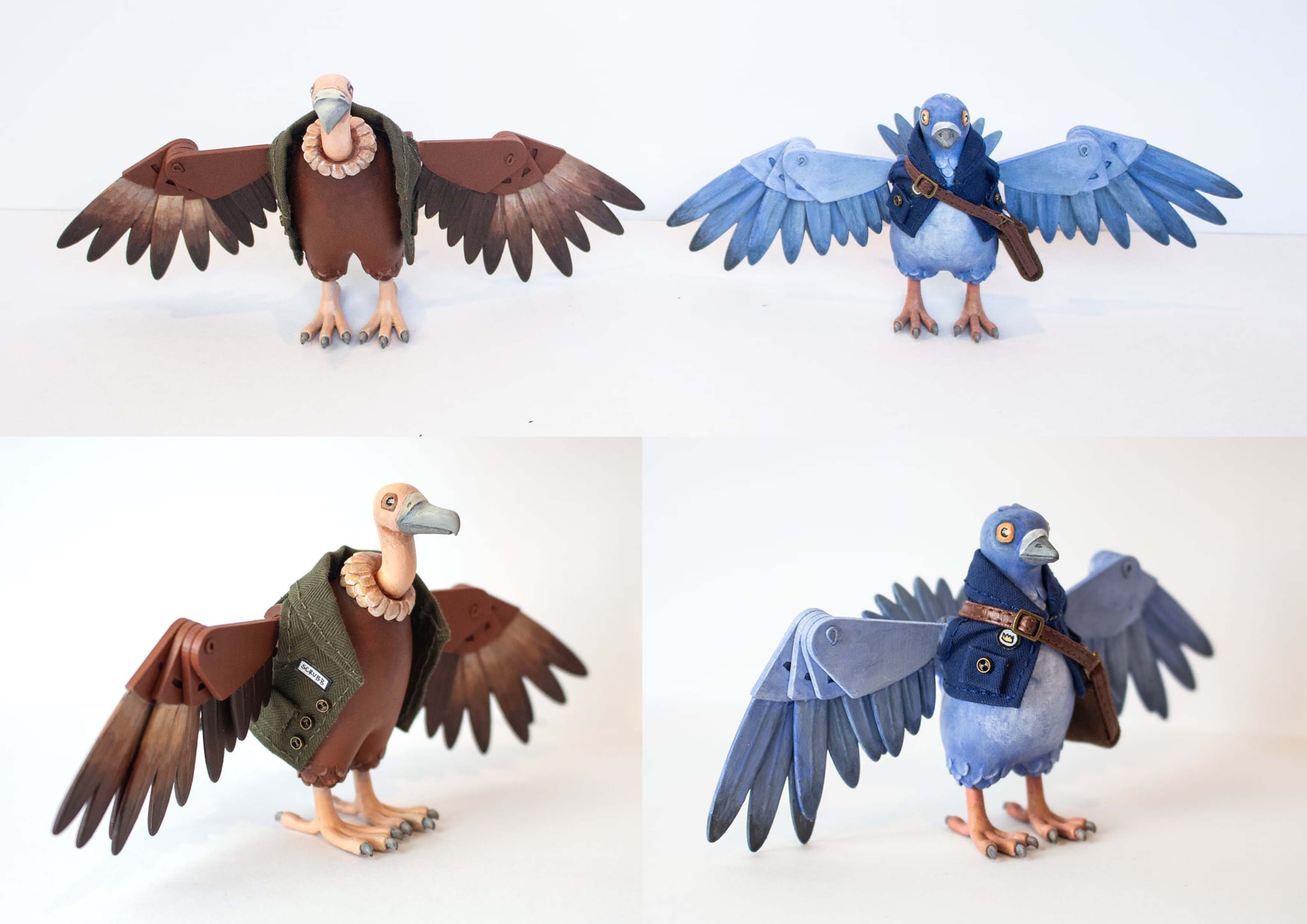 3D printed toy birds with articulated wings.