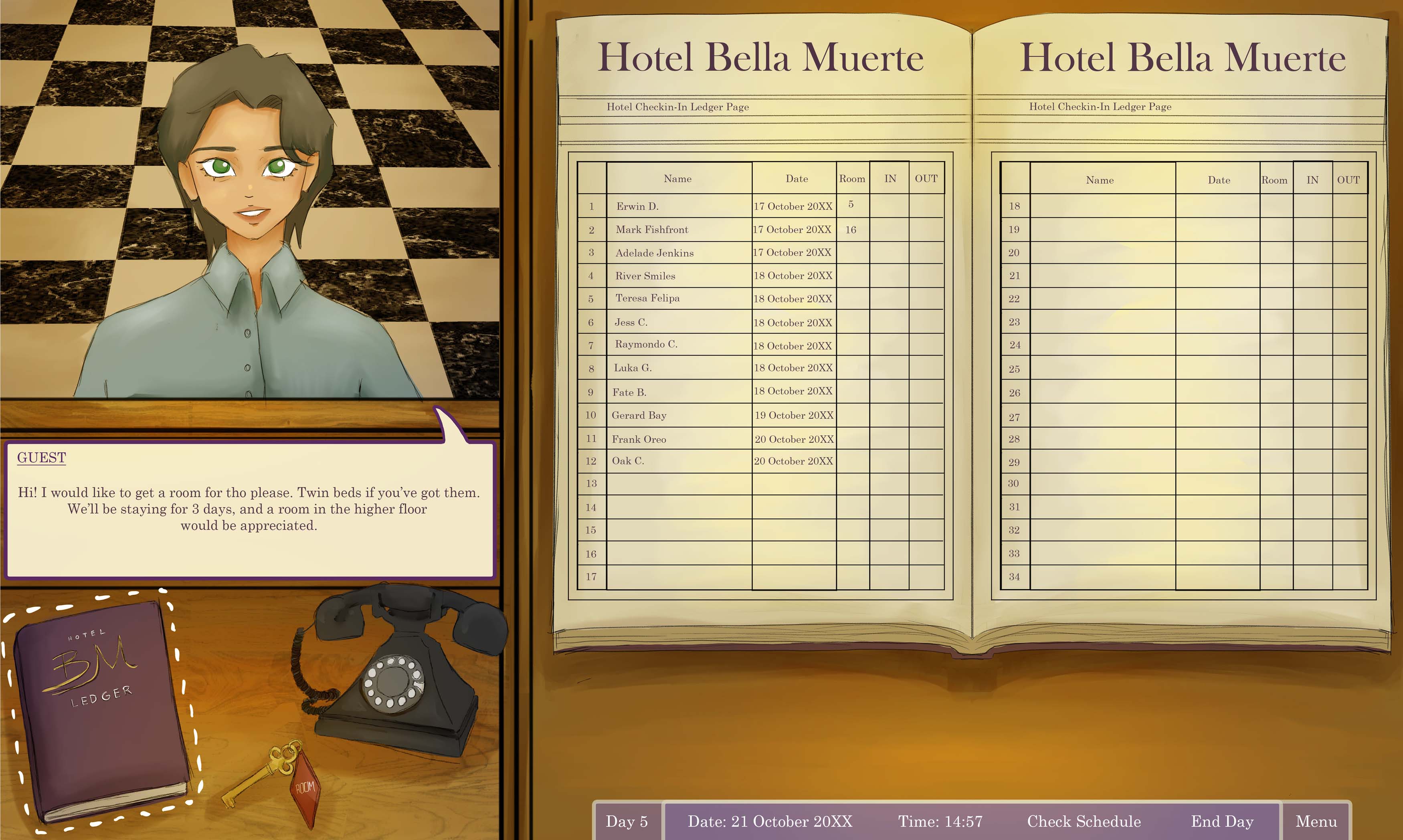 Reception mini-game, welcoming and checking in guests.