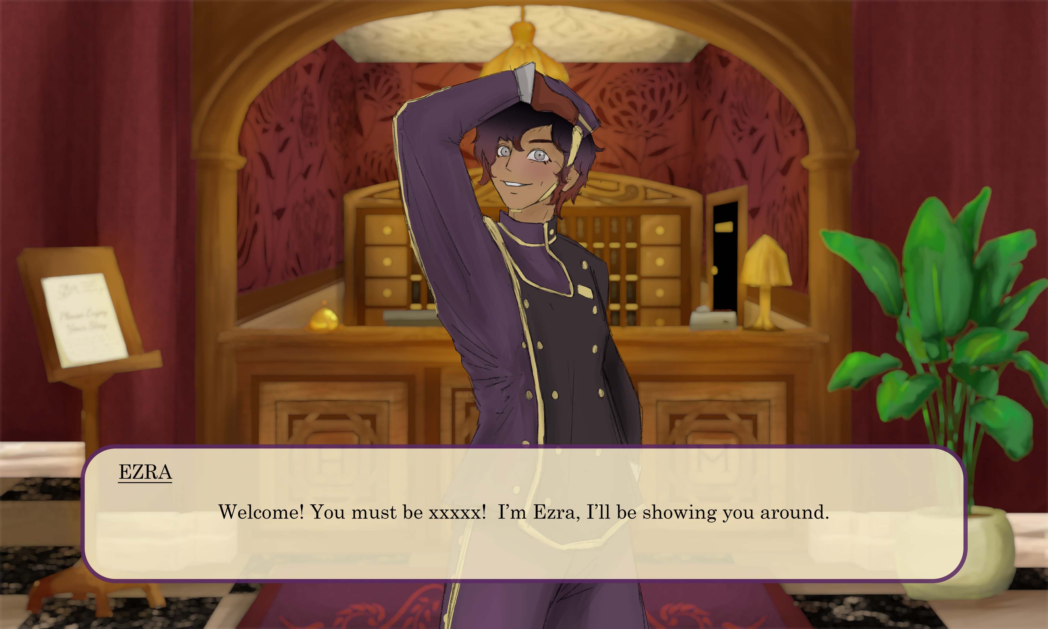 In-game dialogue featuring Ezra, the hotel’s bellboy, welcoming the player.