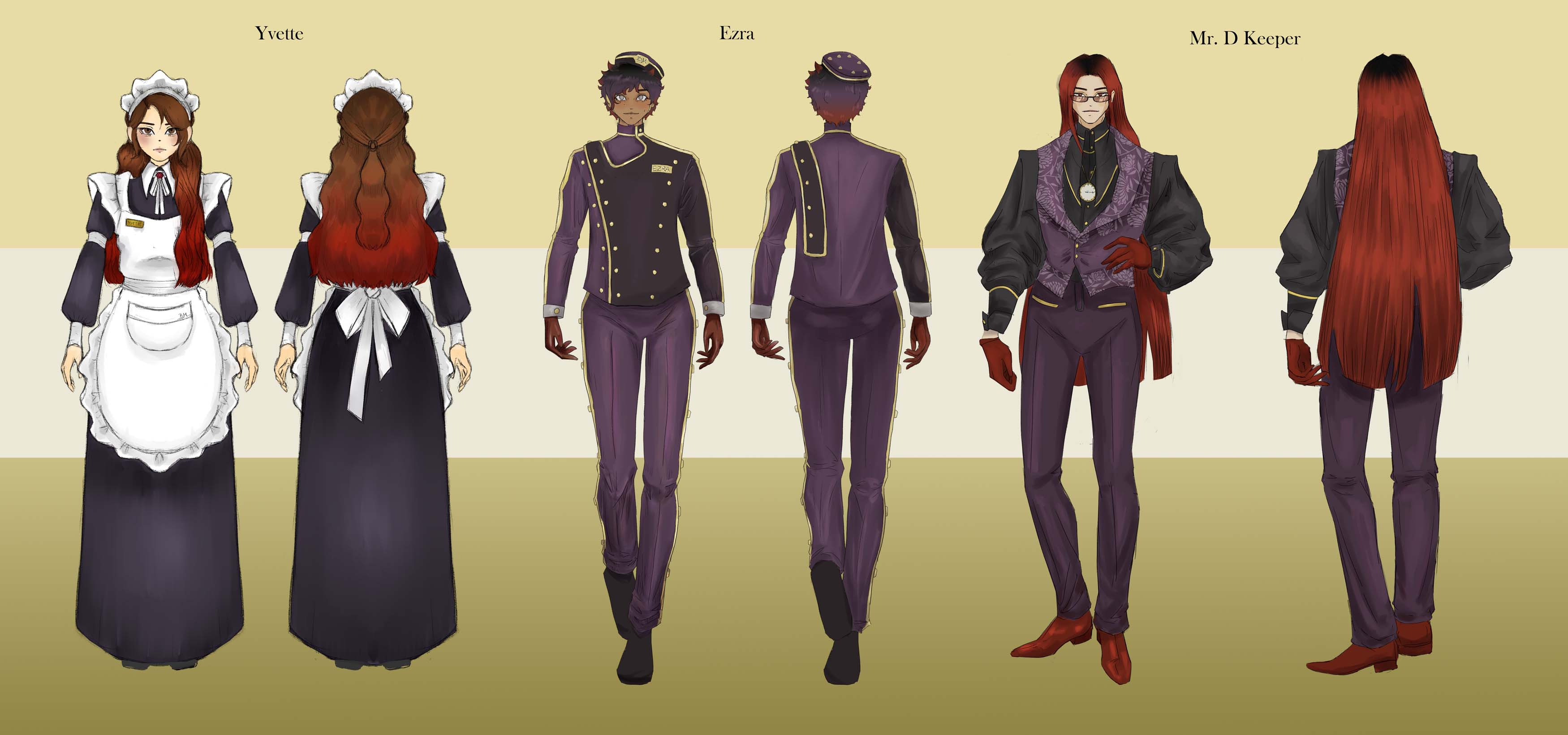 Interactable characters line up ft. Yvette (Housekeeper), Ezra (Bellboy), Mr Dahlia Keeper (Manager)
