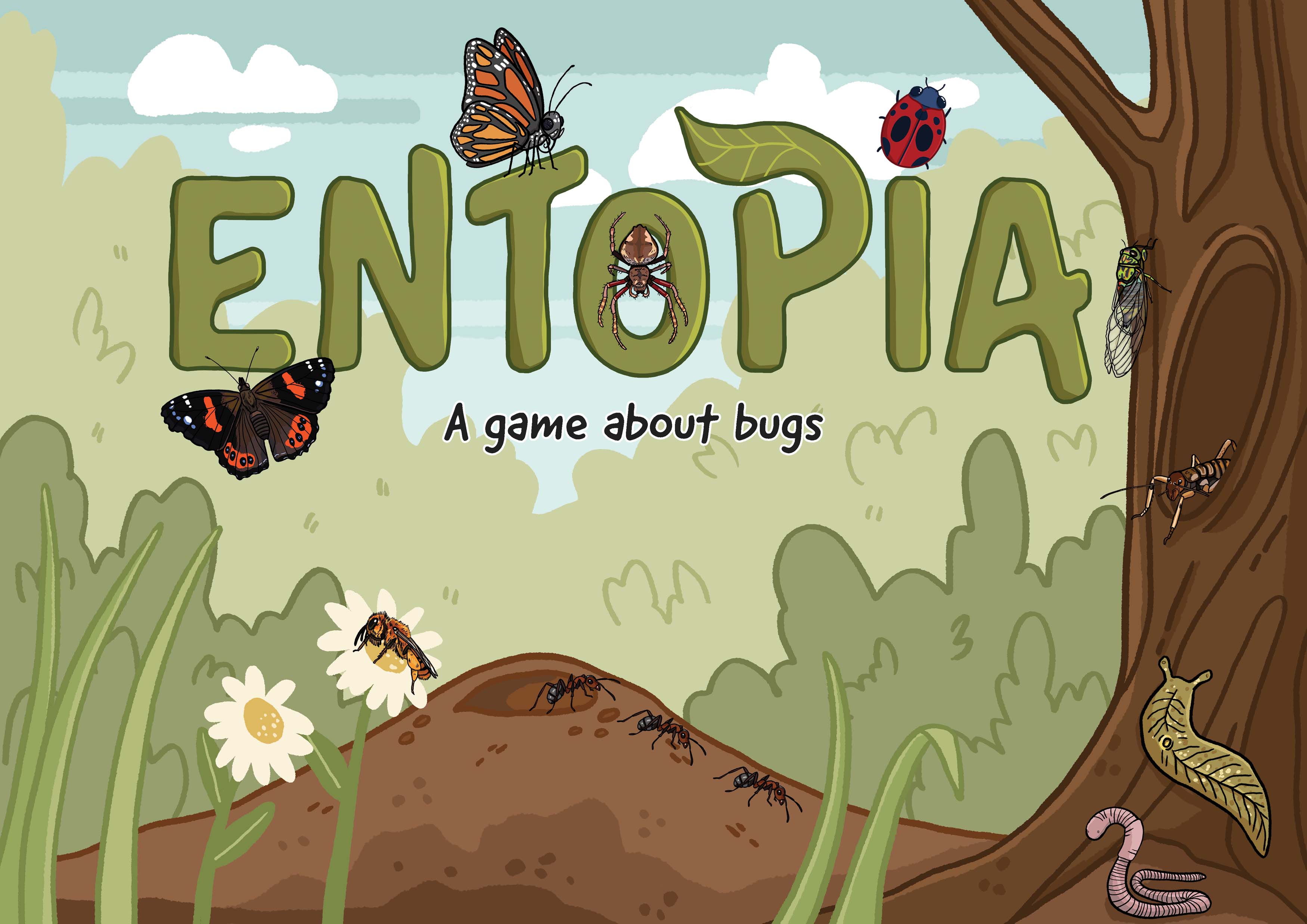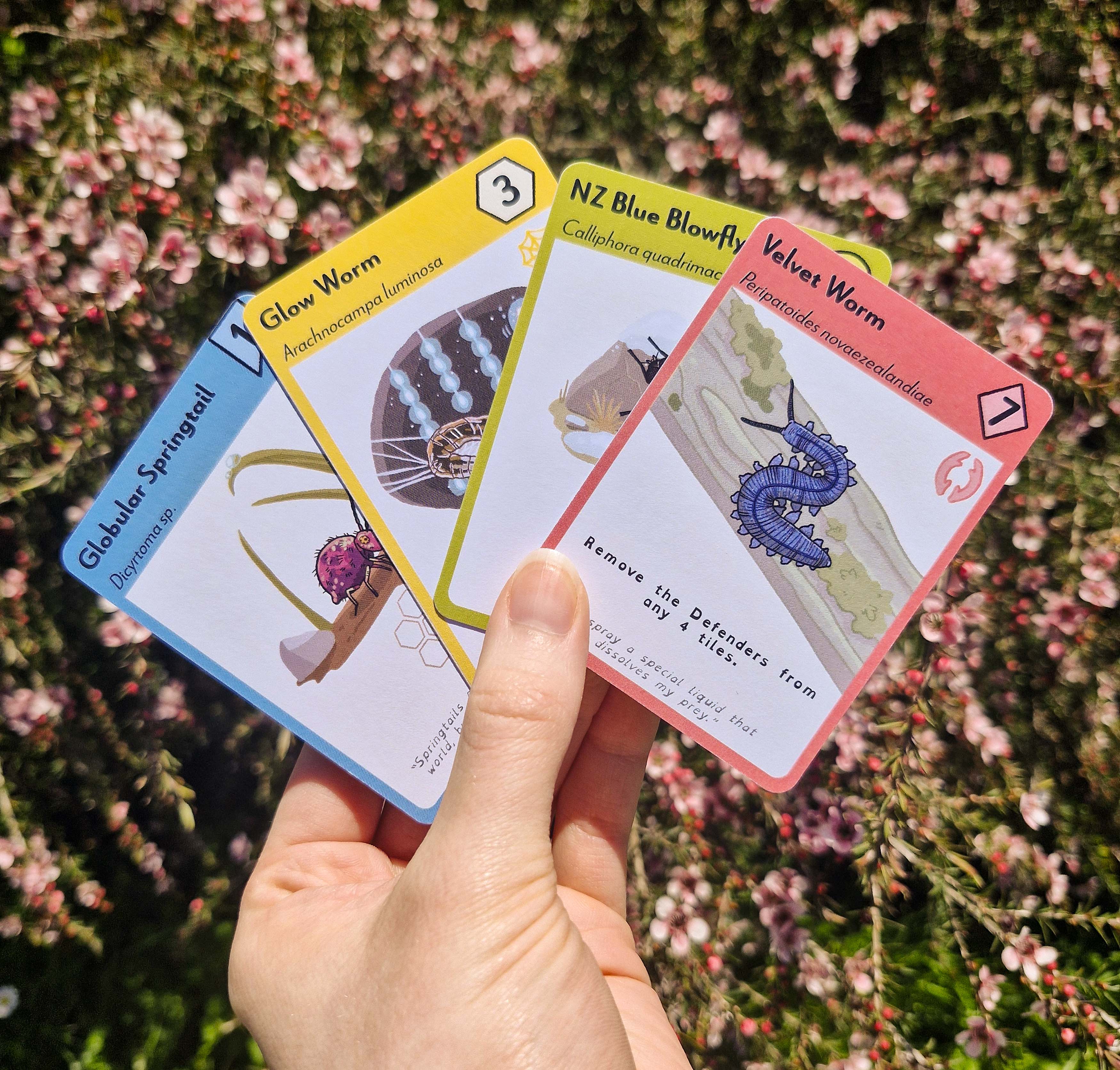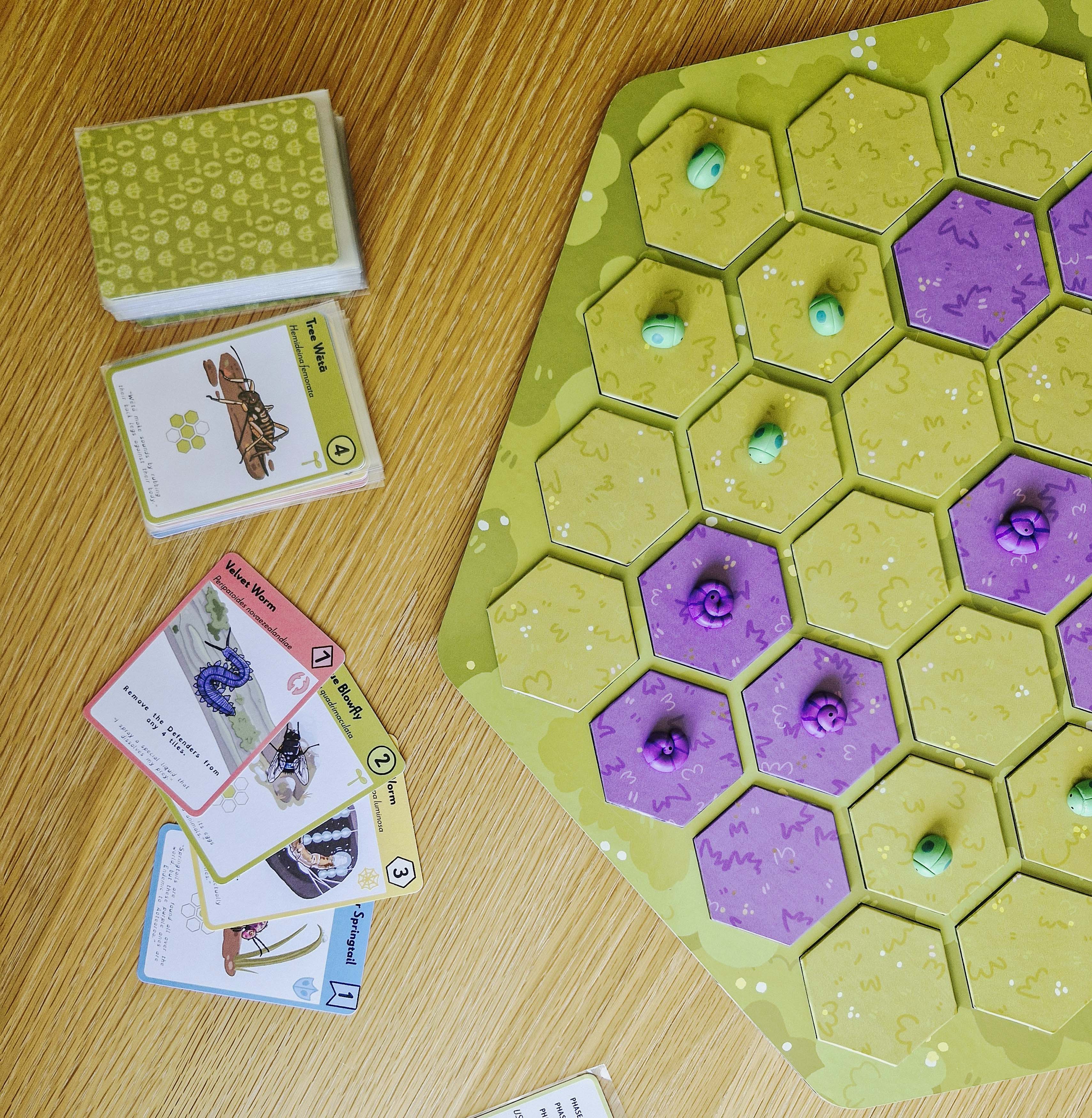 Entopia is a 2-player educational tabletop board game for ages 8+ that introduces people to the invertebrates of Aotearoa. Players take turns playing cards, flipping tiles on the board and deploying bug meeples to protect their land. Card actions are based on the real world behaviours of bugs and with 120 unique invertebrate facts, players are able to learn about our overlooked invertebrate life in a fun interactive way.