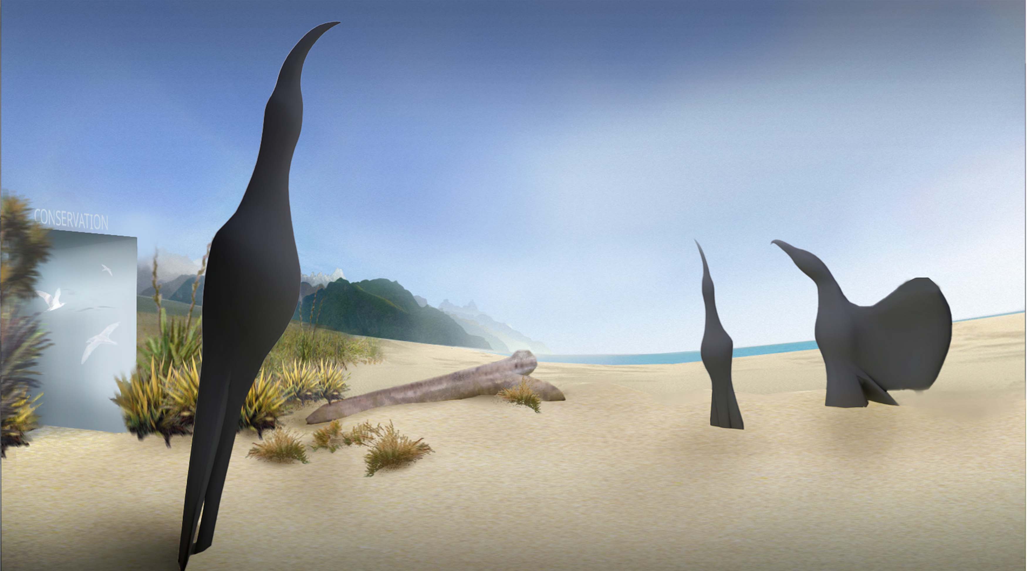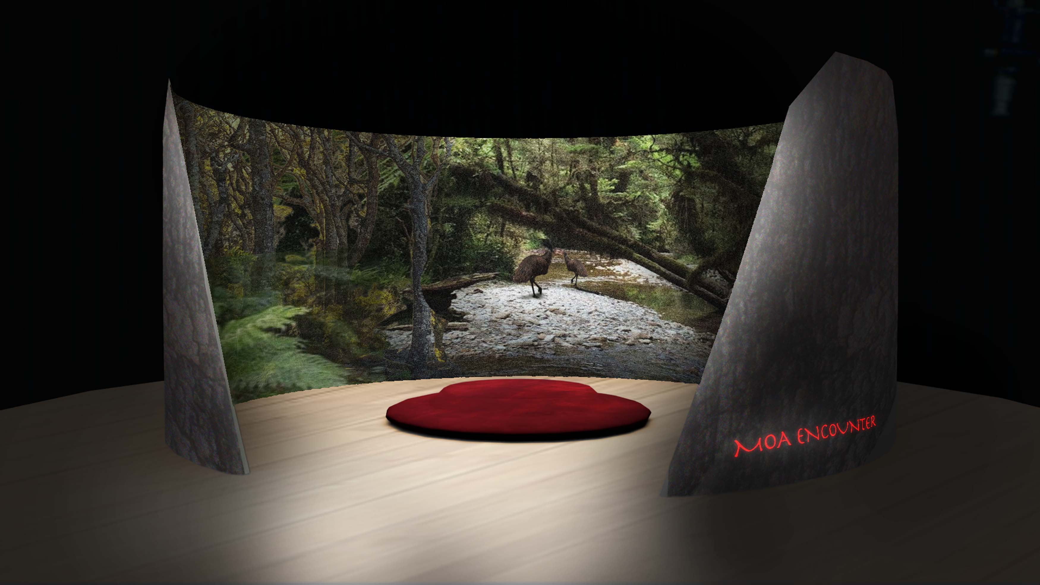 Moa encounter, through an accessible curved screen, observe the life like animation of a Moa in the wild with an immersive soundscape and comfortable seating.