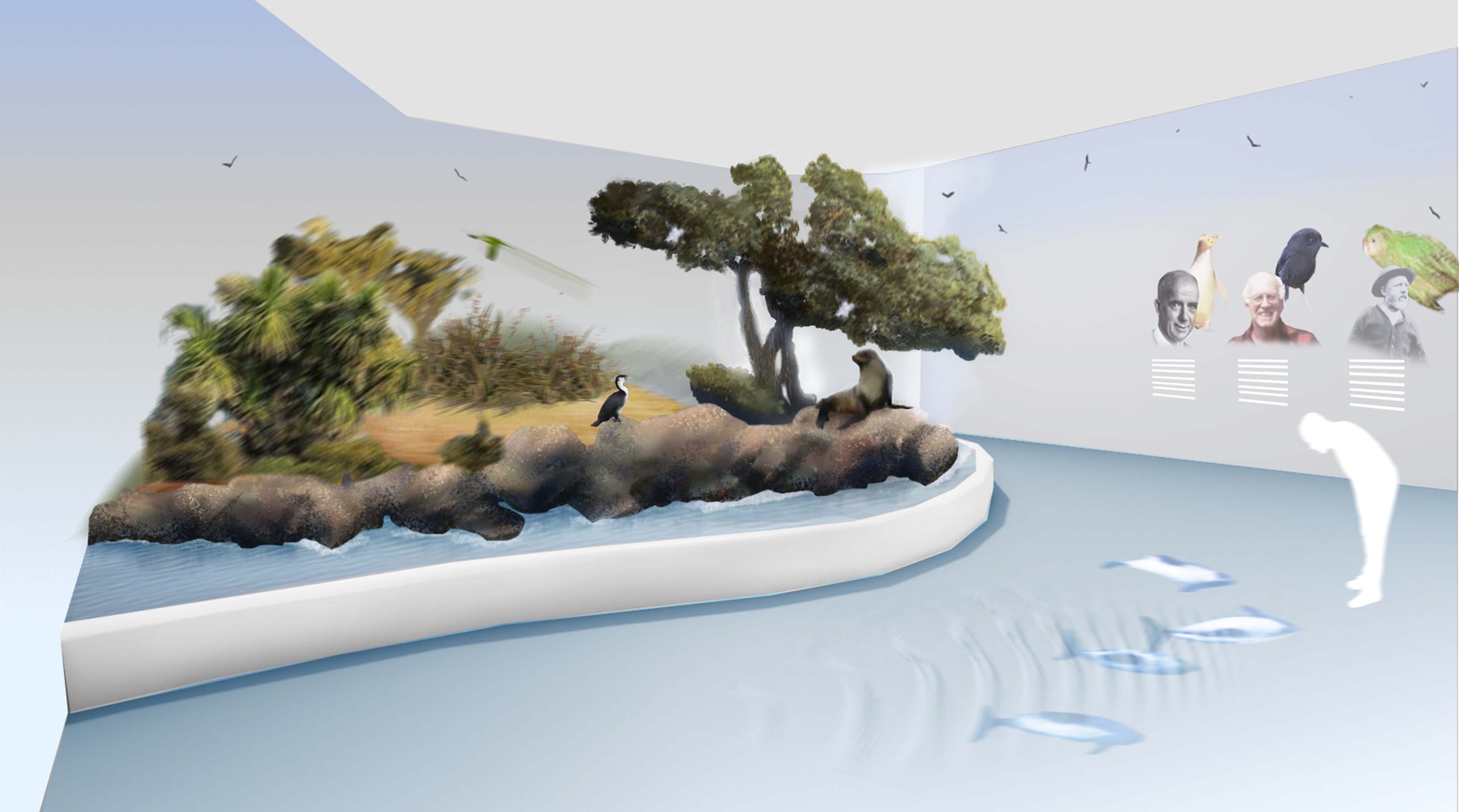 Conservation, an exhibit room that teaches about conservation, looking at offshore islands using life like models, projection mapped environments and animals.