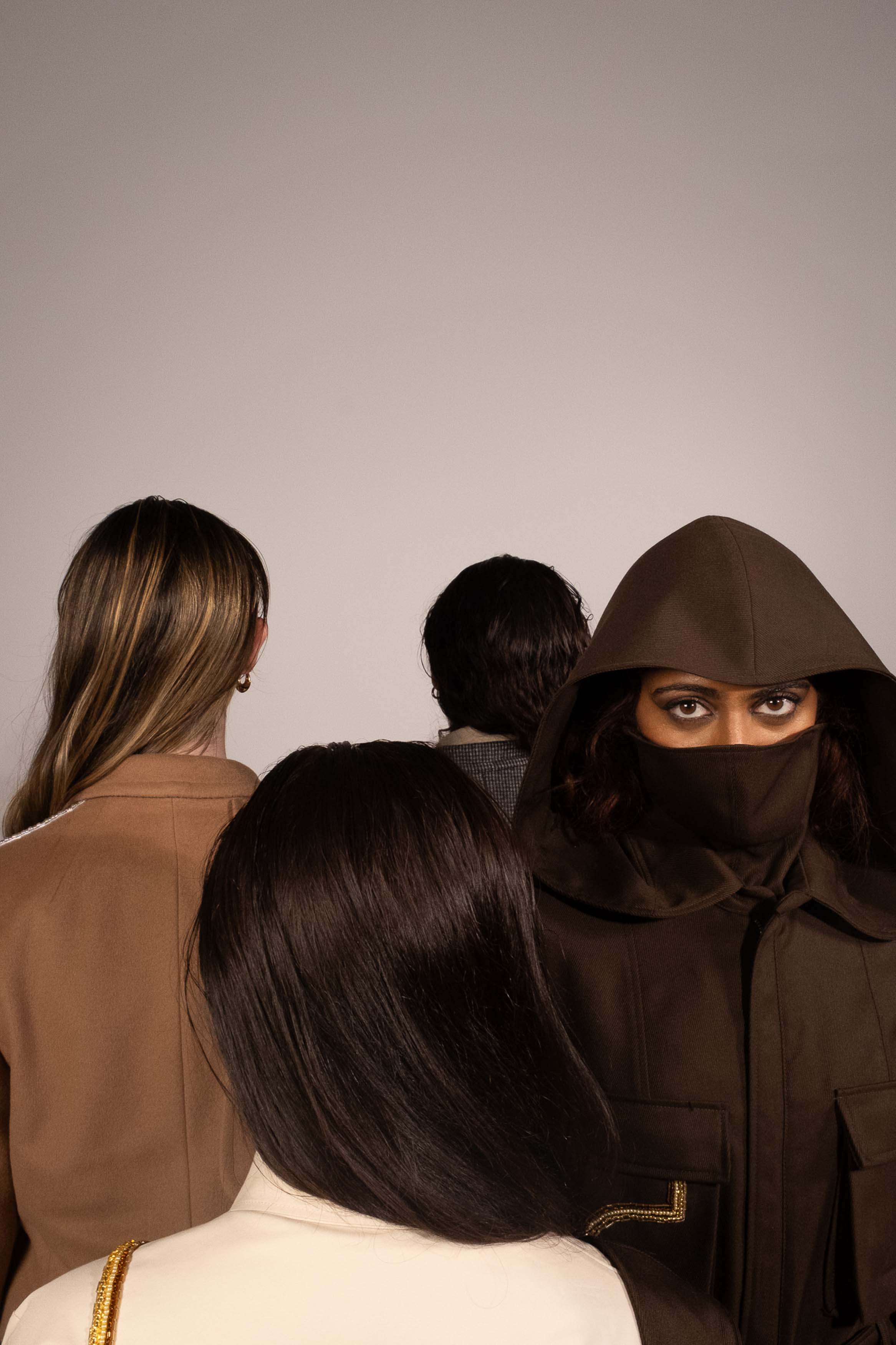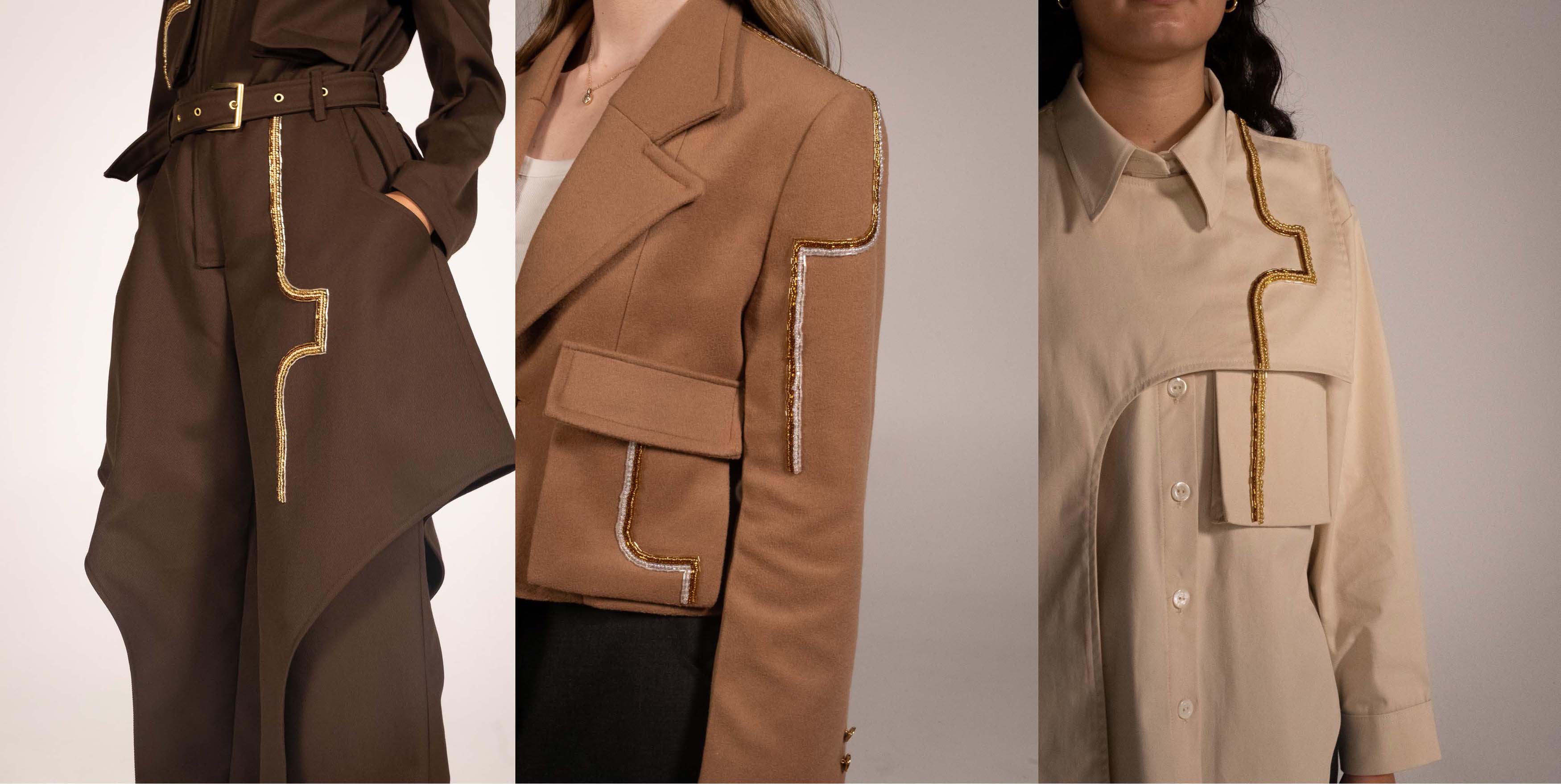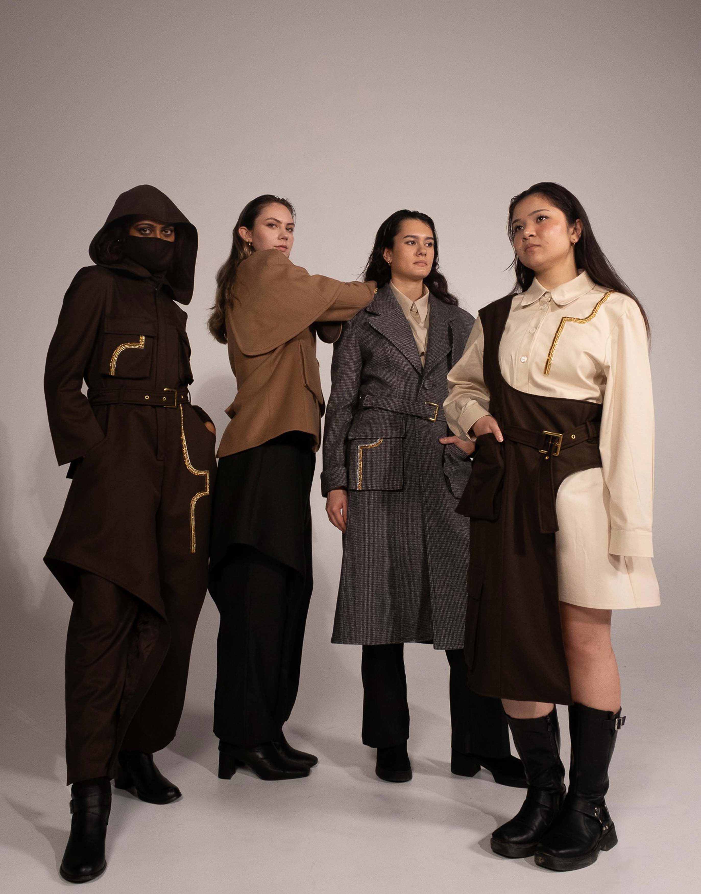 This collection draws attention to the similarities between dystopian novels and reality. By analysing the rise of extremism in political groups and the dangerous implication of when they gain power, I was able to connect dystopian novels to real life examples. Through the use of tailoring, layered features and bead embroidery, I was able to fashion a collection that captures the imagined experience of living under a dystopian fascist regime.