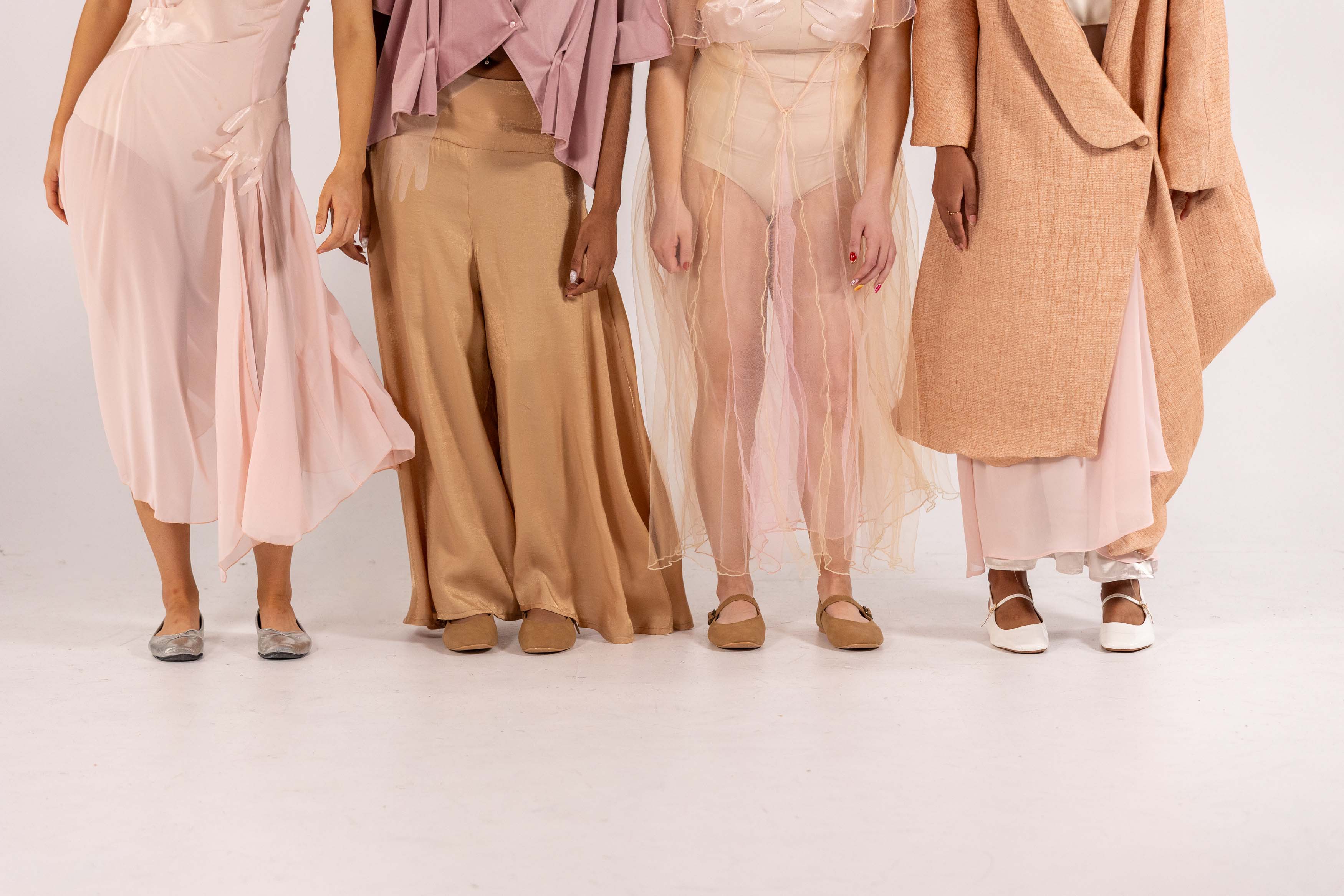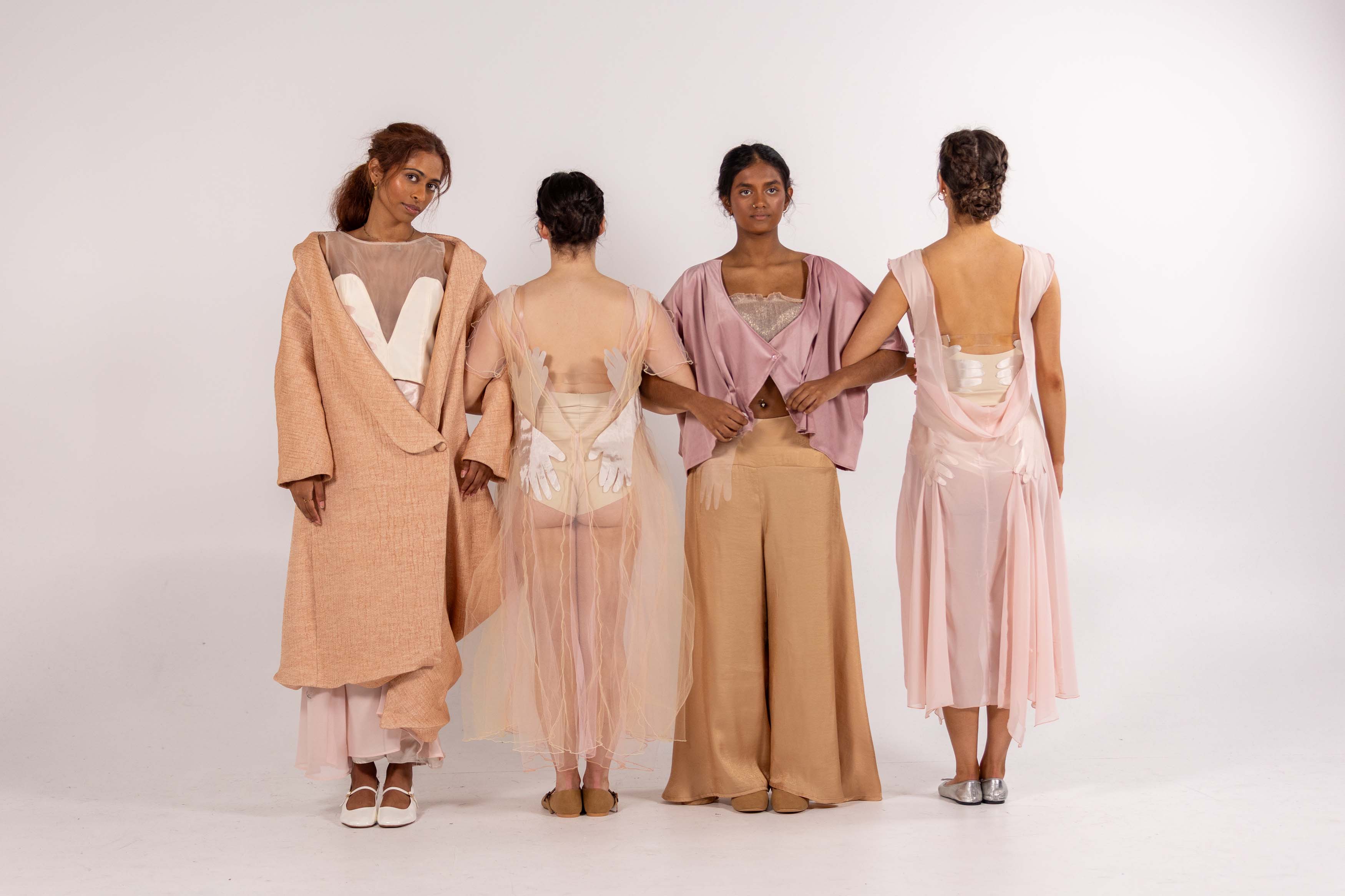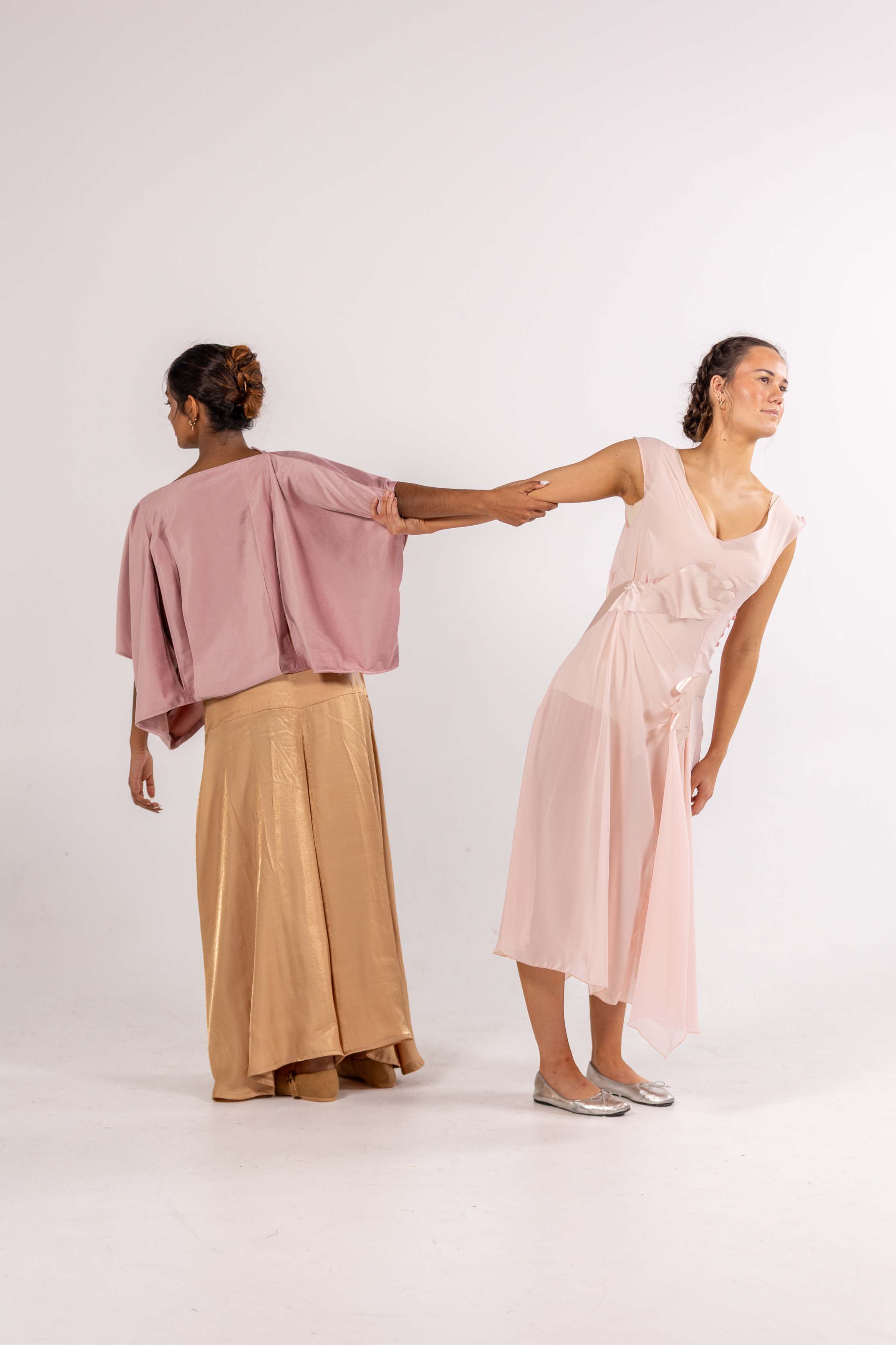 Inspired by the partnerships formed through collaborative dance, Intimate Connections explores the intimacy formed in this context and the connection that forms between bodies. By interpreting somatic design practice this collection focuses on the first person experience of the clothing and explores ways to emulate the feelings attached to such deep connections. Intimate Connections explores the fine line between selling elegance and sensuality within the performance world.