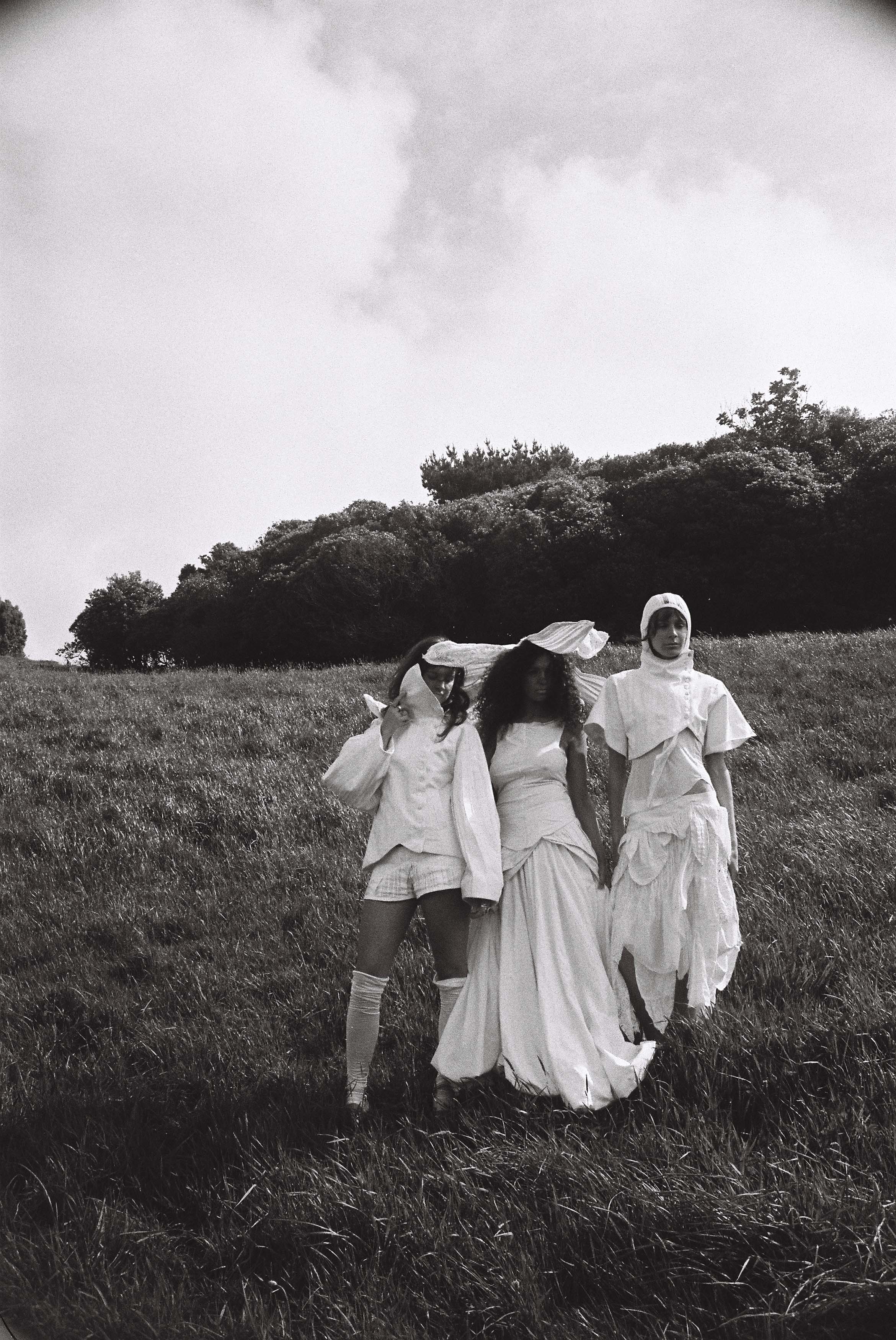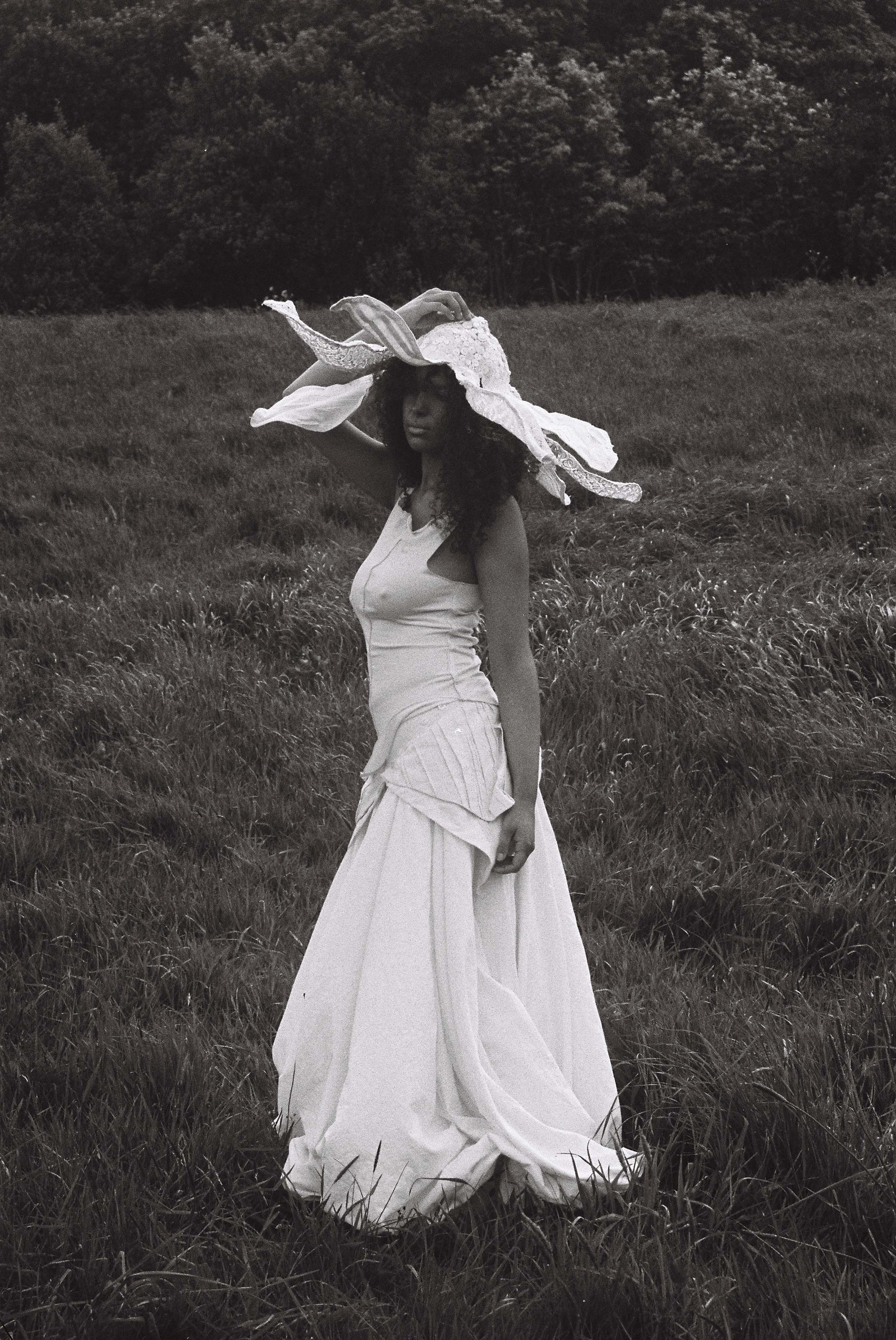 This collection explores fragility and femininity through new materialism and sustainable practices by embodying the individuality and forms of wildflowers. The transience of beauty is expressed through each look being a stage of transformation in the blooming cycle. I saw op-shops as my garden, upcycling nearly all second-hand fabrics. Choosing an all-white palette, I reclaimed femininity as a source of strength and resilience instead of white flowers’ symbolism of purity.