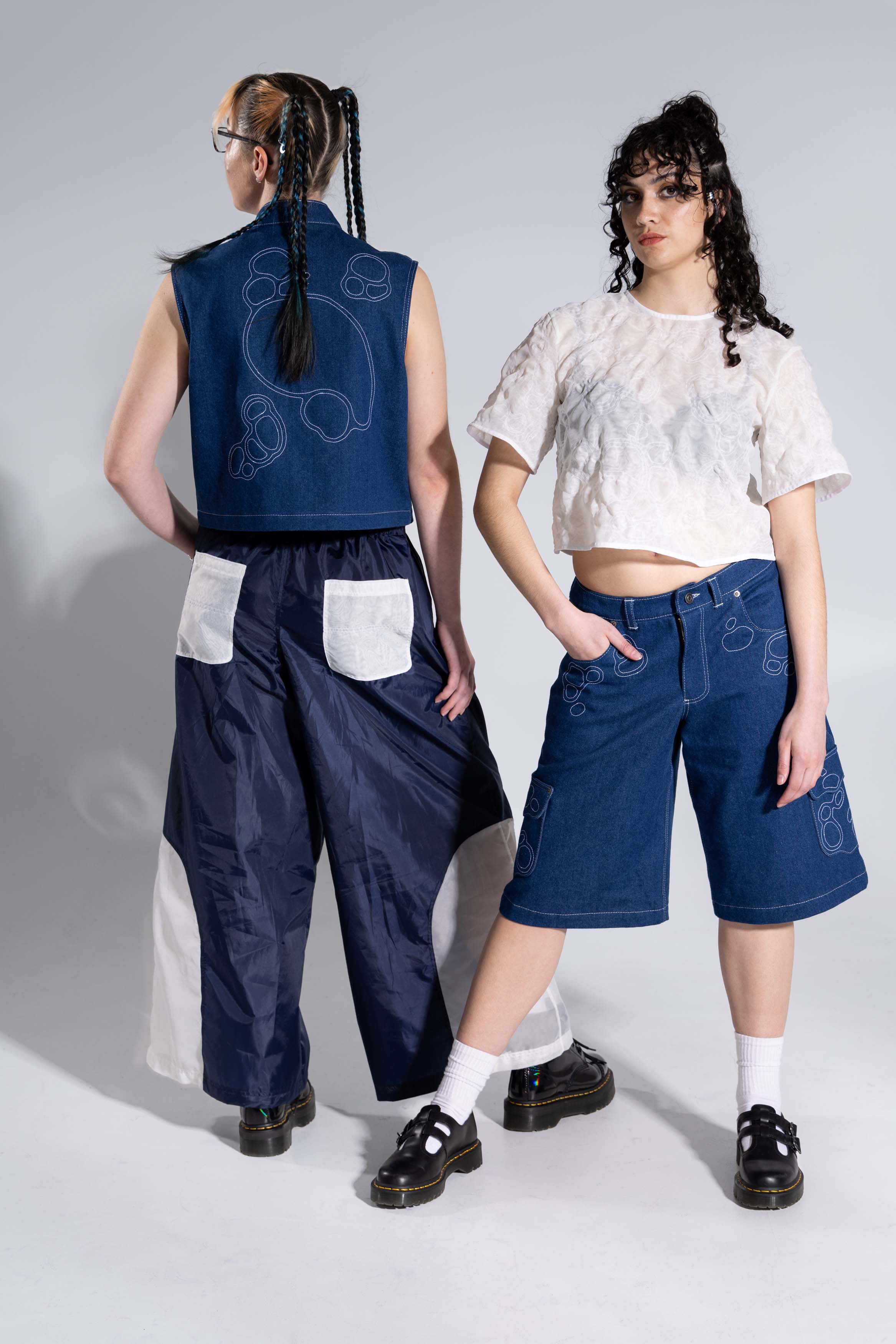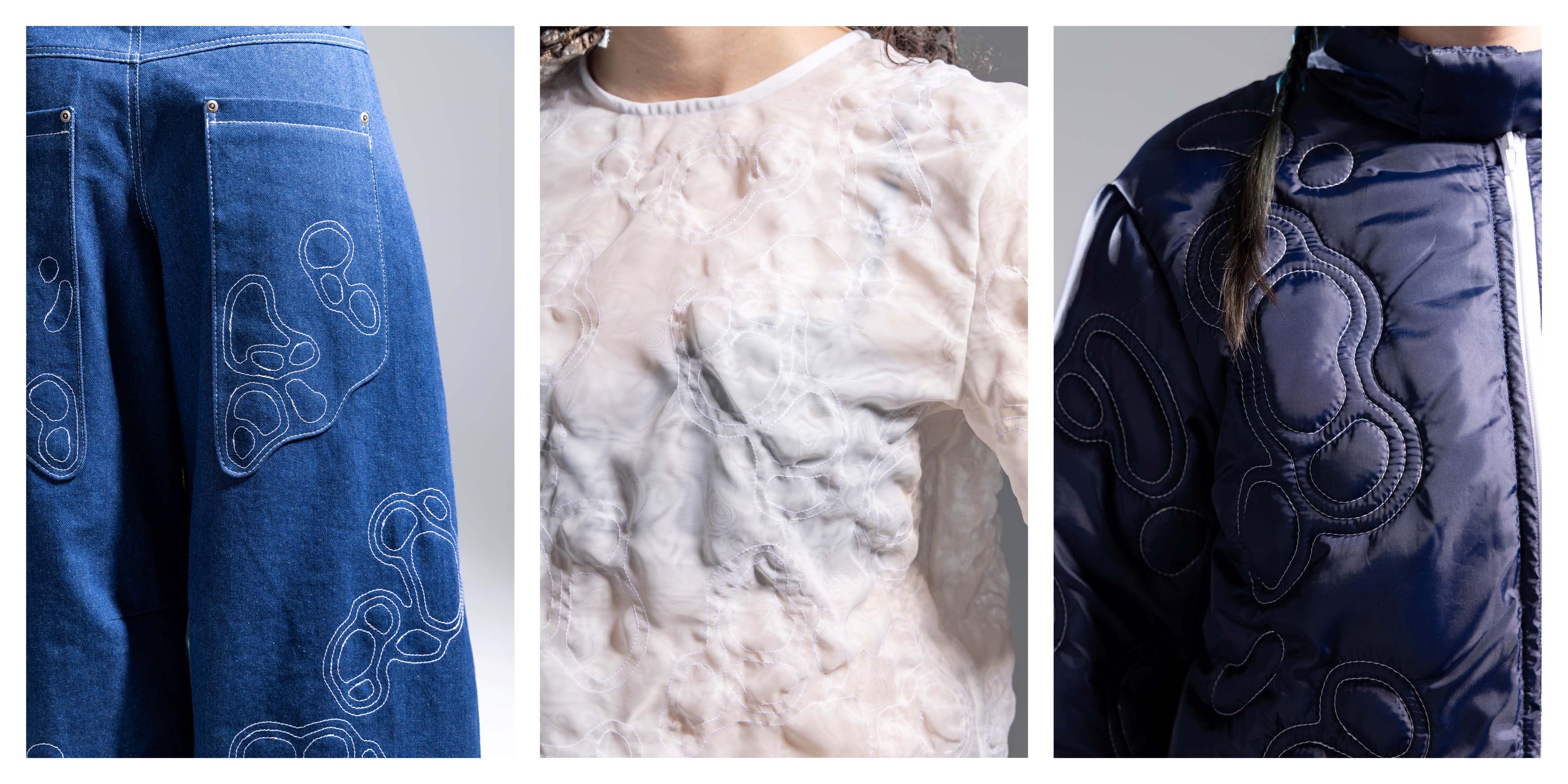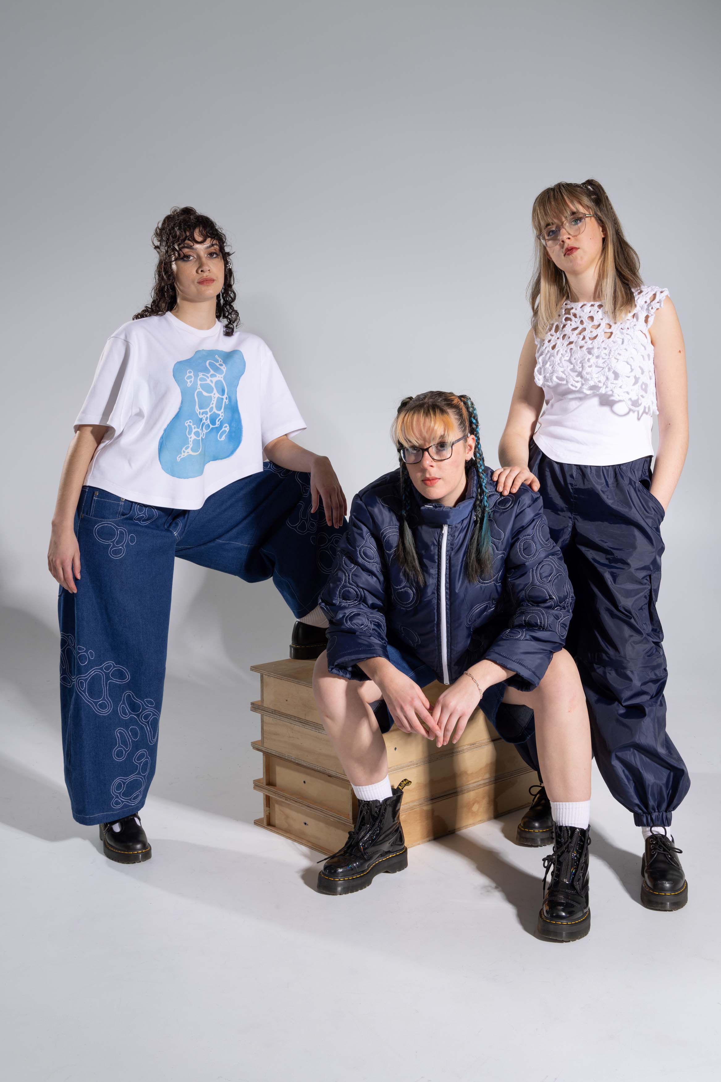 Urban Tide is a 90s streetwear inspired fashion collection that explores the benefits of blue space e.g. oceans, rivers and canals in urban environments. The seafoam motifs bring a sense of presence to the wearer, creating a moment of calm in an otherwise overwhelming city life. Utilitarian and industrial details are turned organic through freeform embroidery and crochet, transforming a rigid structure into a garment that flows with nature.