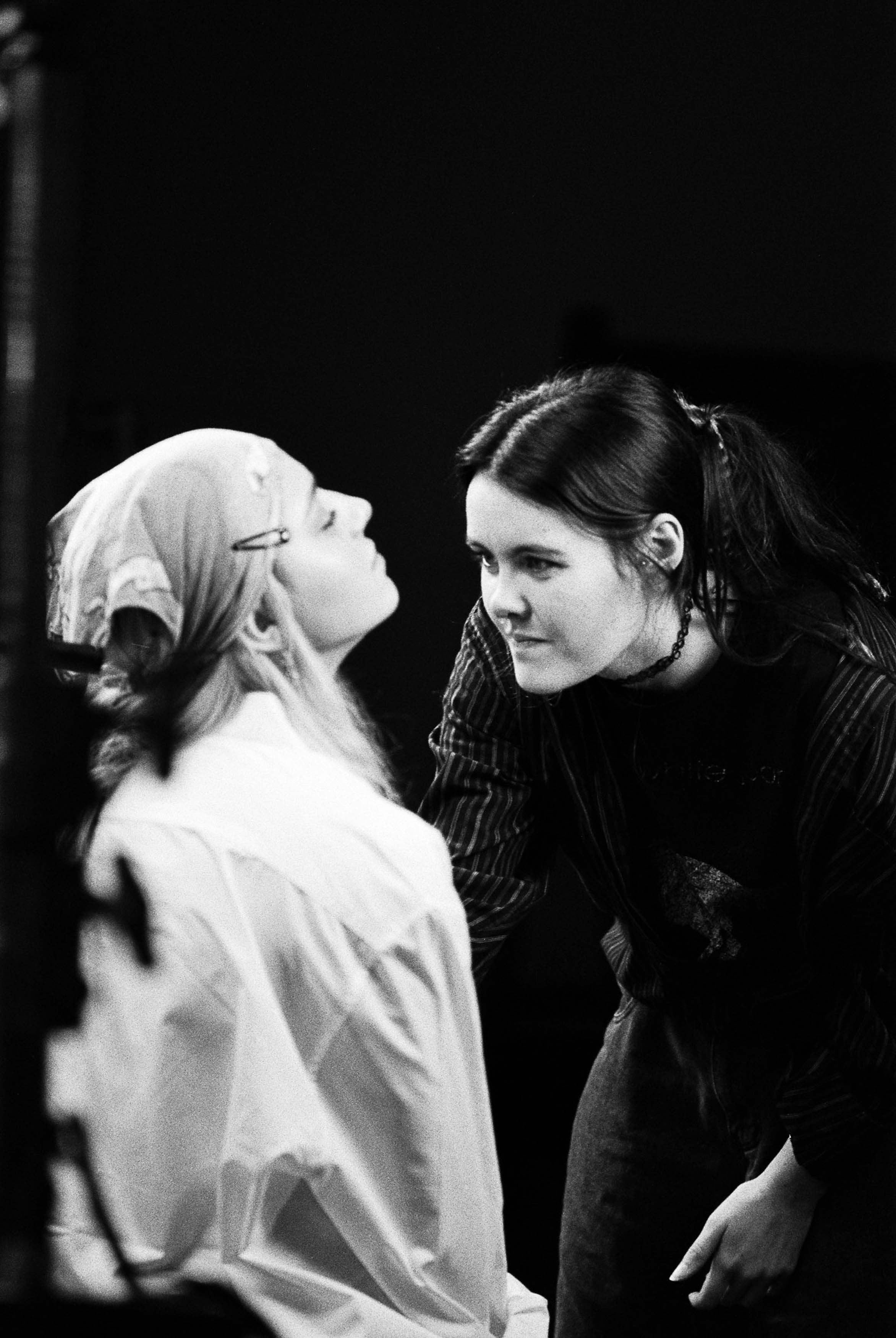 Director (Maggie Shore) fixing actor's (Ilona Simpson) SFX makeup on set of Critique.