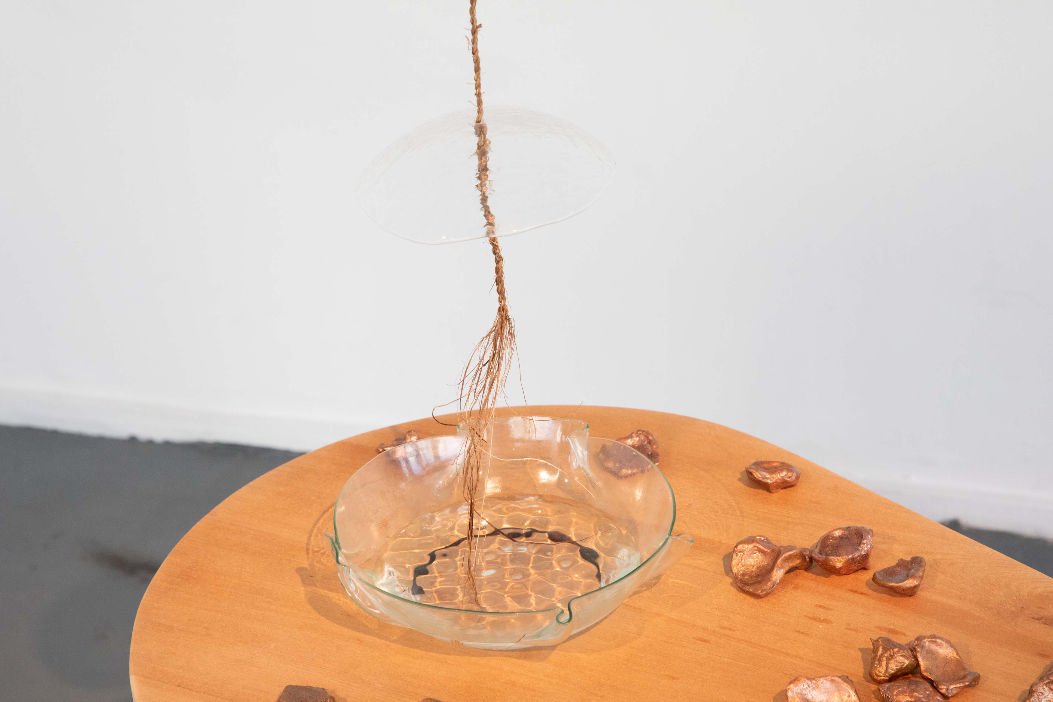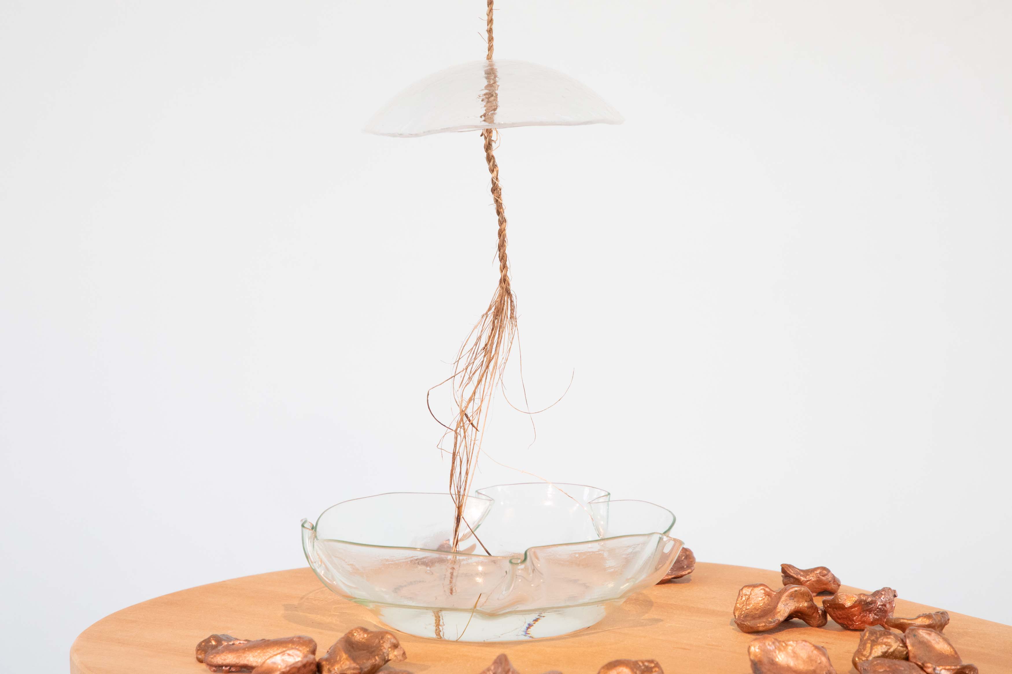 Together, We dance. 2025 casted glass, Tī Kōuka fibre, copper castings, sound recordings.