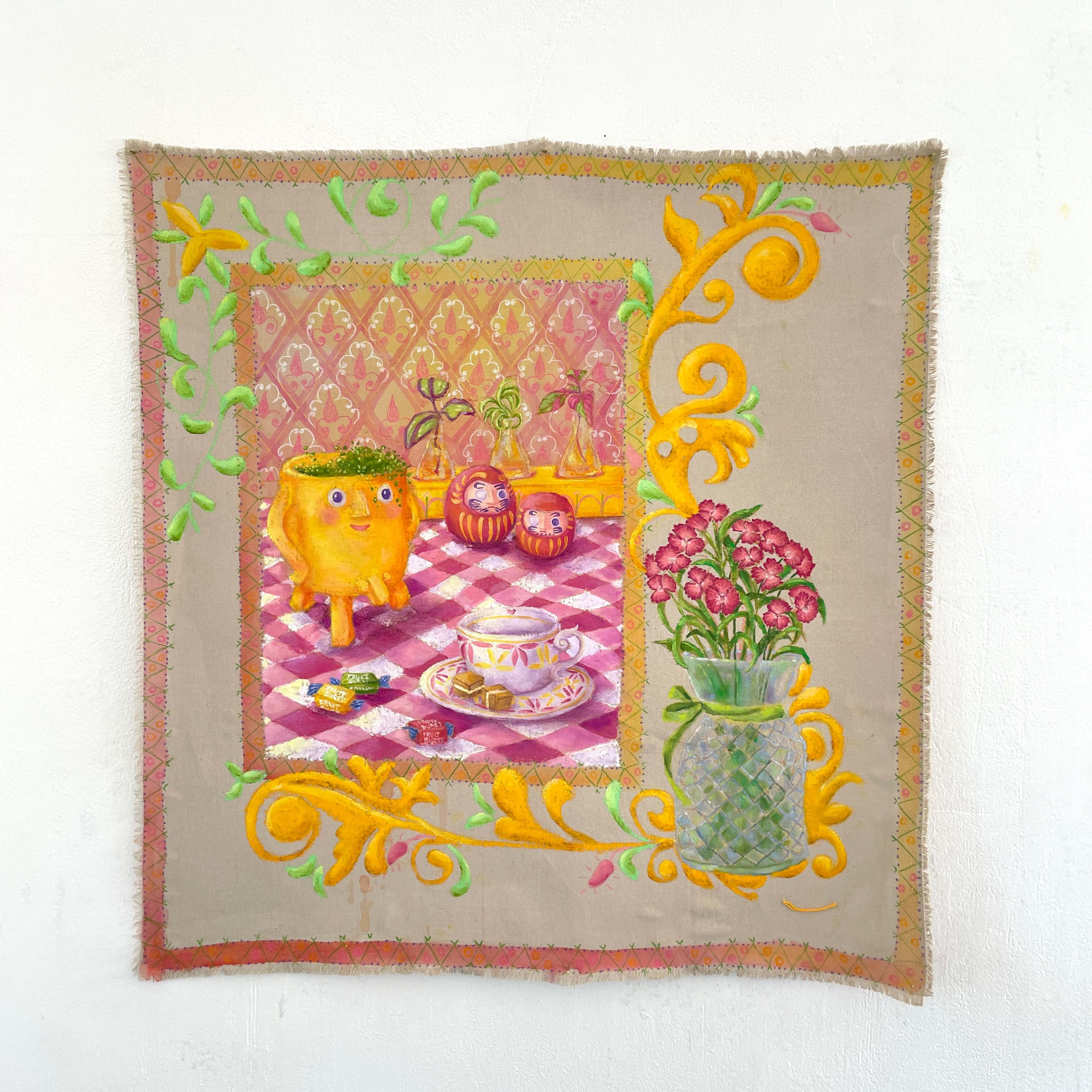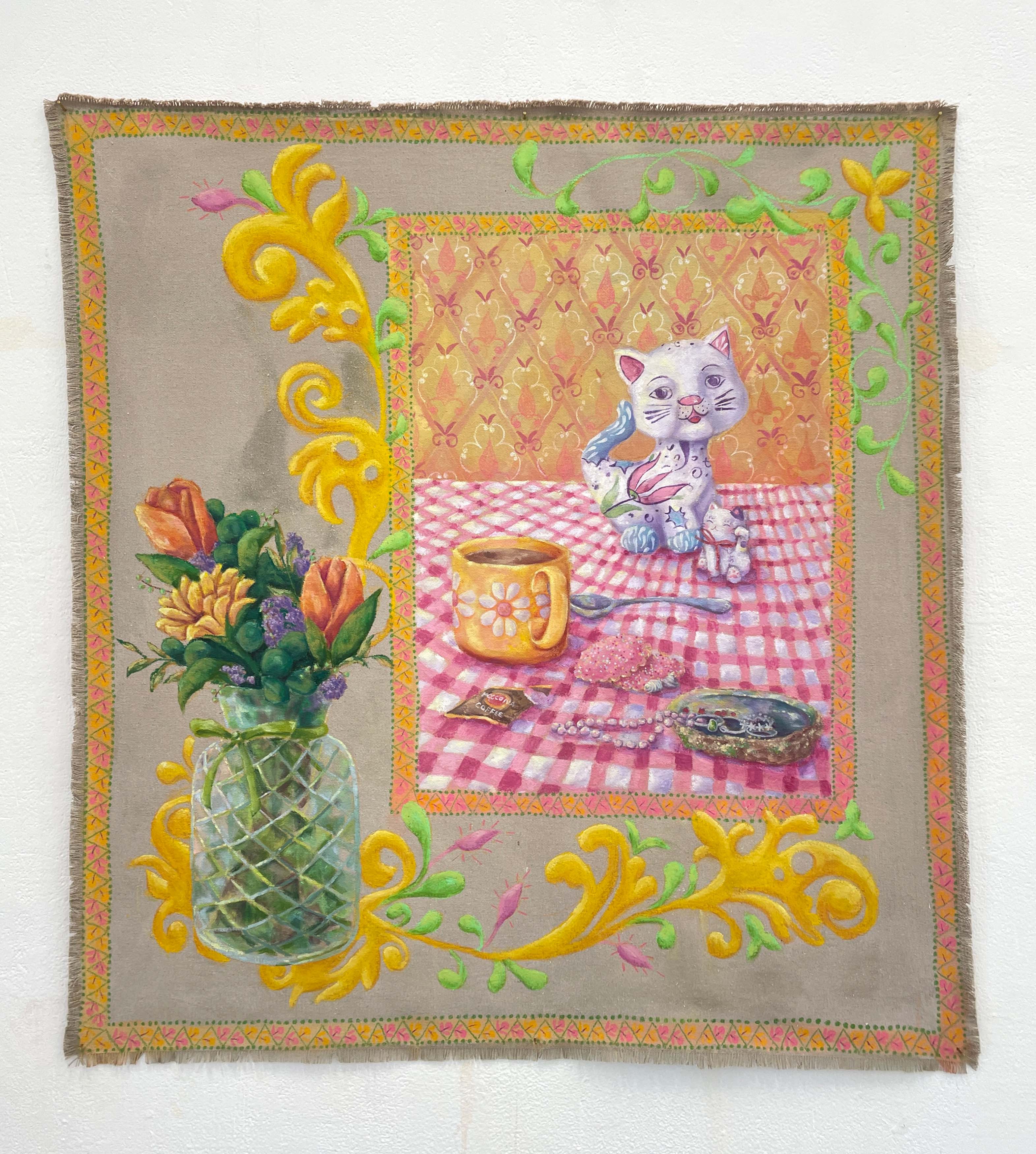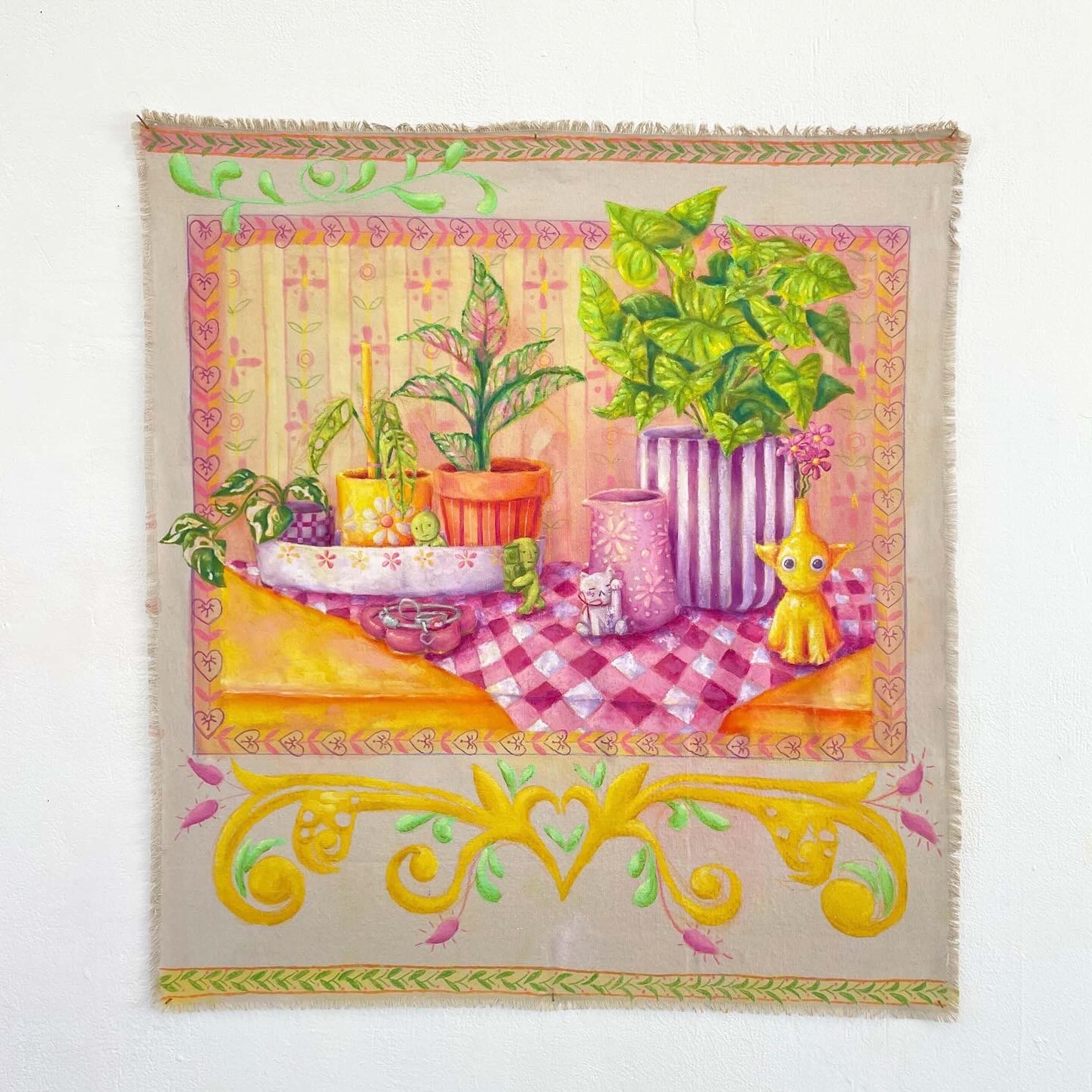 My work reimagines the home in my own world filled with colour and pattern. Drawing on my connections with family and friends, these painted interiors are filled with sentimental items, overwhelmed with pattern and visual interest. By using pattern and cross-stitch iconography, I explore the intersection of painting and craft, and the contested role of women within these art historical canons.