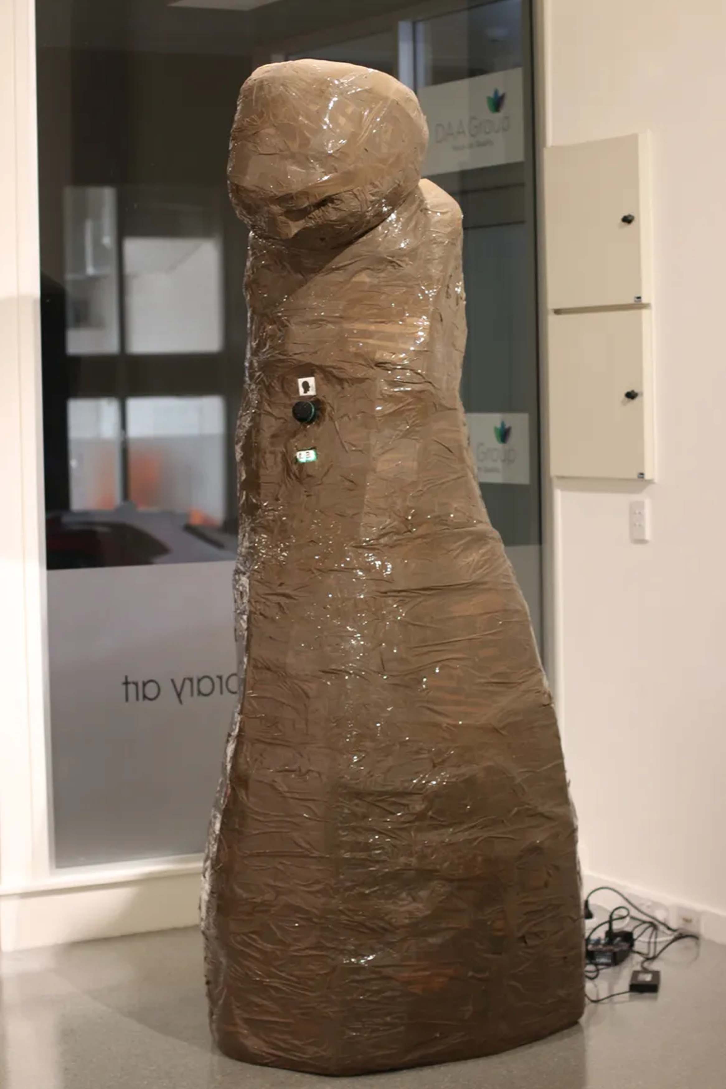 "The Amorphous Shame". Cardboard, human, tape, laptop, Max 9, bluetooth speaker, keyboard, microphone, mixer, audio jacks.