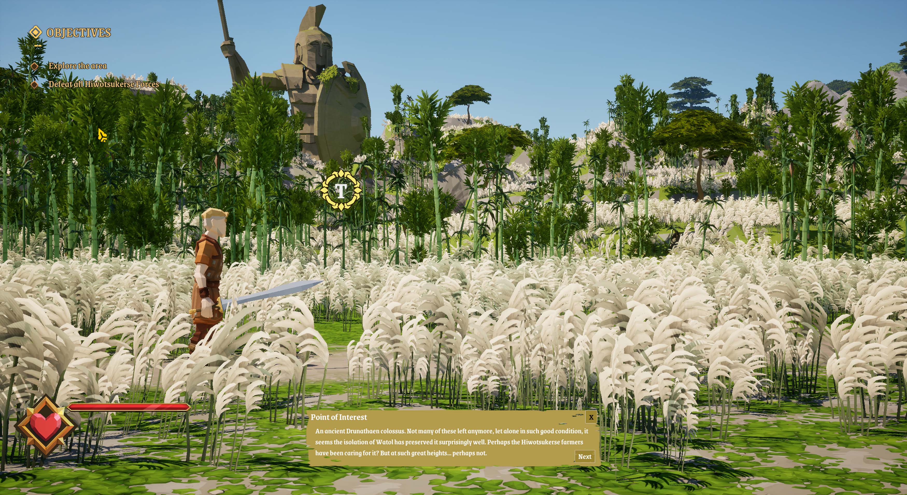 Roljar pauses before an ancient Drunathaen colossus, its overgrown form looming above him at a “Point of Interest” somewhere within the rolling fields of Watol.