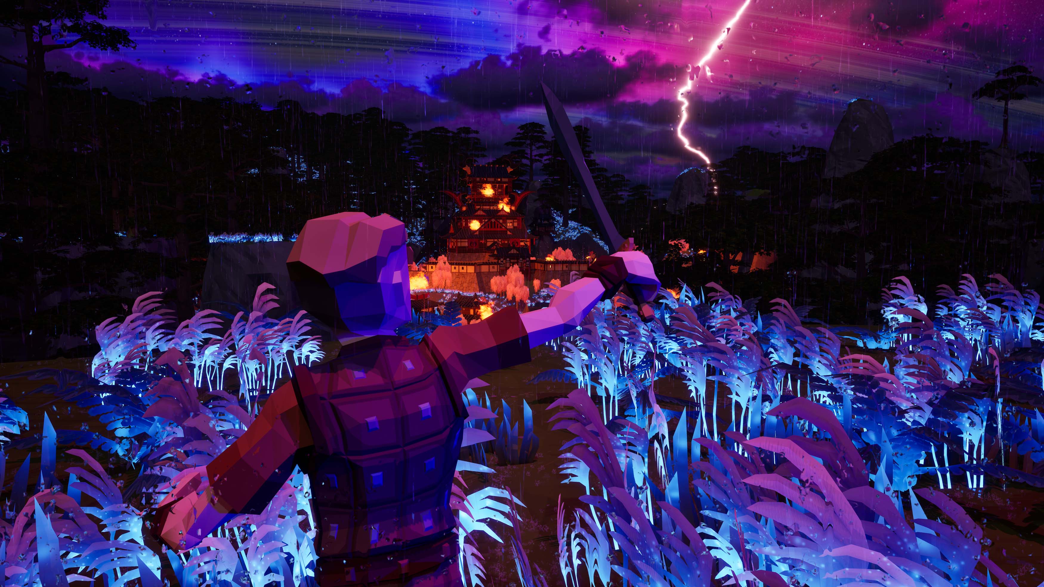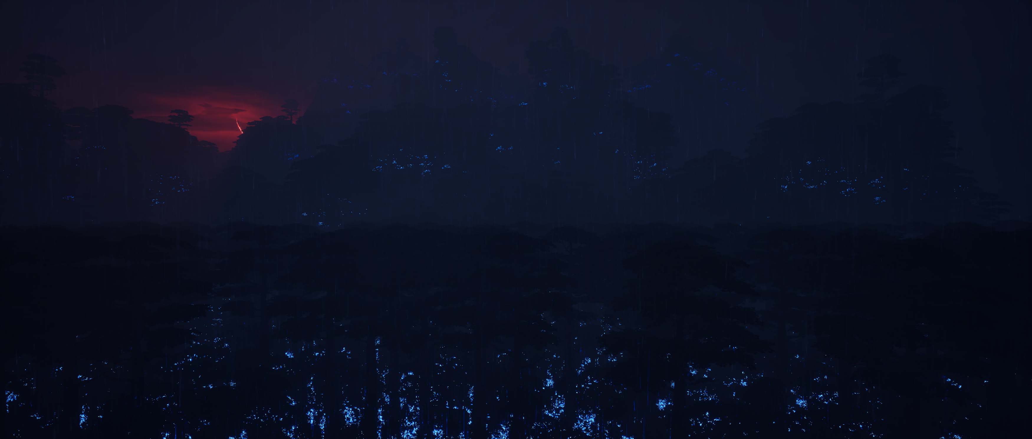 Bioluminescent flora glow beneath Patriam’s crimson lightning as storms rage through the mountainous rainforests of Watol, painting the night in fleeting scarlet hues.
