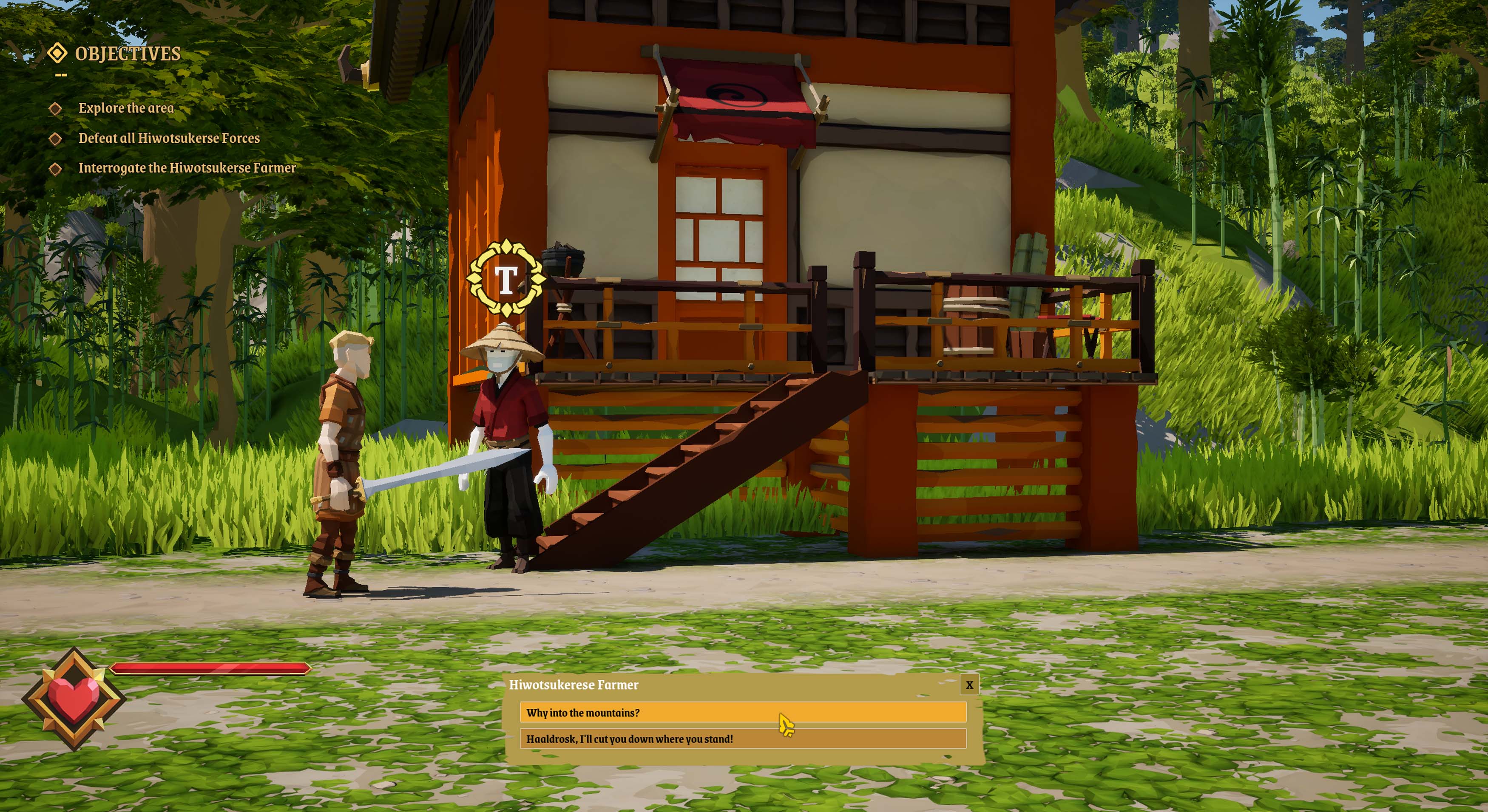 Gameplay still of Roljar confronting a Hiwotsukerese farmer after an ambush, showing a dialogue option that offers a moral choice between mercy or vengeance.