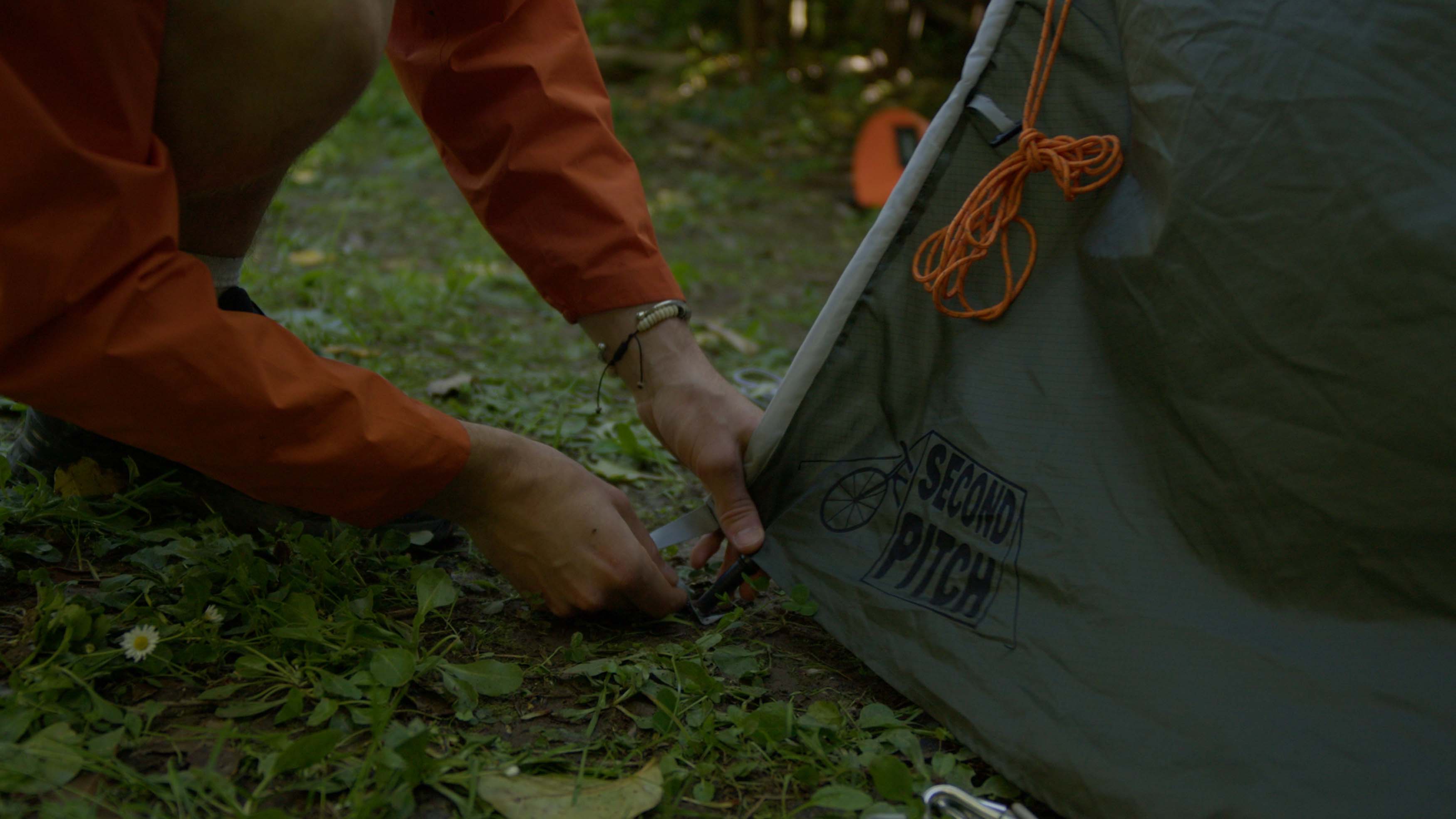 This image is an action shot of me setting the tent up with the Second Pitch logo on display.