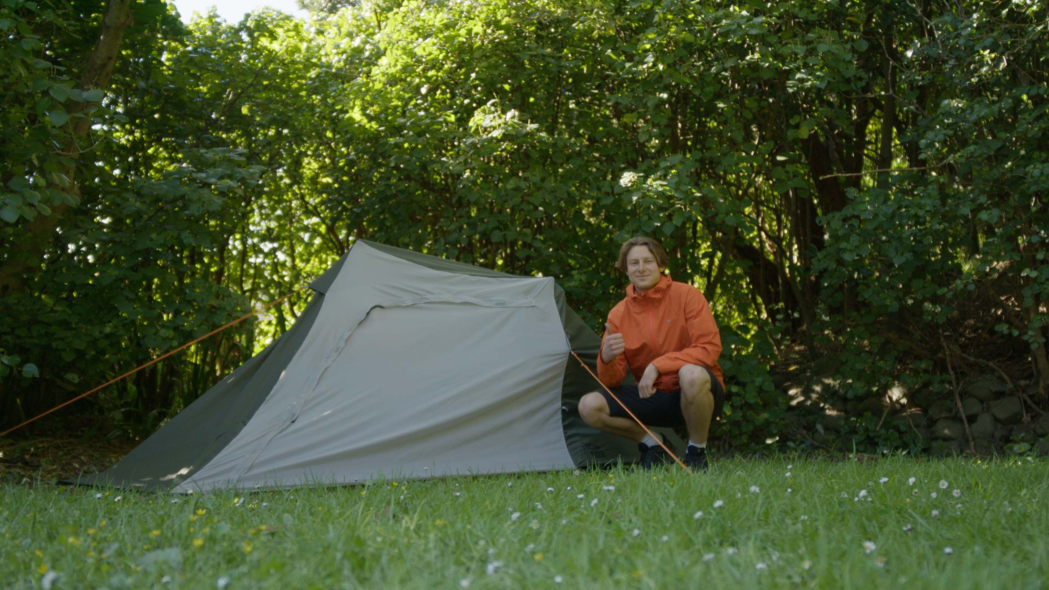 This is an image of me absolutely stoked, crouching in front of my Bike packing tent project during the shoot for my product video
