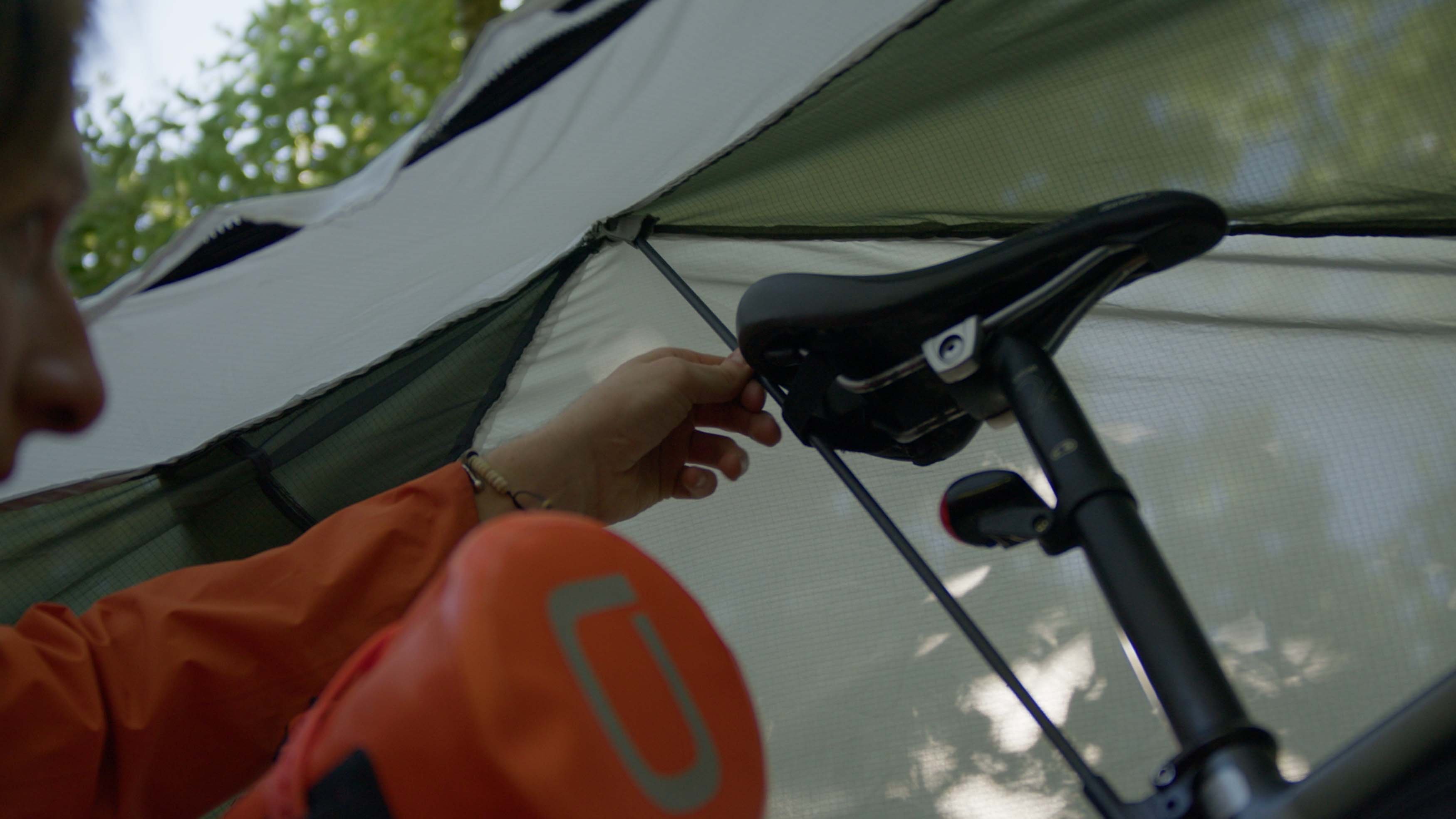 This image is an action shot of me placing the simple tent pole out the back of the seat post and up into the tent slot, creating significant headroom inside the tent.