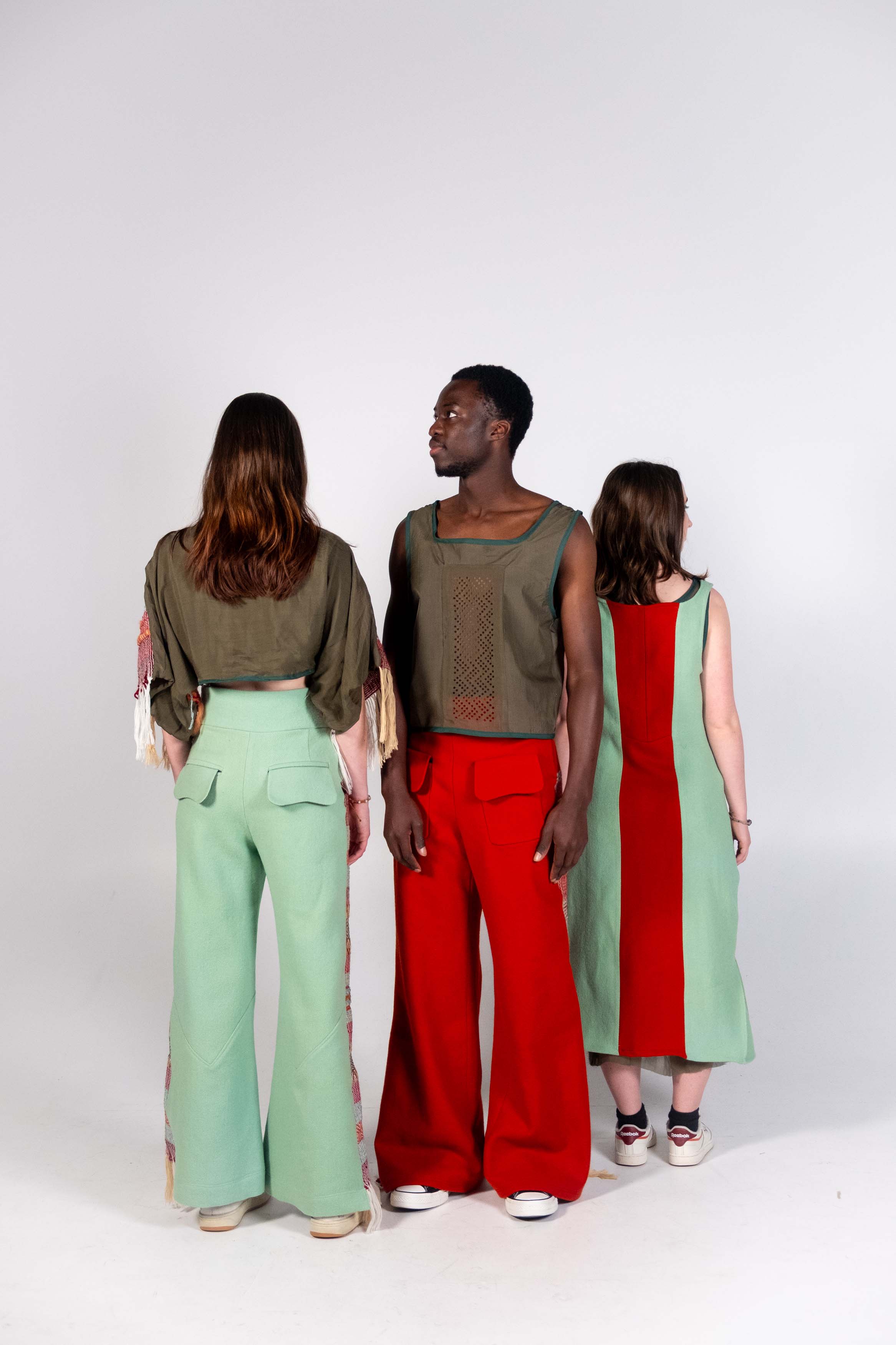 Through the medium of handloom weaving, this collection explores the intersection between fashion and textiles. With a strong focus on sustainable materiality, traditional ways of making are utilised to create environmentally conscious fashion. Natural fibres, second hand fabrics, and handmade ceramic buttons are transformed into contemporary streetwear.
