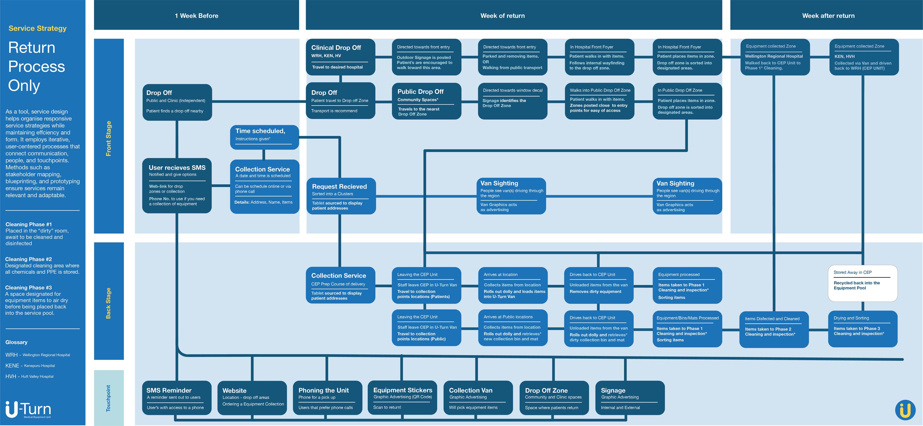 I had the opportunity to study and explore how design can improve the rehabilitation equipment return service in Wellington, managed by the Central Equipment Pool (CEP). Through a multidisciplinary approach, I worked with Health New Zealand | Te Whatu Ora to identify barriers such as awareness gaps and logistical challenges. I developed service blueprints and return receptacle designs that demonstrate how clearer communication and accessibility can enhance service efficiency and sustainability across Aotearoa’s healthcare system.