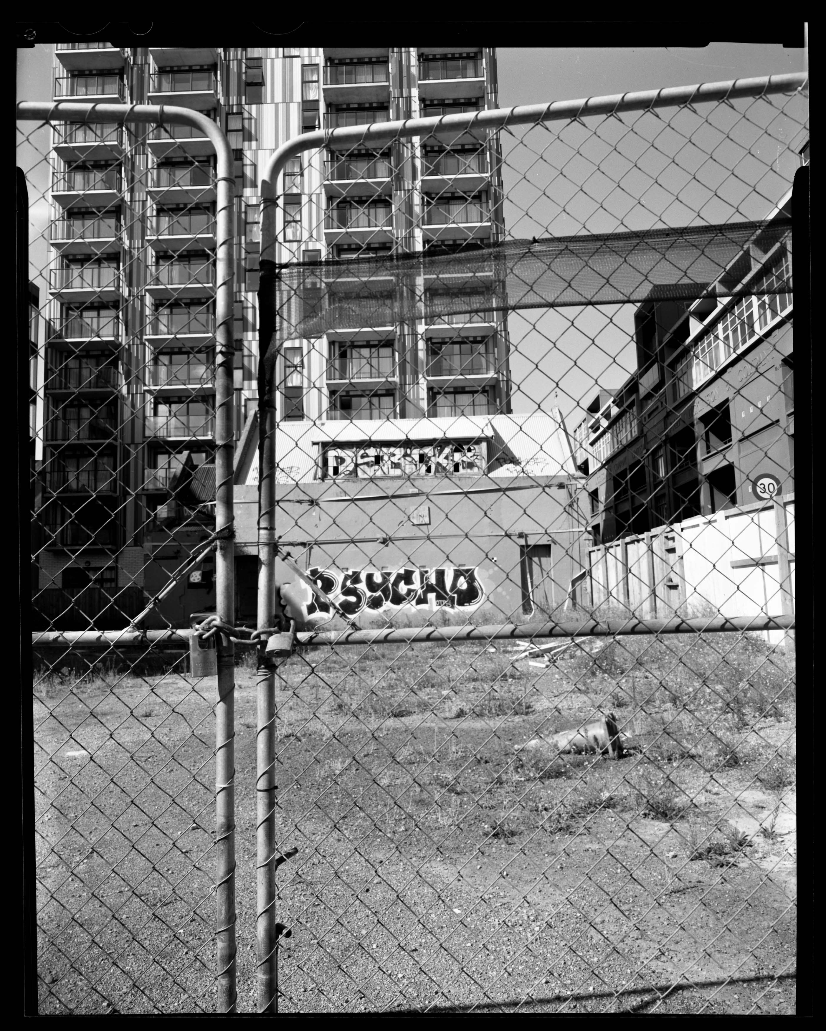 Locked gate to empty lot. Photographed on large format film and printed on fibre-based darkroom paper.