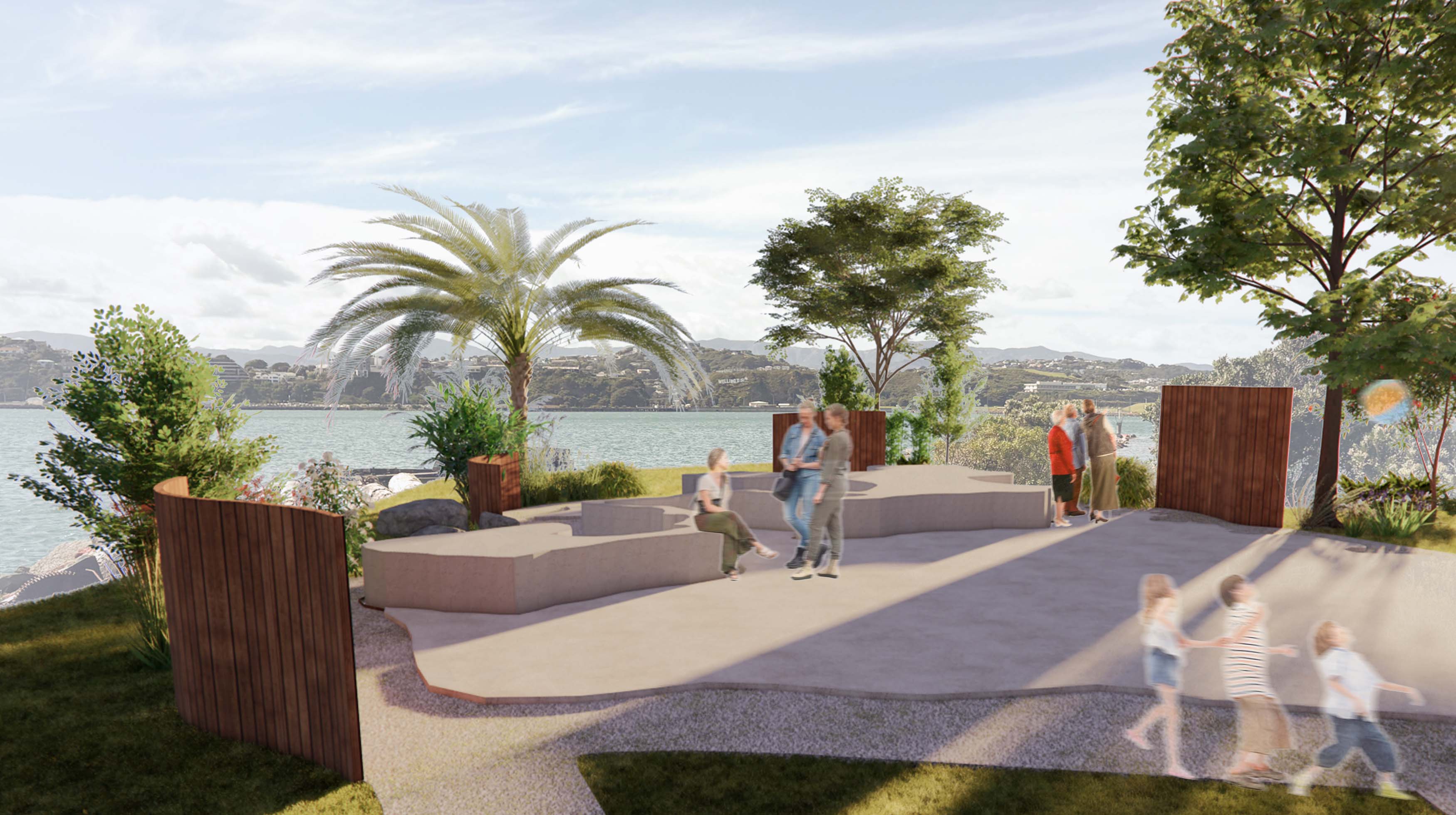 Te Pae Tai traces Te Awa a Taia's original and risen shorelines through concrete seating and water channels, while community planter boxes invite locals to nurture their coastal whenua.