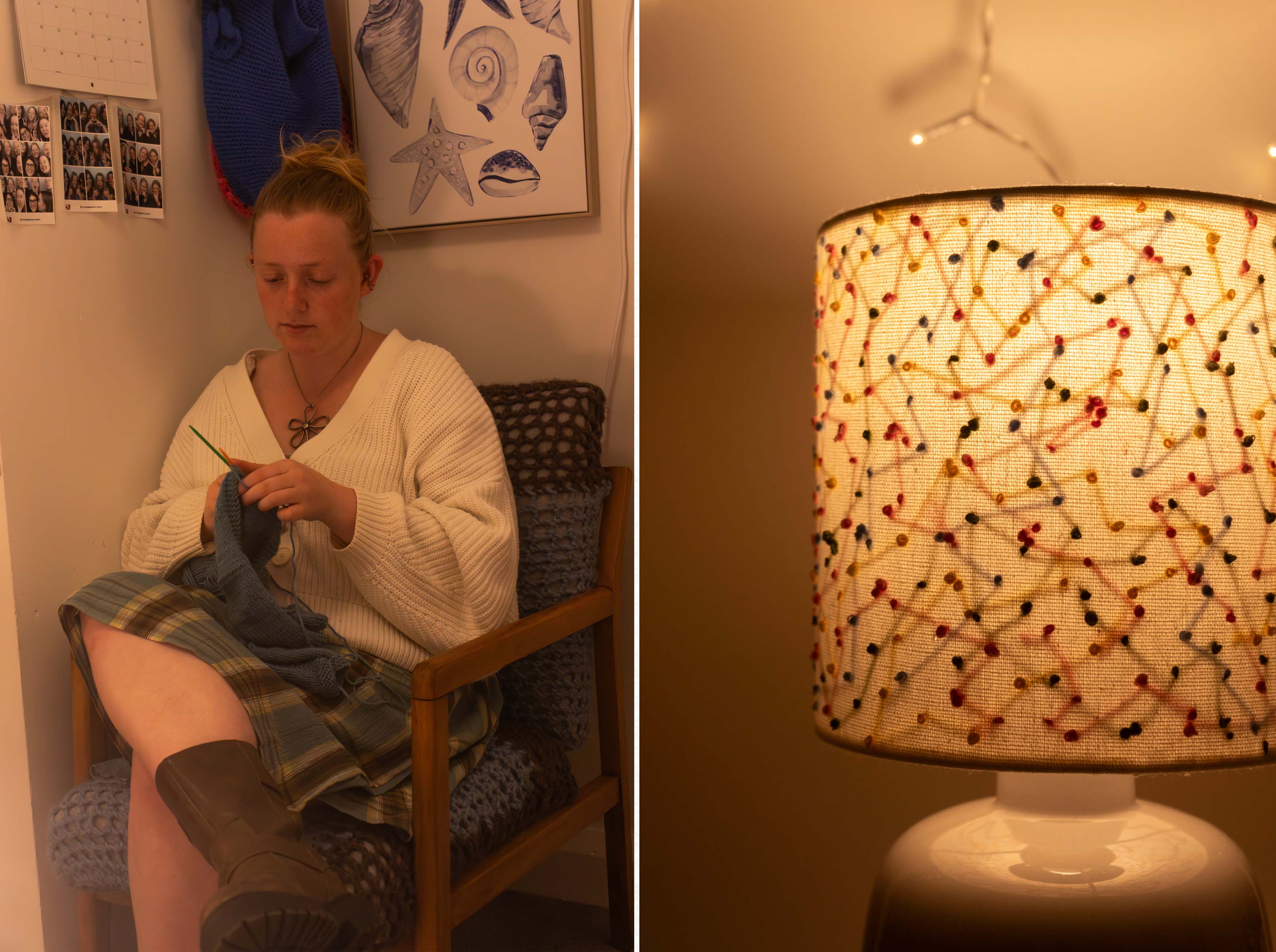 Left: Photo of crochet chair cover exploration in use. Right: Photo of embroidered lampshade exploration in use.