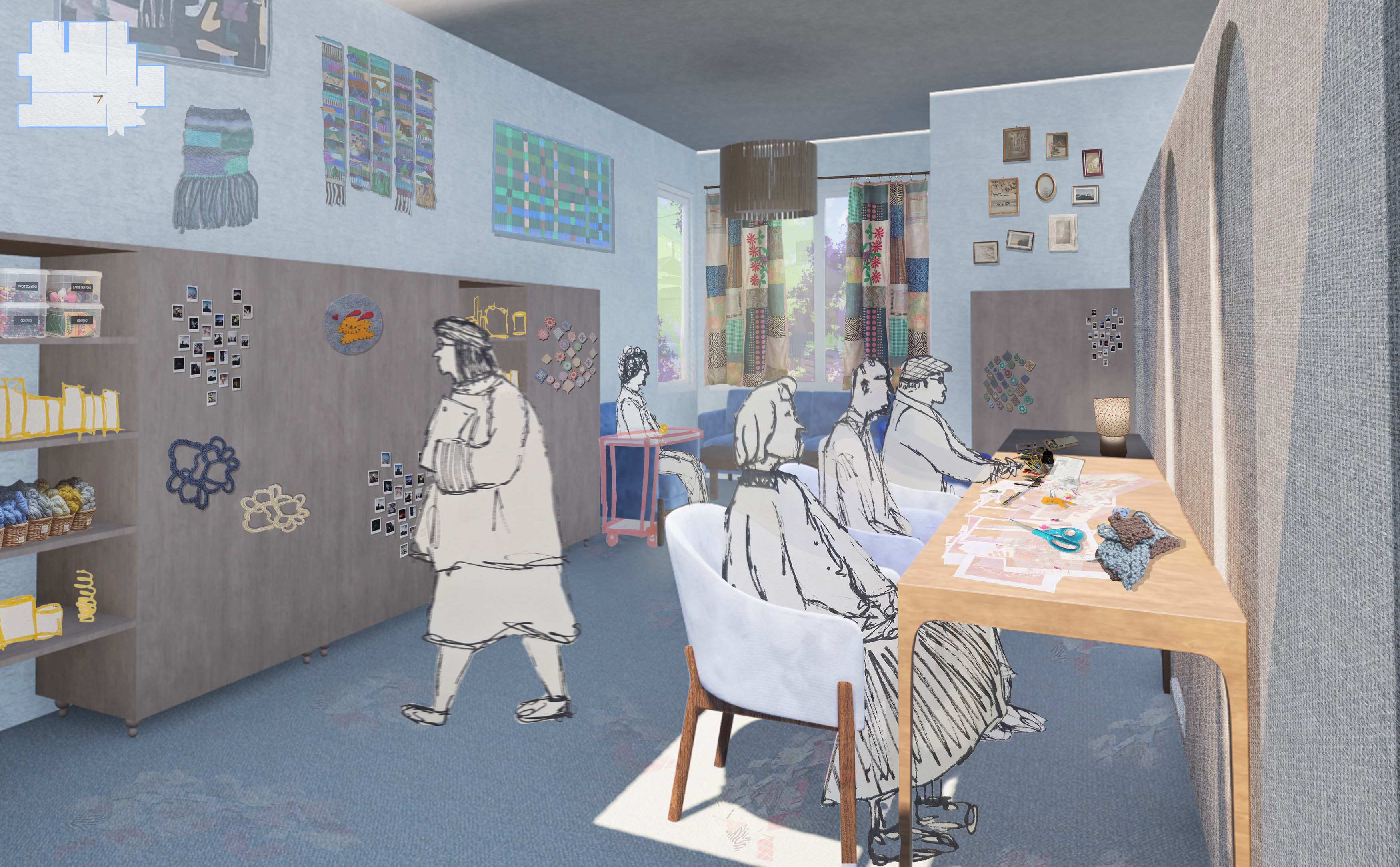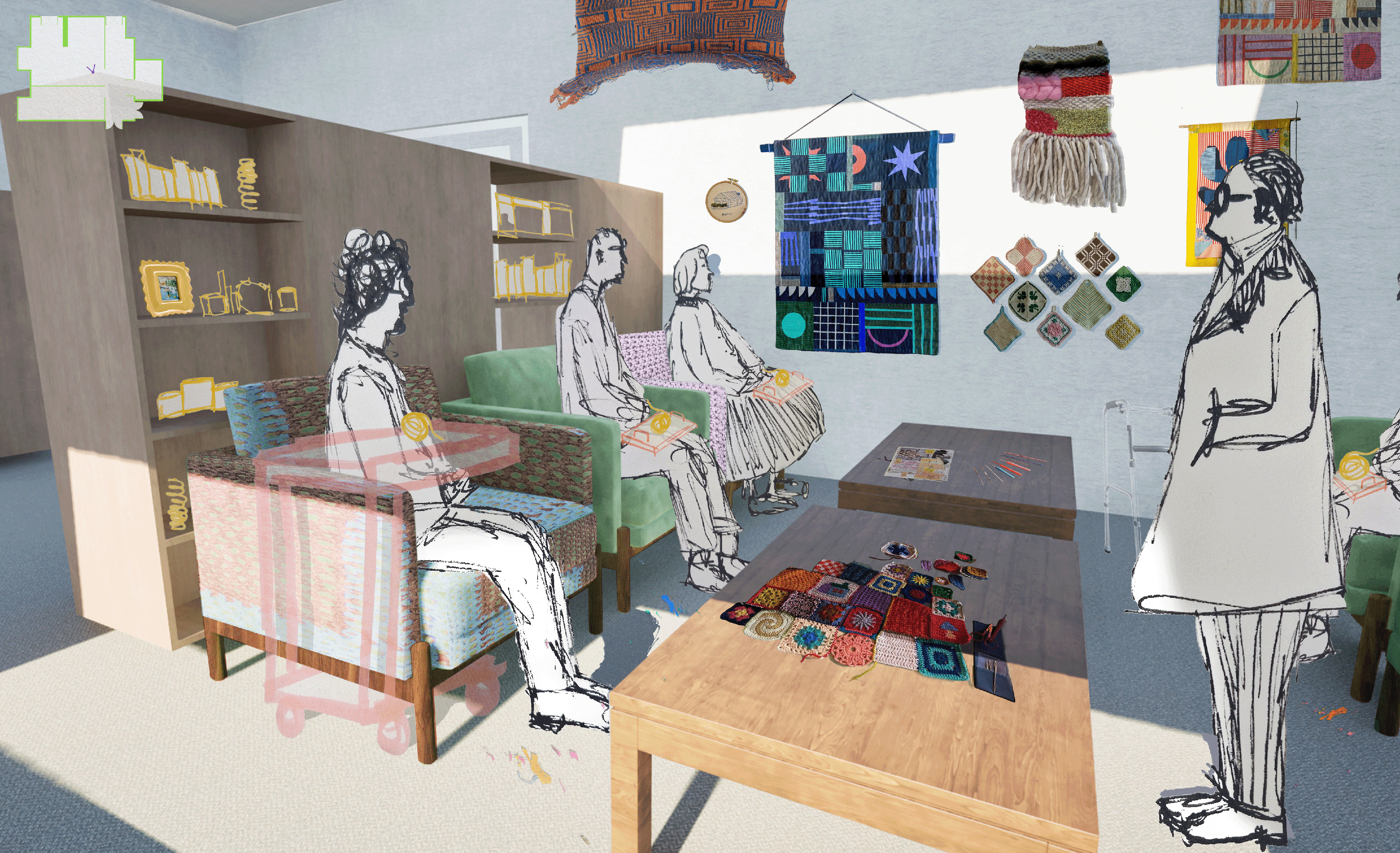 Crafting Comfort explores how self-expression and agency can be facilitated within low-level residential care. Adaptive reuse and spatial planning strategies allow for communal spaces to be transformed, enabling programmatic flexibility and creative agency. The work specifically explores how three fibre-based projects could allow residents to personalise their spaces at varied skill levels, recontextualising craft as a place-making tool that is accessible; regardless of experience, age, ability, or gender.