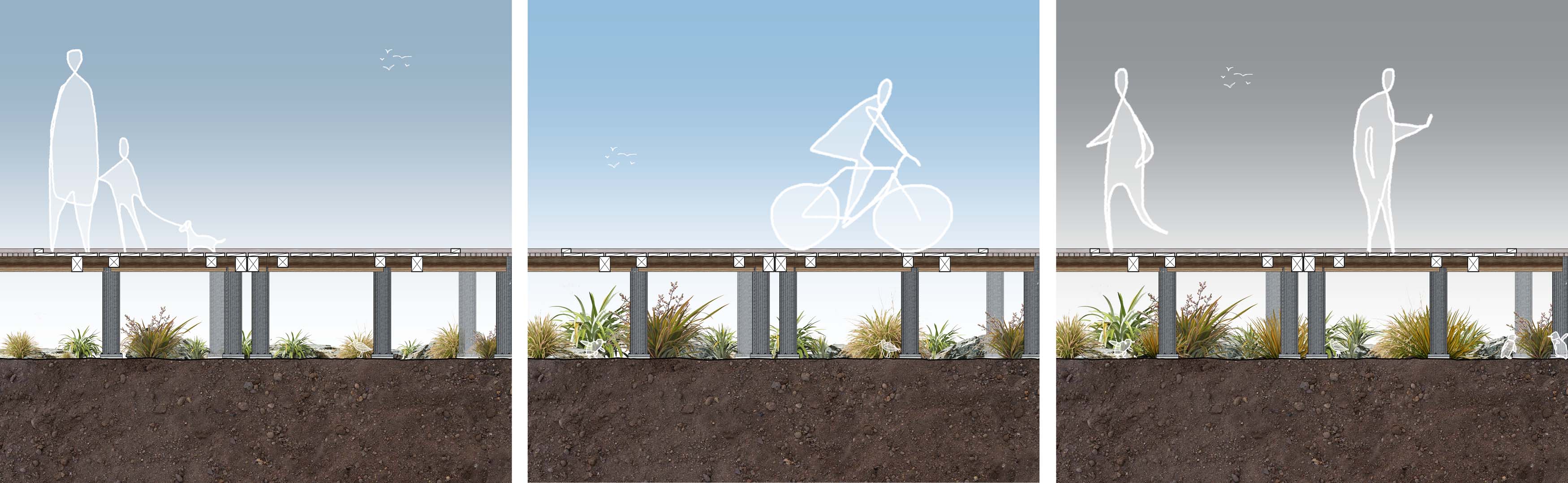 Section sequence illustrating the gradual regeneration of native plant life and wildlife habitats beneath the elevated walkway over time.