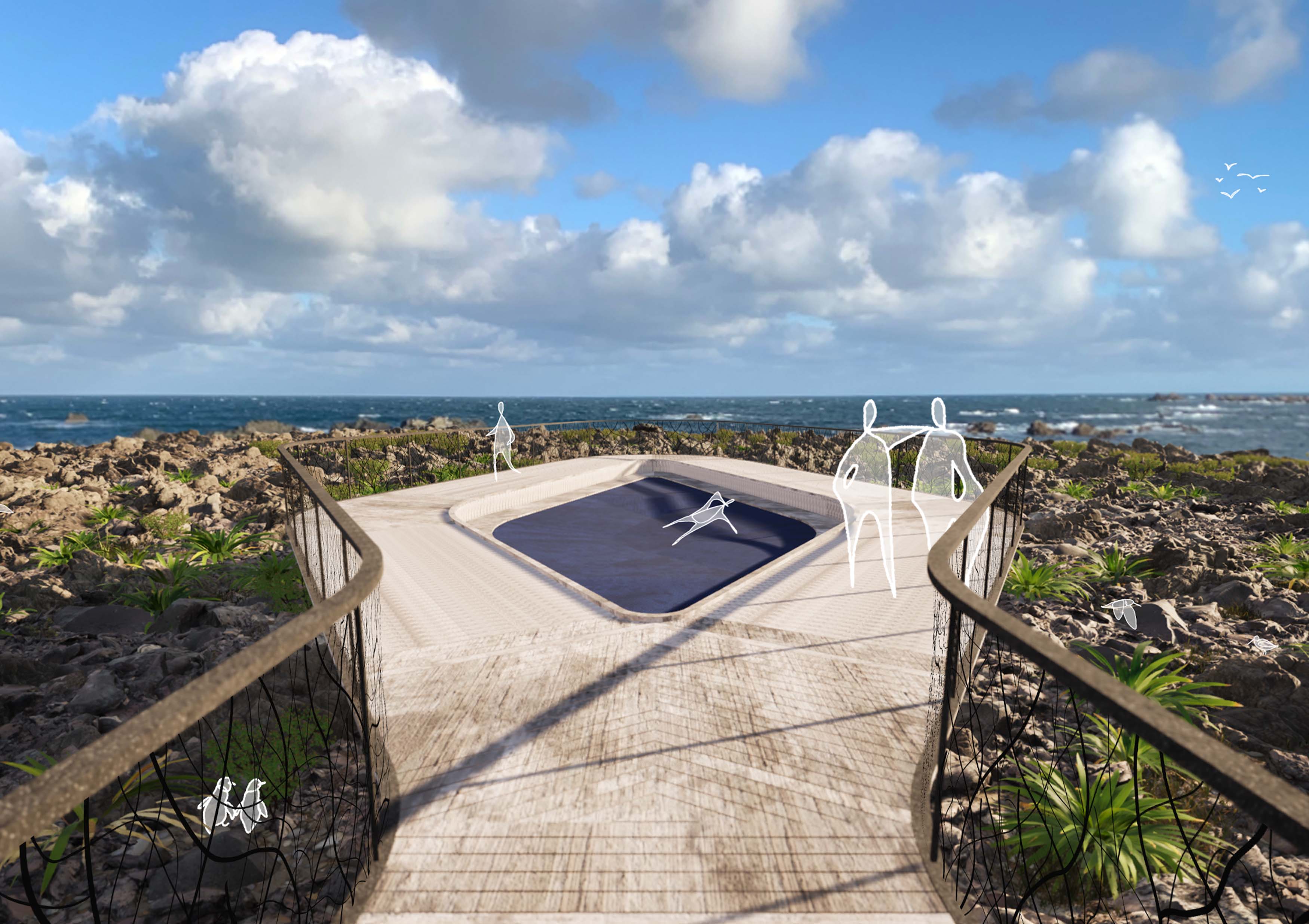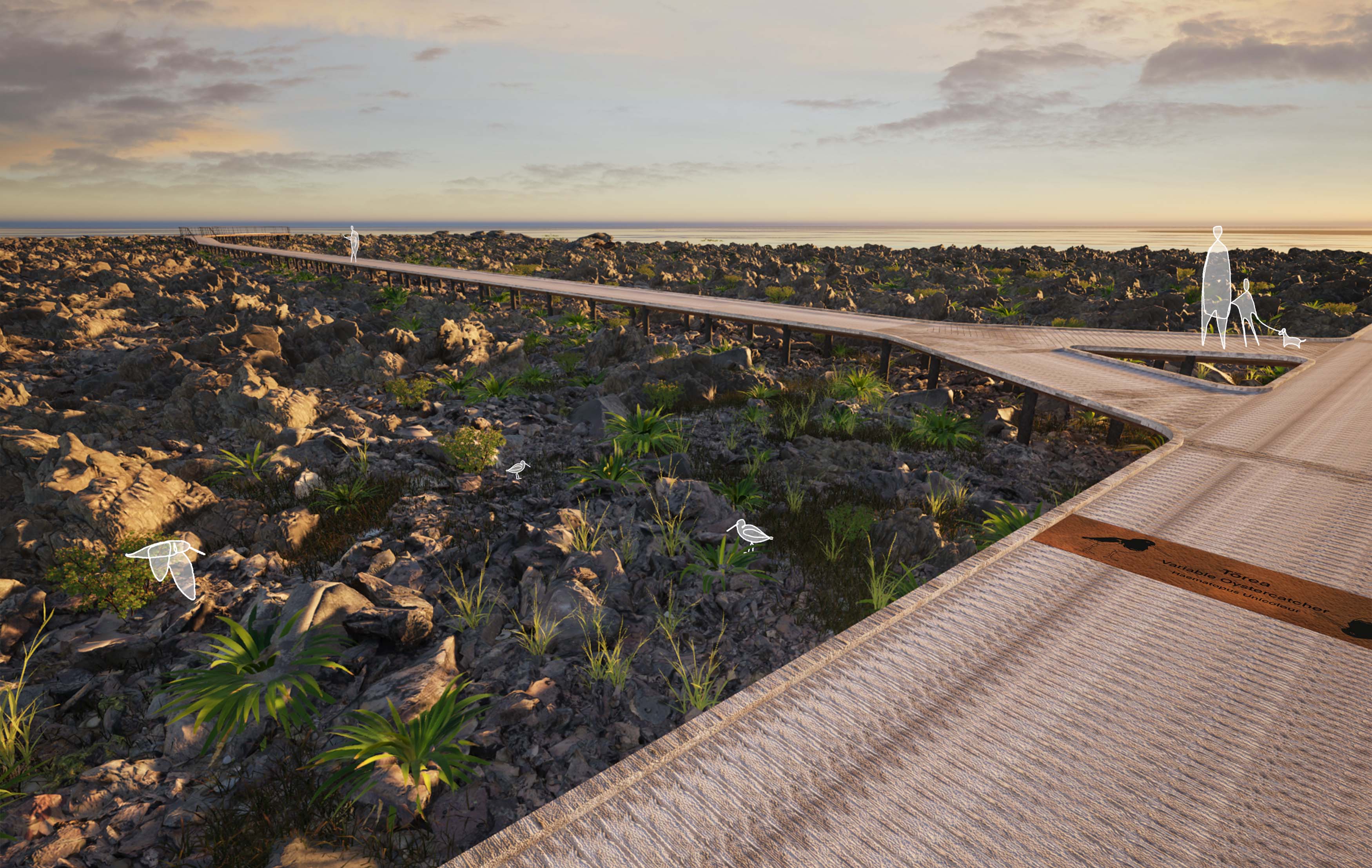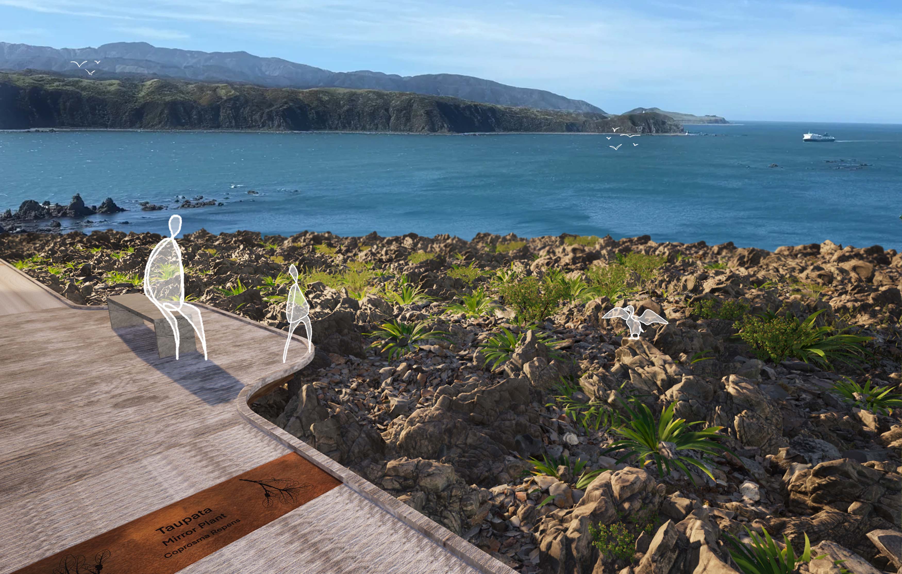 Living Pathways is a raised coastal walkway along Tarakena Bay that links Moa Point and Palmer Bay to facilitate mutually beneficial and ecologically sensitive cohabitation between human and nonhuman. Along the walkway, lookouts, seating, viewpoints and signage create moments for interaction, observation and reflection while supporting local ecology. Informed by mātauranga Māori, more-than-human and ecological theory, it seeks to balance recreation and habitat revitalisation through minimally invasive, adaptive design approaches.