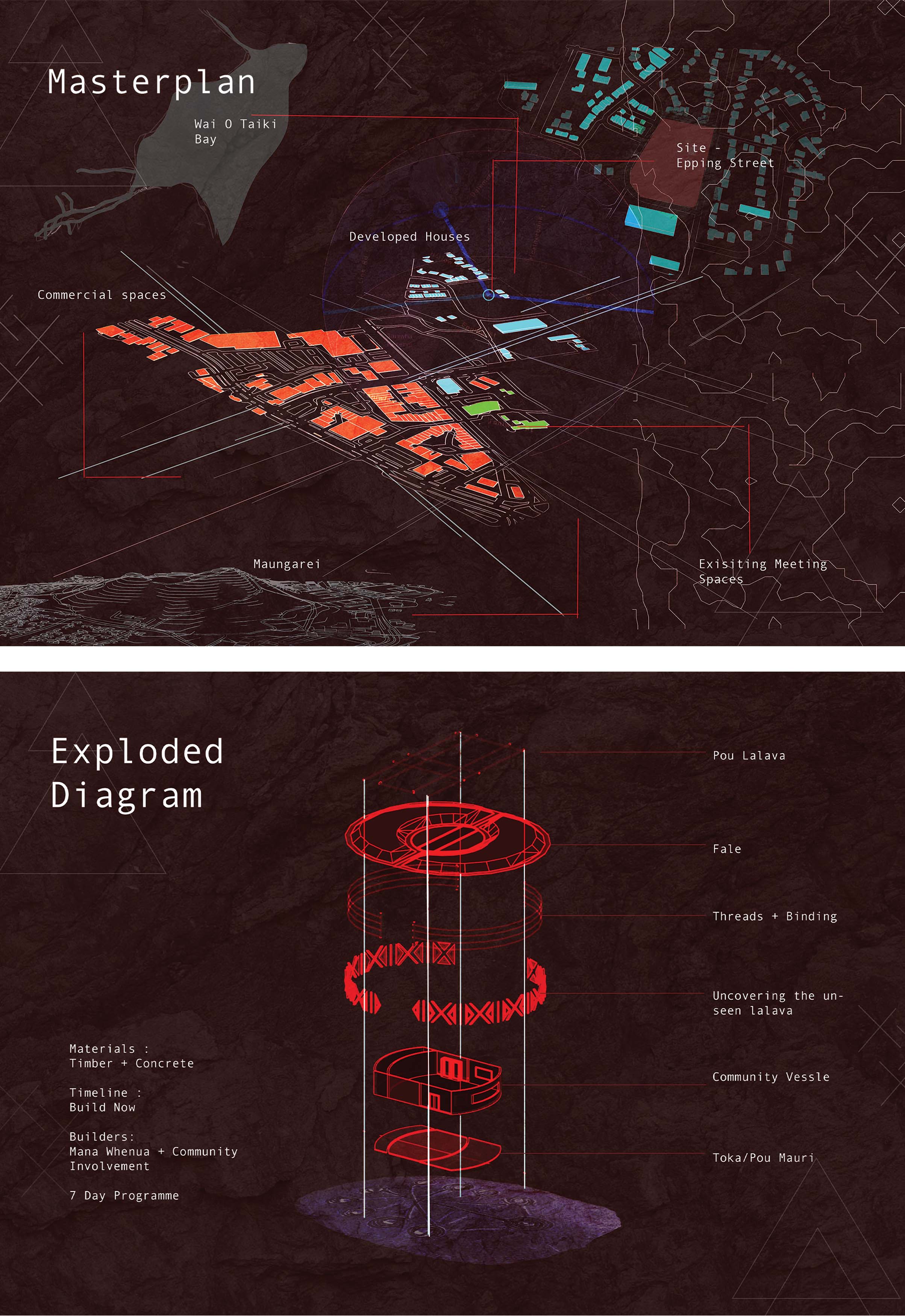 This project reclaims Epping Street in Ukutoia (Glen Innes), home to strong Māori and Moana Pacific communities, as a site of Indigenous resistance. Using Tā (time) and Vā (relational space), it explores how design can restore connection through ceremony, material traditions, and community relationships. Through lalava, vaka, fale, and cosmograms, the project offers a ‘third space’ that re-centres Indigenous presence, memory, and belonging within the urban landscape.
