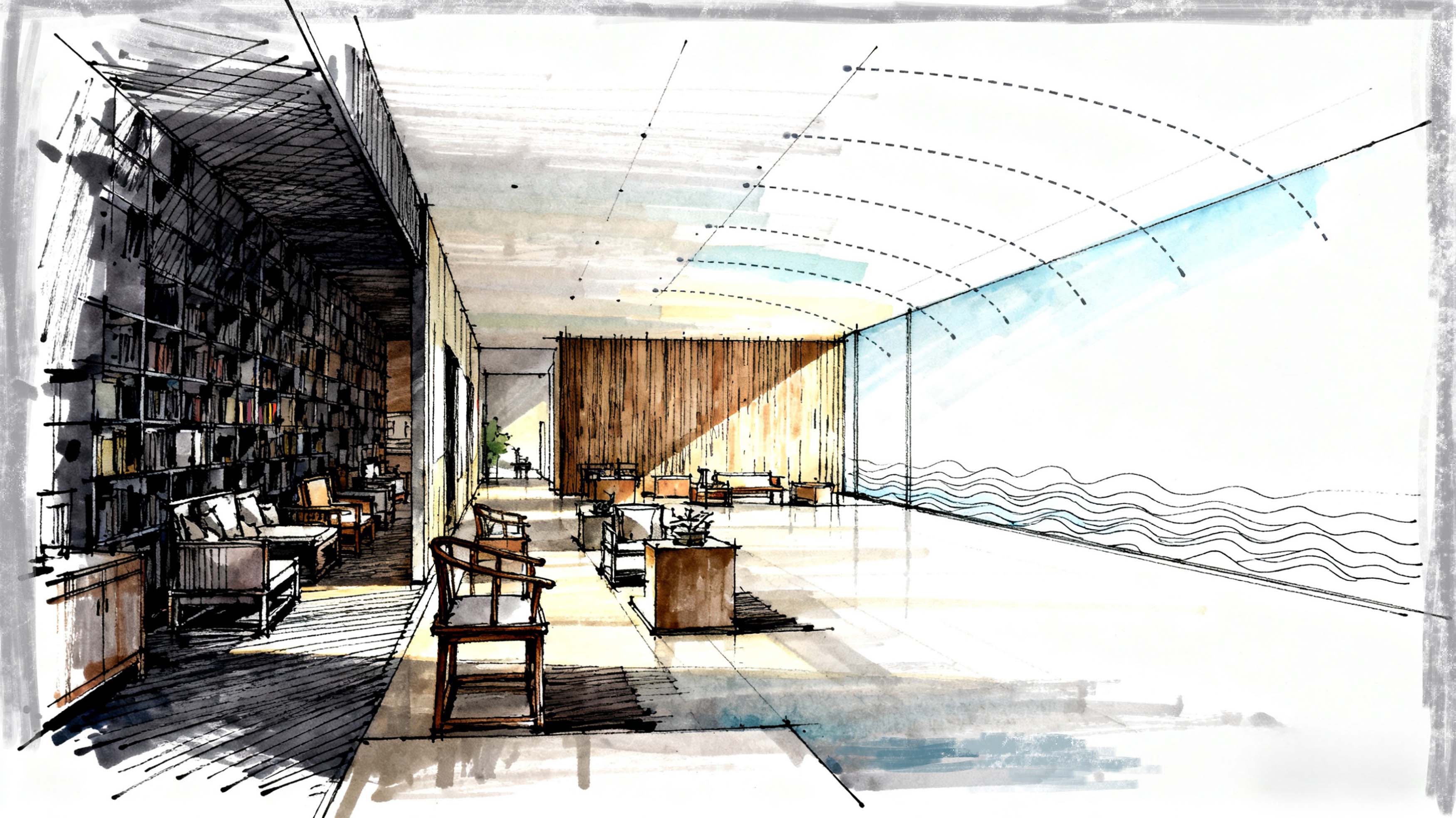 A conceptual interior sketch illustrating the spatial transition between cultural identities — from the dense structure of Beijing to the open calm of New Zealand.