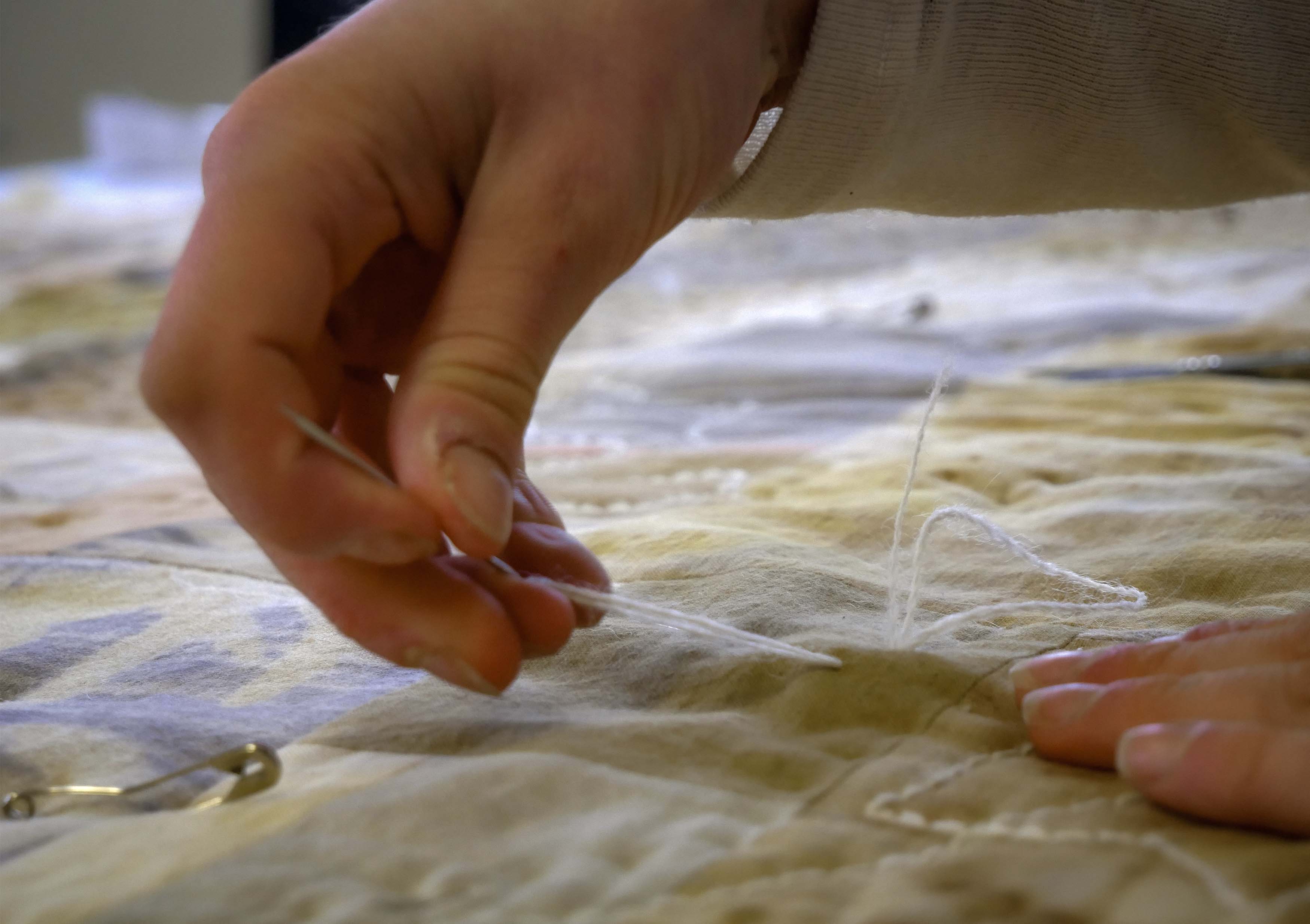 Stitching with hand spun yarn, photograph by Alec Williams.