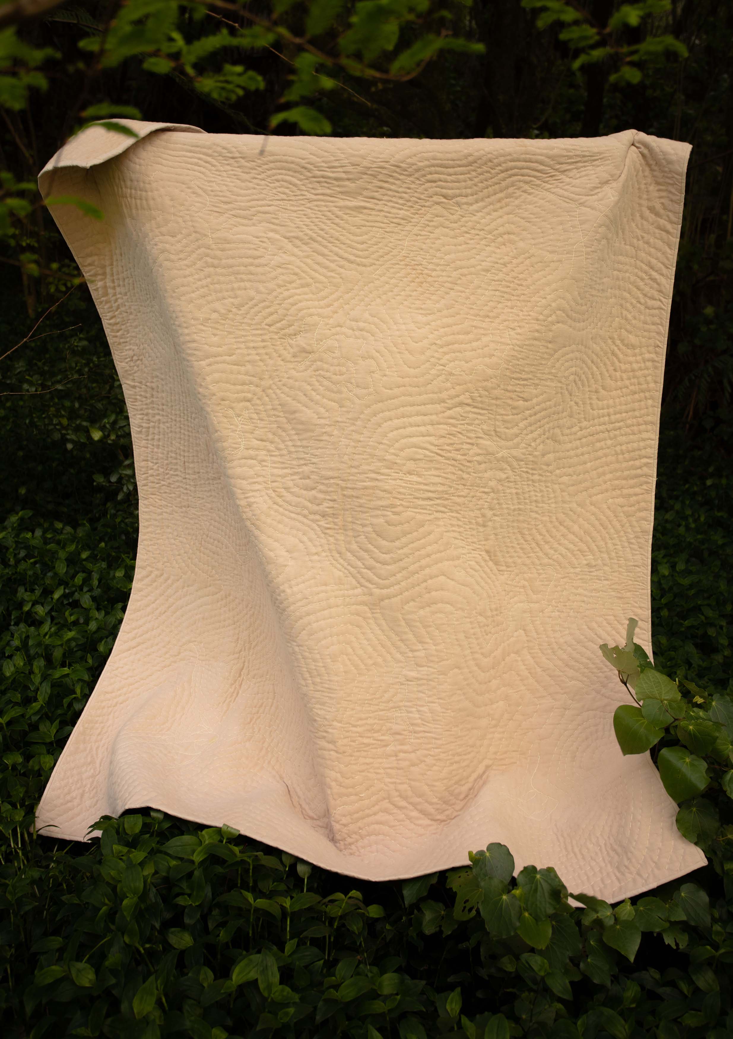 My project explores how slow, contemplative textile processes can foster a reconnection with my practice, deepening both personal and material relationships. Emerging as a response to burnout, it honours my childhood self’s fearless approach to creativity. Every element of this quilt has been lovingly crafted with my own hands, through natural dyeing, eco-printing, spinning, stitching, and felting with foraged and repurposed natural materials.
