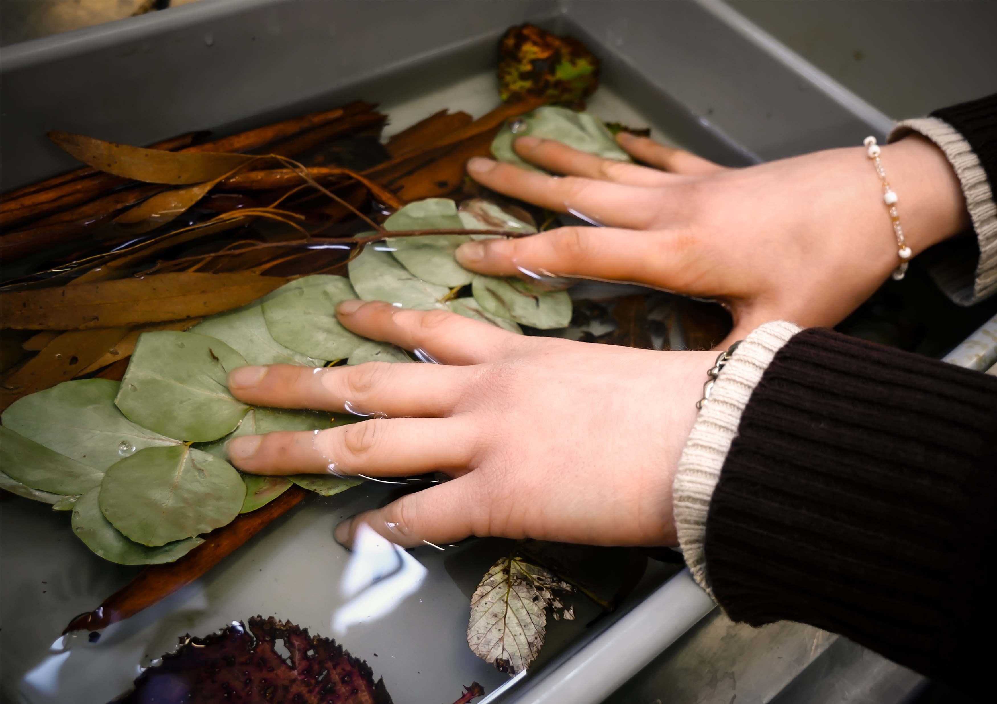 Soaking Eucalyptus leaves for eco printing, photograph by Alec Williams.