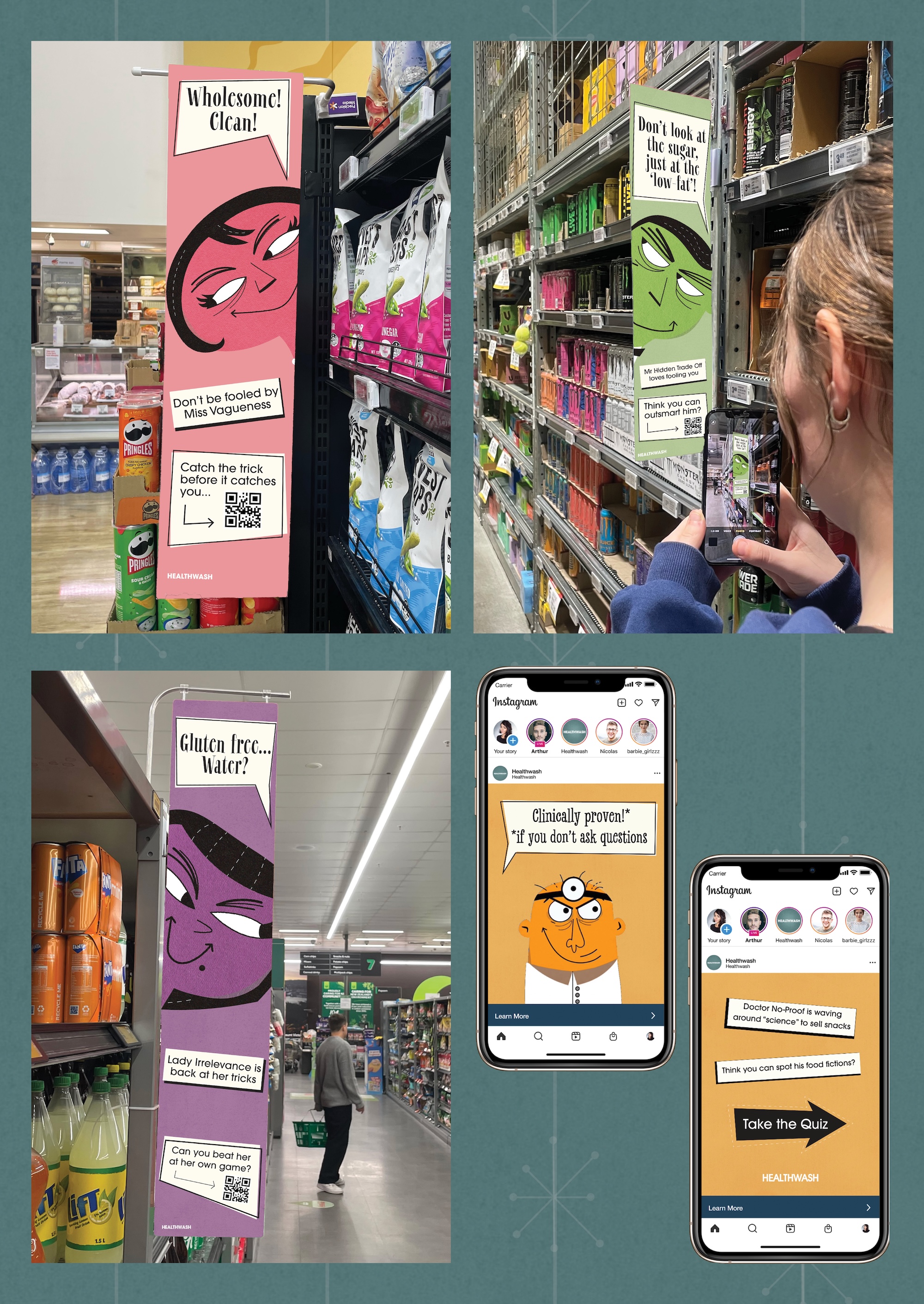 Placed in spaces where healthwashing occurs, Healthwash’s satirical posters and Instagram ads provoke curiosity and guide users to the website.