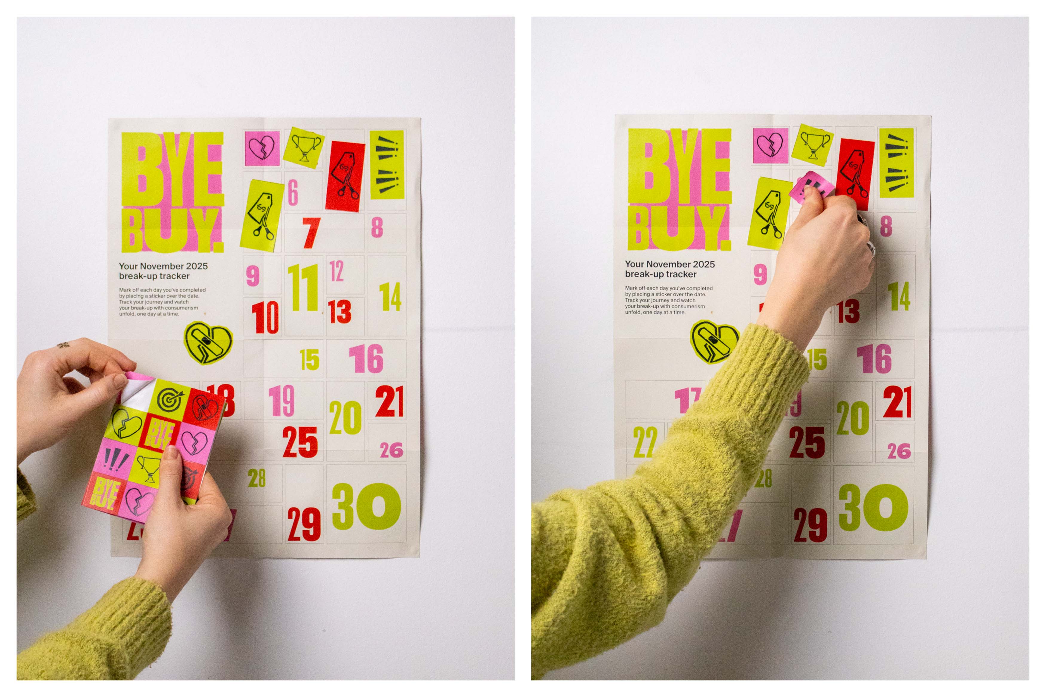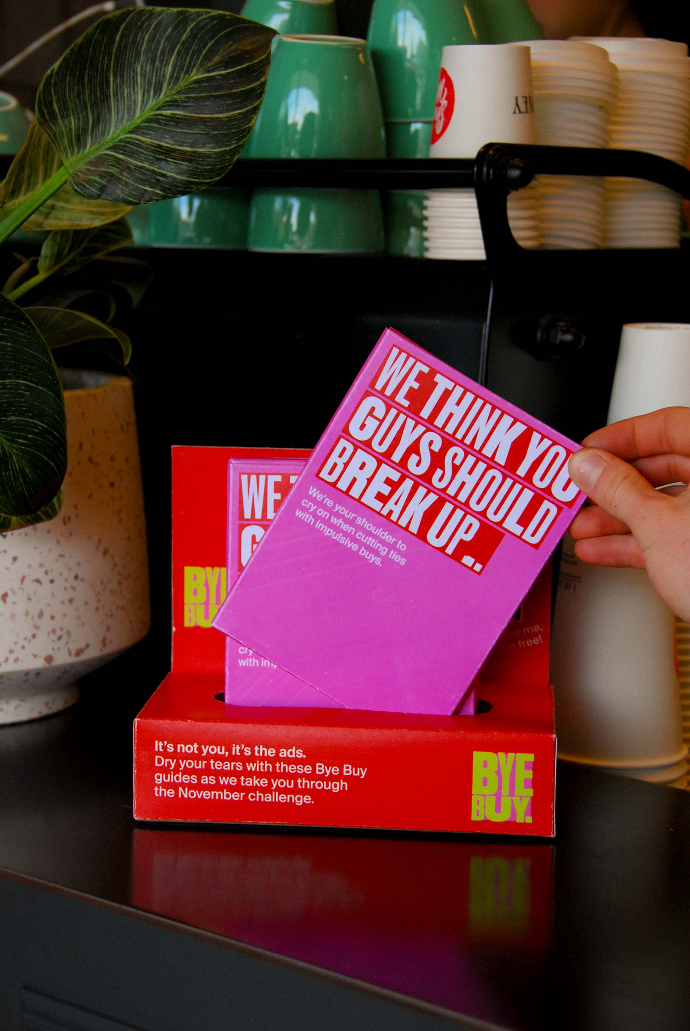 Bye Buy is a multi-touchpoint campaign designed to empower young people to challenge messages in advertising that fuel overconsumption. Taking on the narrative of a break-up, Bye Buy acts as a shoulder to cry on when dumping consumerist values. The centre of the campaign is a challenge made up of daily tasks that build stronger attitudes against the pressure from advertising to constantly consume. Brochure packs displayed at local cafes and libraries contain a guide to the challenge and information about the negative impacts of overconsumption.
