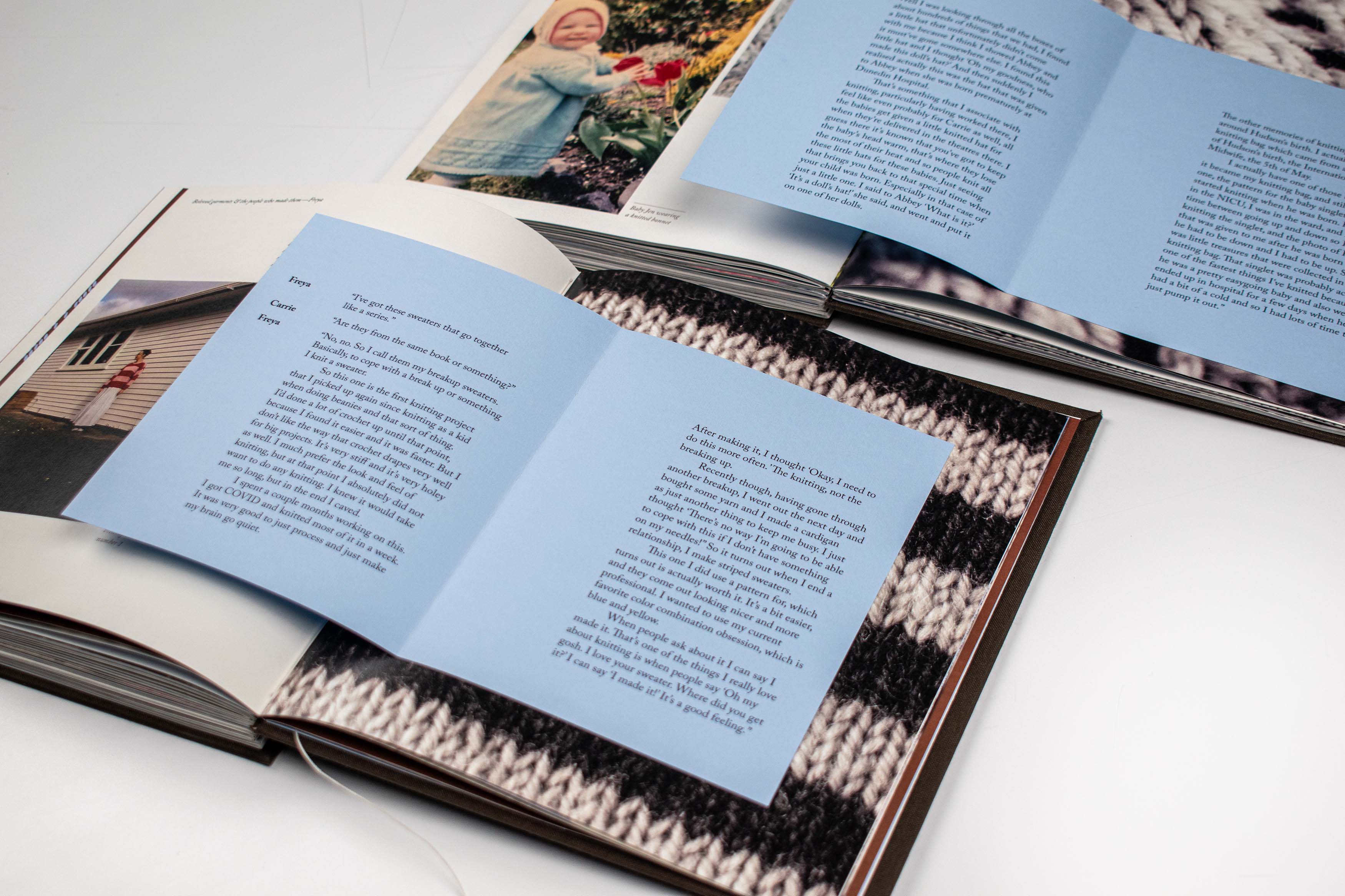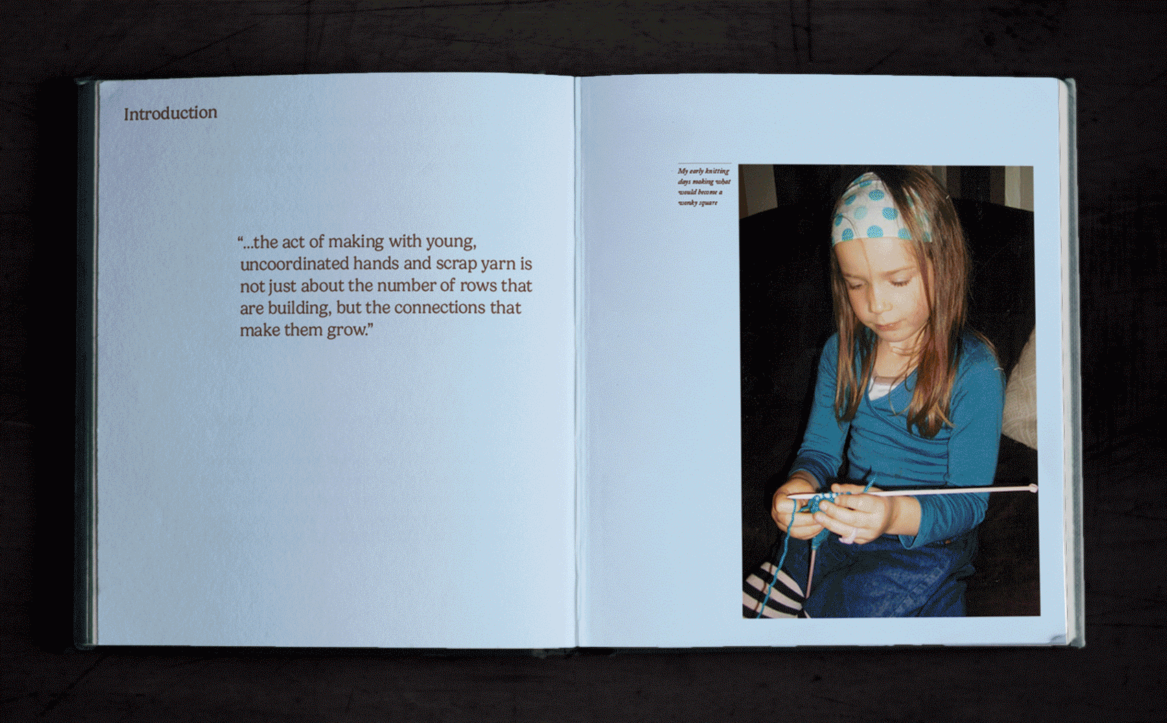 Purls' explores the role of knitting within family, reflecting on how handmade garments can preserve stories, express love, and strengthen intergenerational connection. It features a collection of knitted garments significant to my extended family across generations, accompanied by stories of how each person learned to knit and what the practice means to them. Through book design, I explore the significance of knitting as memorialisation in family contexts.