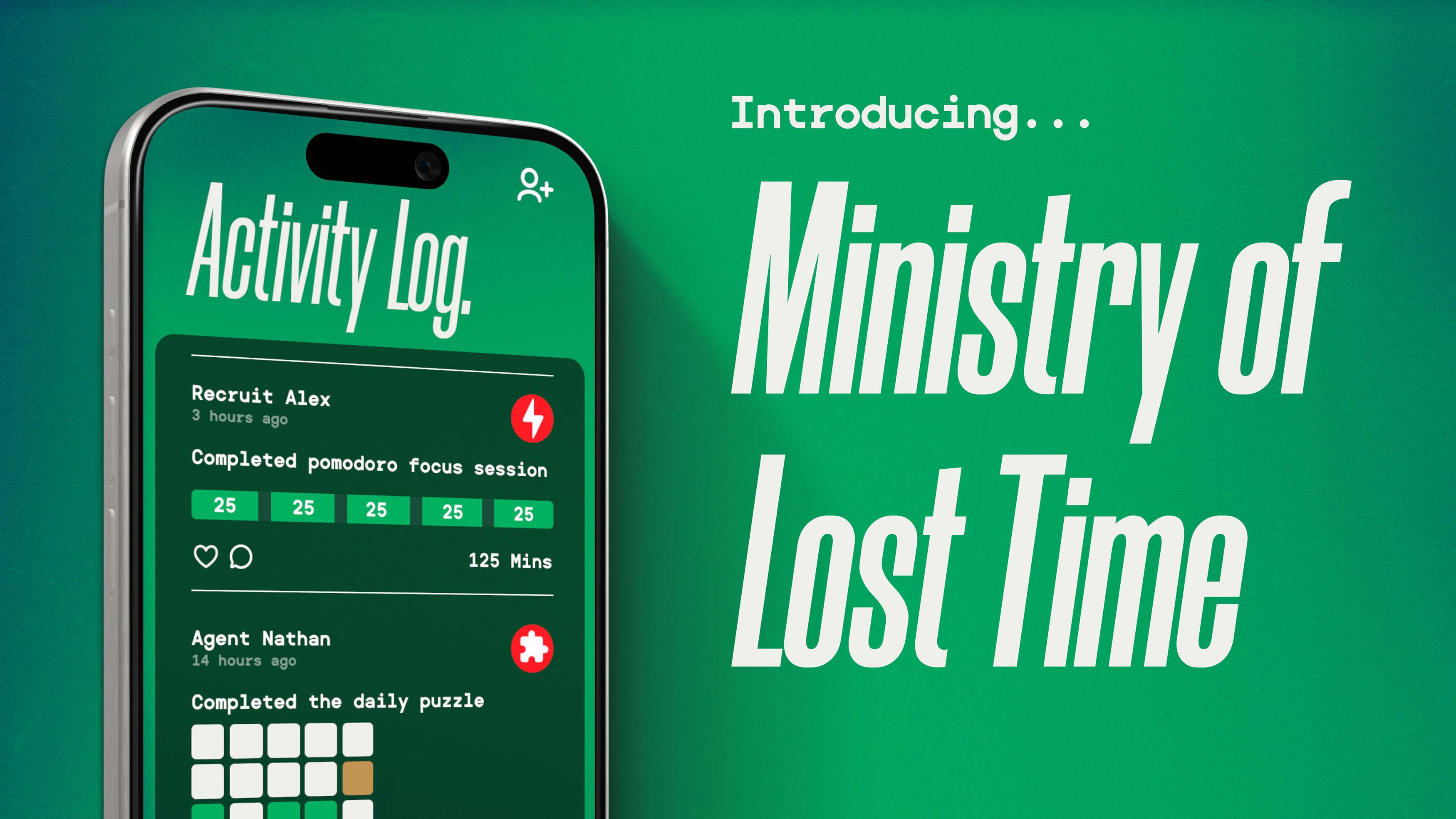 Ministry of Lost Time is an app that provides tools for students to use their phones more intentionally. This stems from the idea that our phones aren’t all bad, but sometimes they get in the way of what we want to spend our time doing. Students join the Ministry, complete various missions, and reclaim their lost time. My approach utilizes social accountability and gamification techniques to underpin the app design.