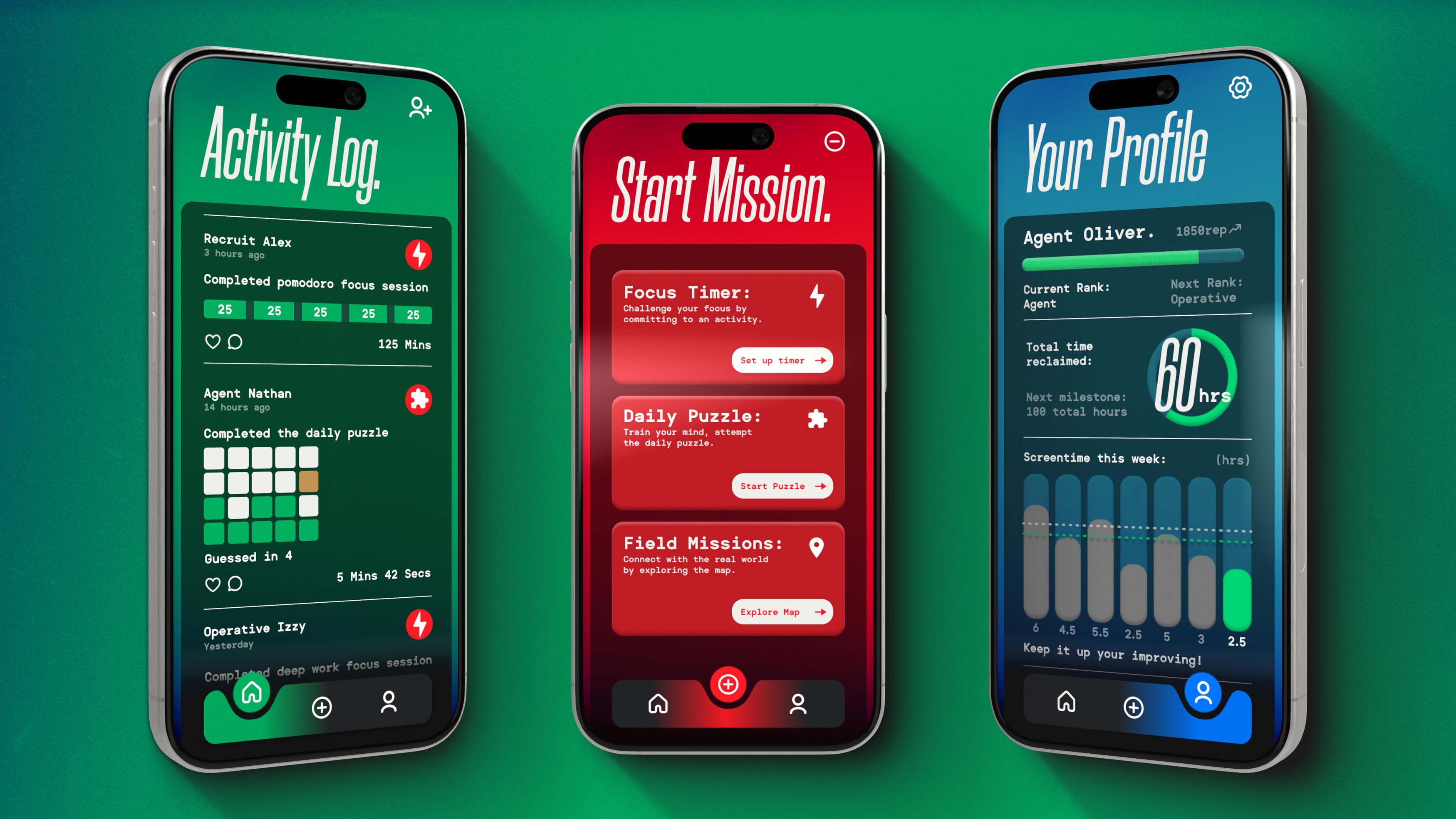 Mockups of the 'Activity Log', 'Start Mission' and 'Your Profile' pages.