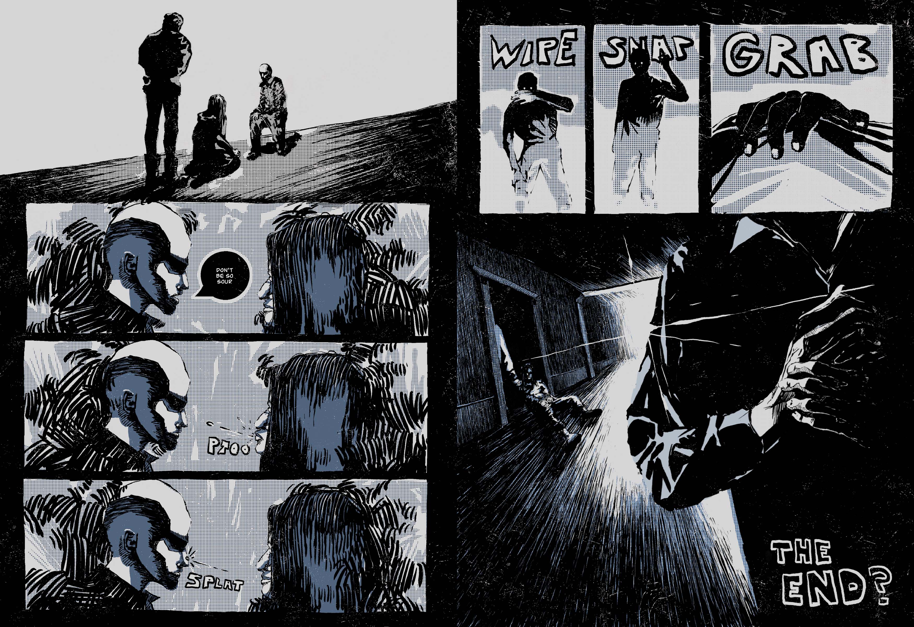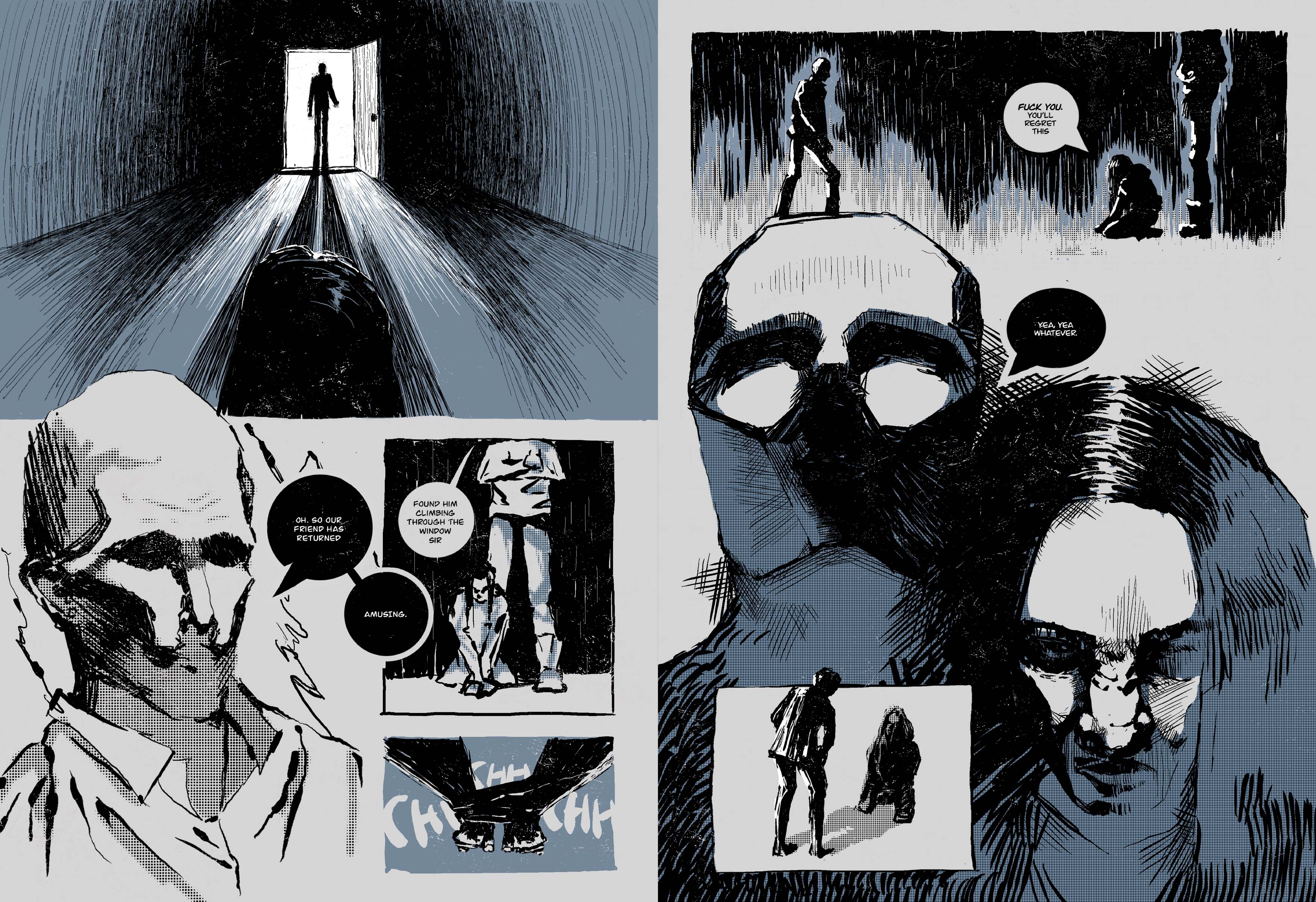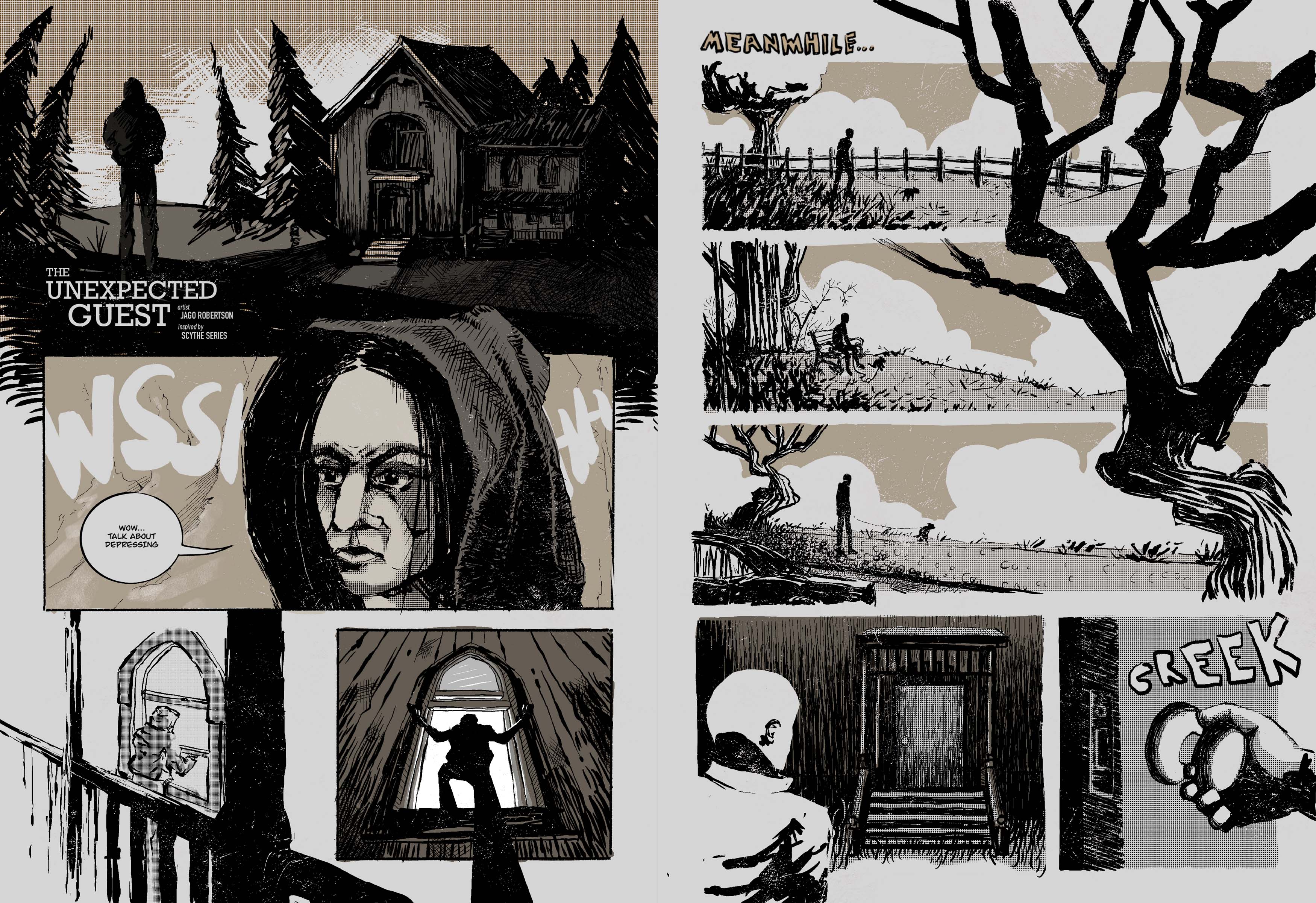 This short comic draws inspiration from Neil Shusterman’s Scythe series. It opens with an attempted break in, where the main character is quickly caught and left at the mercy of his assailants. I used a loose, decorative style and layout to convey the scene dynamically, allowing it to flow naturally between moments while maintaining a clear visual hierarchy. By pushing the tone in a darker, moodier direction, I aimed to add a sense of depth and mystery to the piece.
