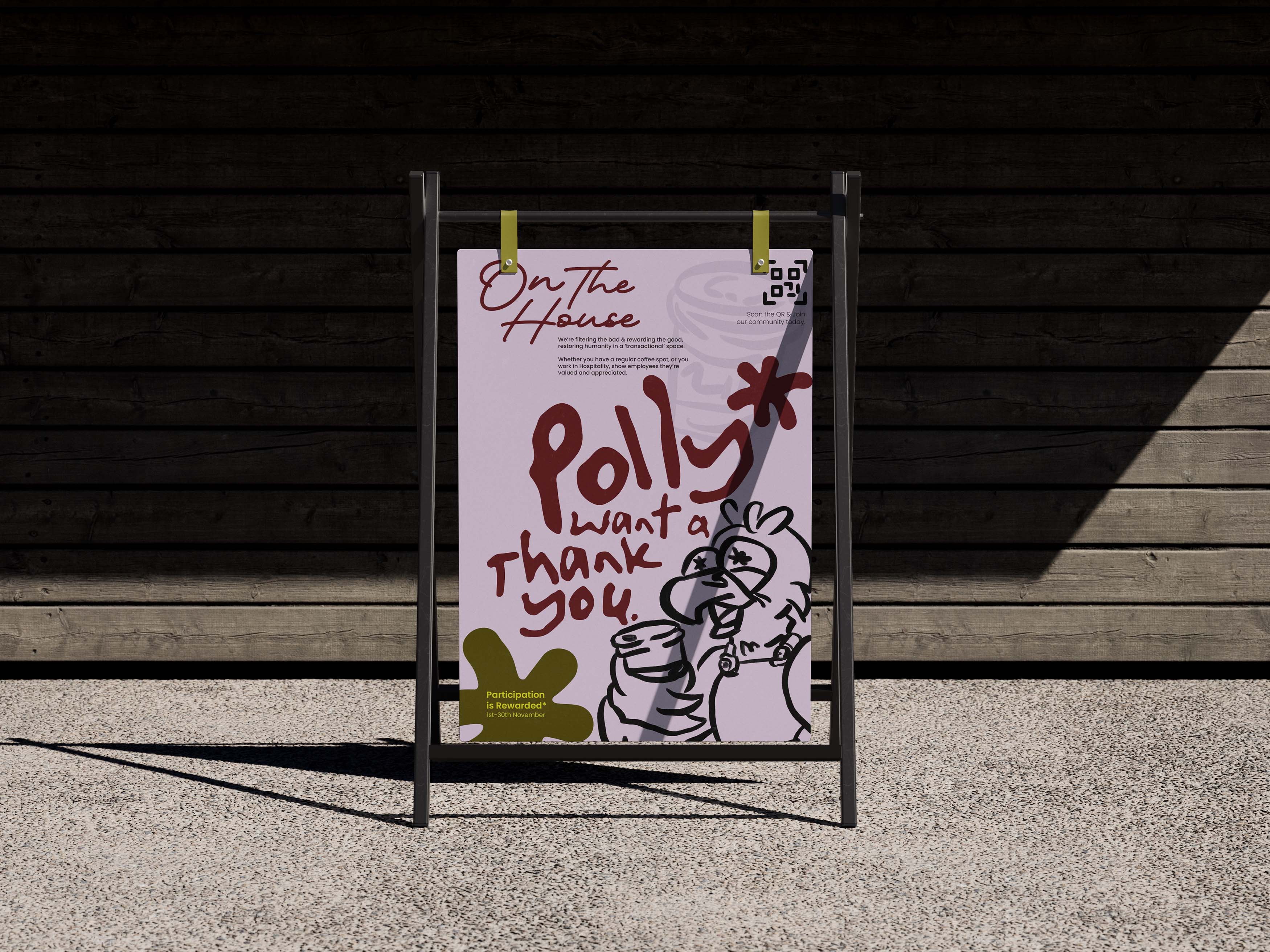 This poster exists as a standing sign, designed in an environment outside a cafe/restaurant. A visual aid, displayed at participating venues.