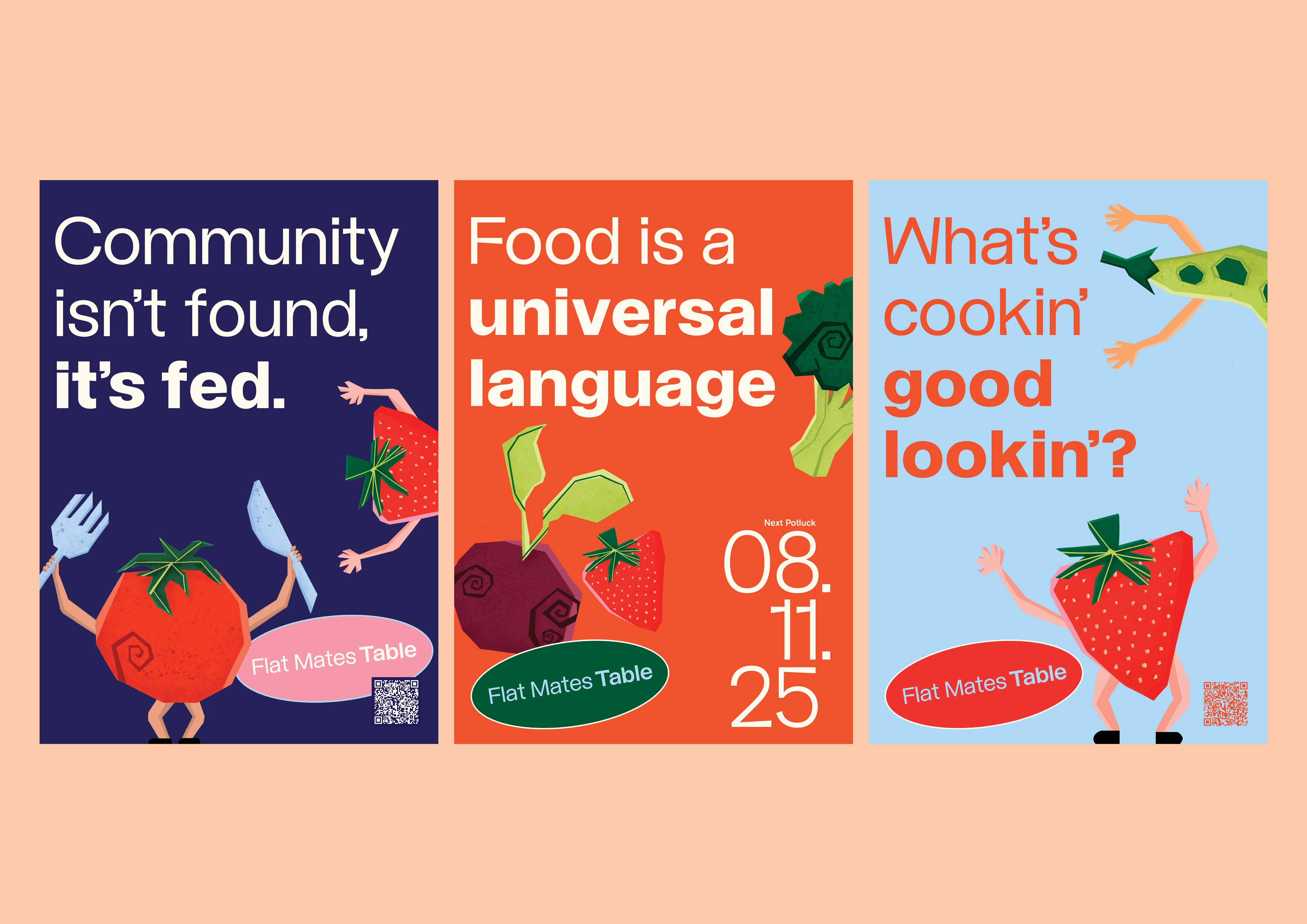 Our project, The Flat Mates Table, set out to tackle loneliness among young people by connecting flats through shared meals. Working within the context of social isolation, we designed a playful food-sharing subscription and campaign using posters, guerrilla marketing, and app design. Our brand aesthetic is playful, approachable, and engaging, making it more accessible to use. We learned how design can spark community connection and interest. Our display showcases this process and highlights how design fosters meaningful, real-world interaction.