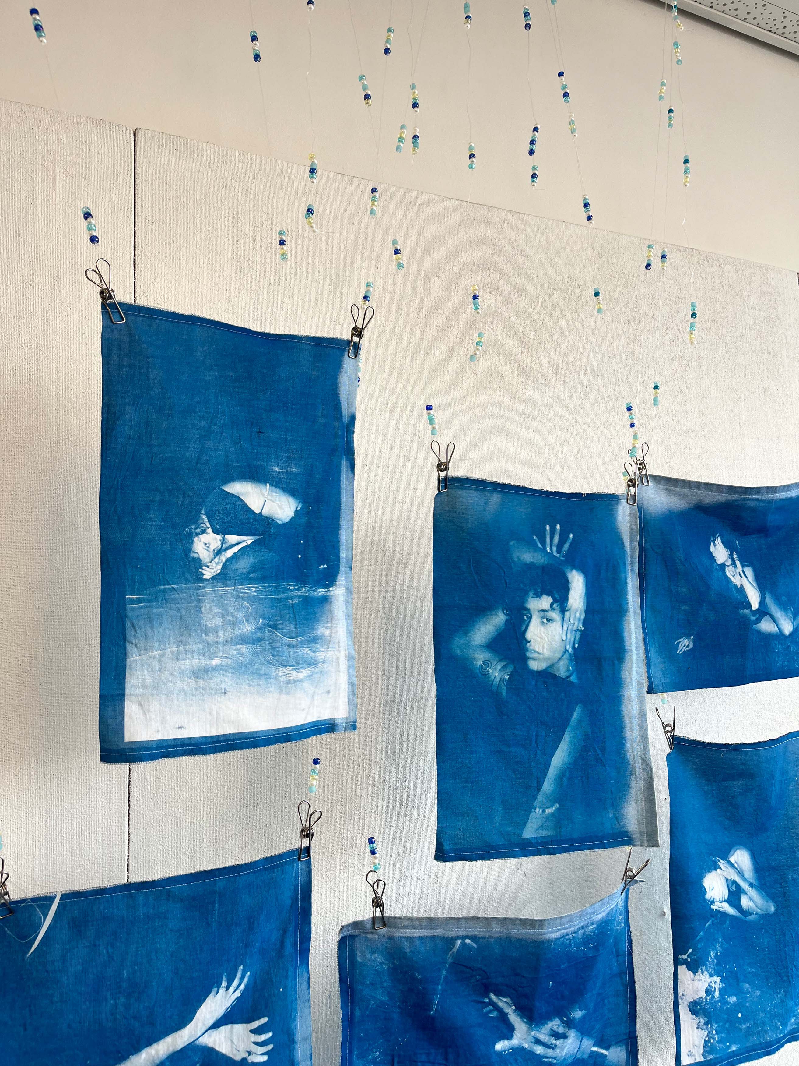 Undertow is a photographic series exploring the ancient and intimate connection between femininity and the ocean. Through tactile, moody, and raw visuals, my project positions the sea as not just a backdrop but as a collaborator, a sanctuary, a mirror, and a maternal figure. The images blend body and landscape, with hair tangled in seaweed, a body curled within rockpools reminiscent of the womb. Close up details of hands in the water, wet hair, and shells create a sense of cycles, vulnerability and transformation. Connecting to the oceans symbolic relationship with the moon and womanhood, this work invites viewers into a submerged, sacred space where identity, nature and emotion bleed together. In a liminal space between land and sea, Undertow becomes an ode to womanhood, offering a sensory, emotional experience that speaks to strength, vulnerability and deep, unspoken connection. Cyanotyped onto fabric, the colour and movement mimics that of waves lapping at sand, the beads glinting in the light like pieces of sea glass.