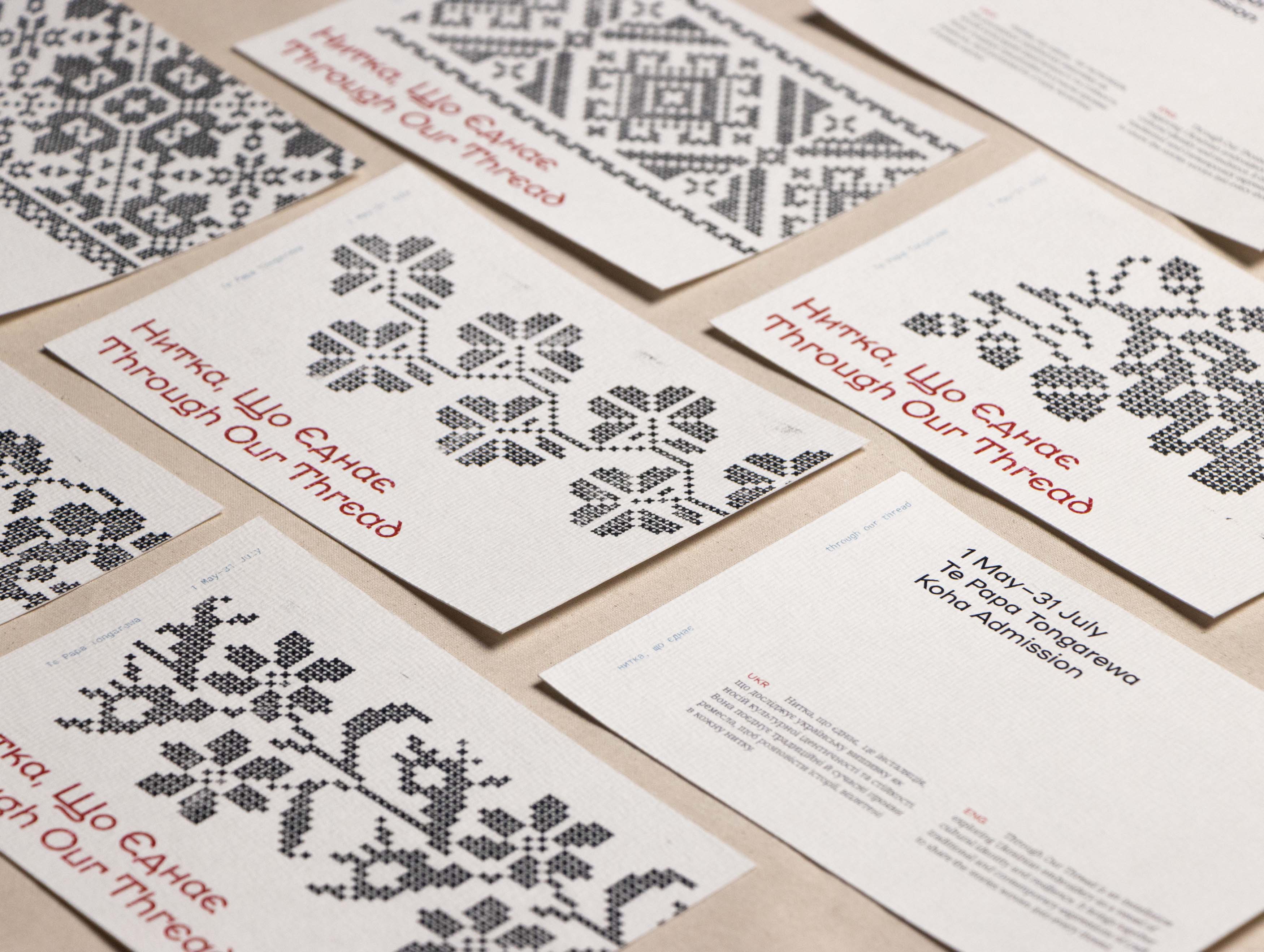 Promotional postcards featuring illustrations adapted from Ukrainian embroidery patterns.