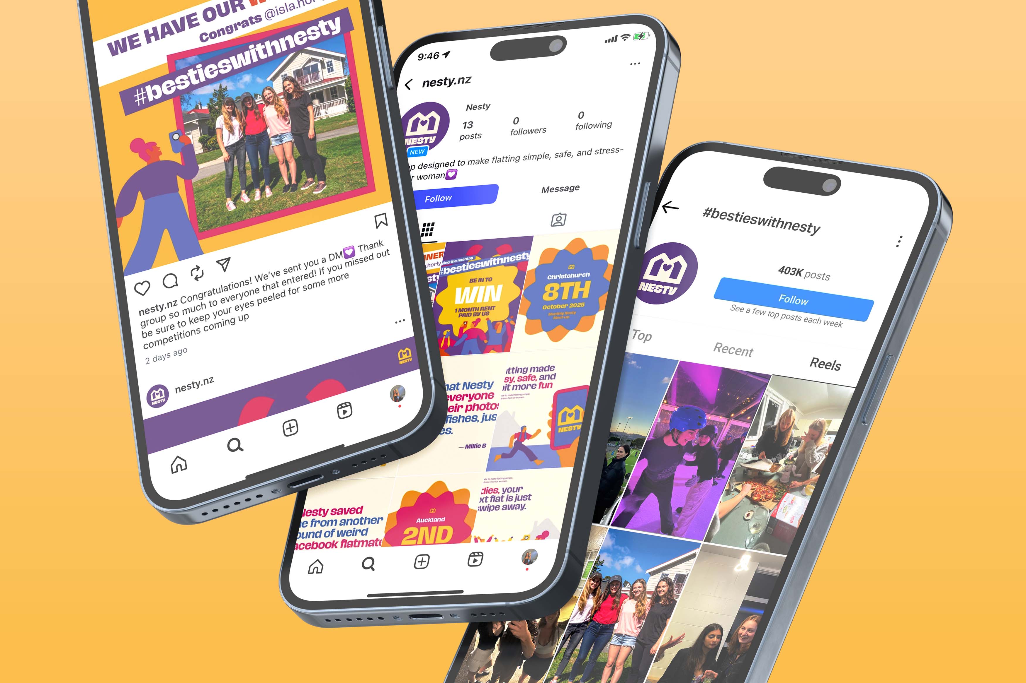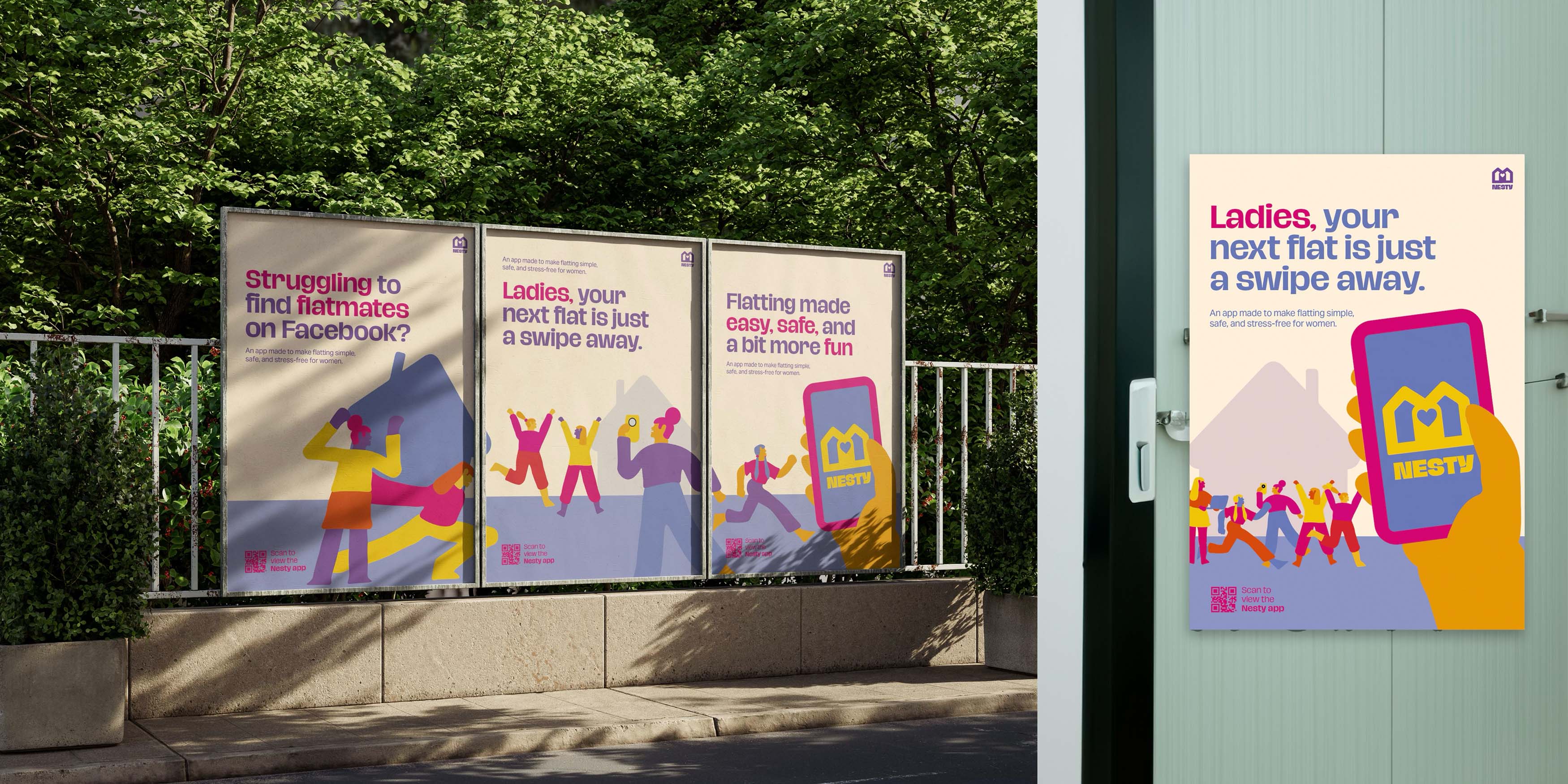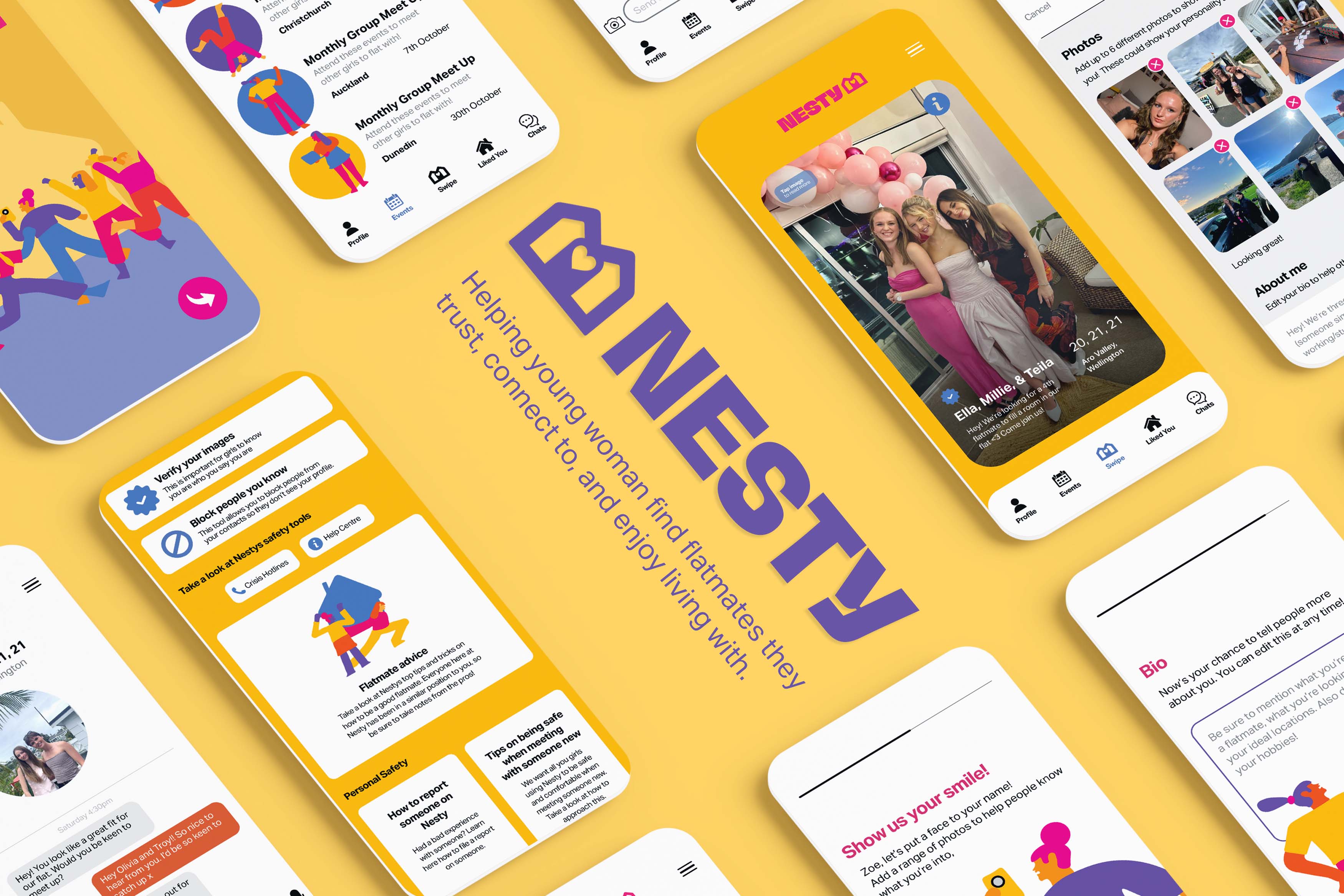 Nesty is a flatting app that helps young women find safe, like-minded flatmates through a fun swipe-based matching system. The idea came from seeing/personally experiencing how stressful and impersonal finding flatmates can be, especially on Facebook. Built on the belief that women thrive on connection, Nesty explores how thoughtful design can create safer, more supportive, and friendship-driven flatting experiences.